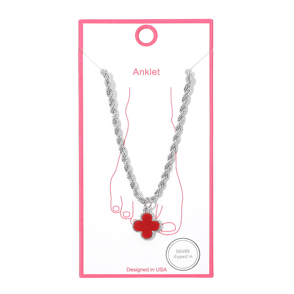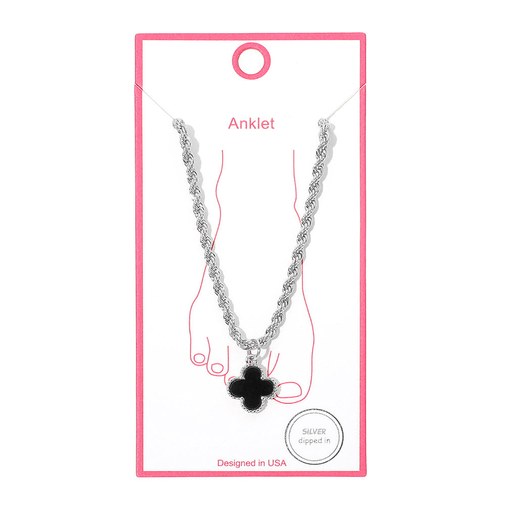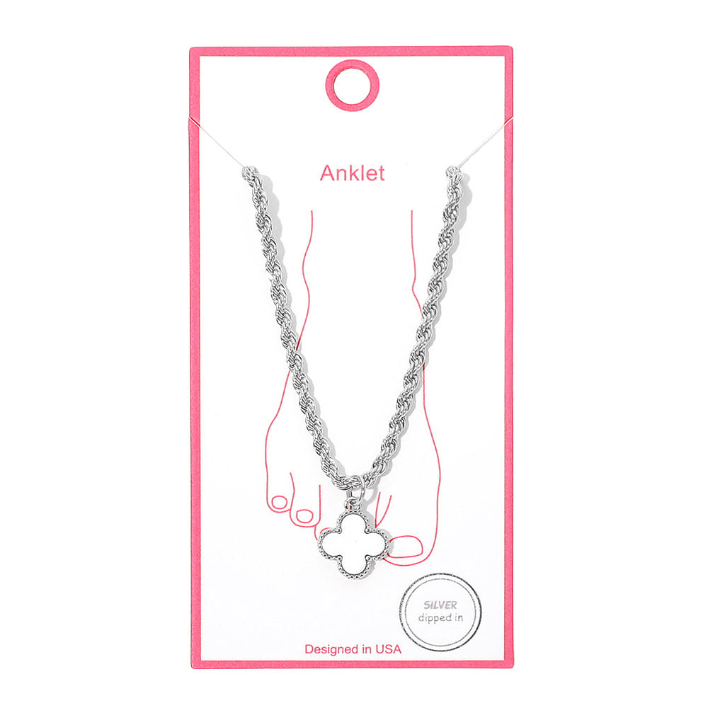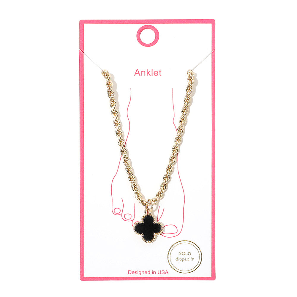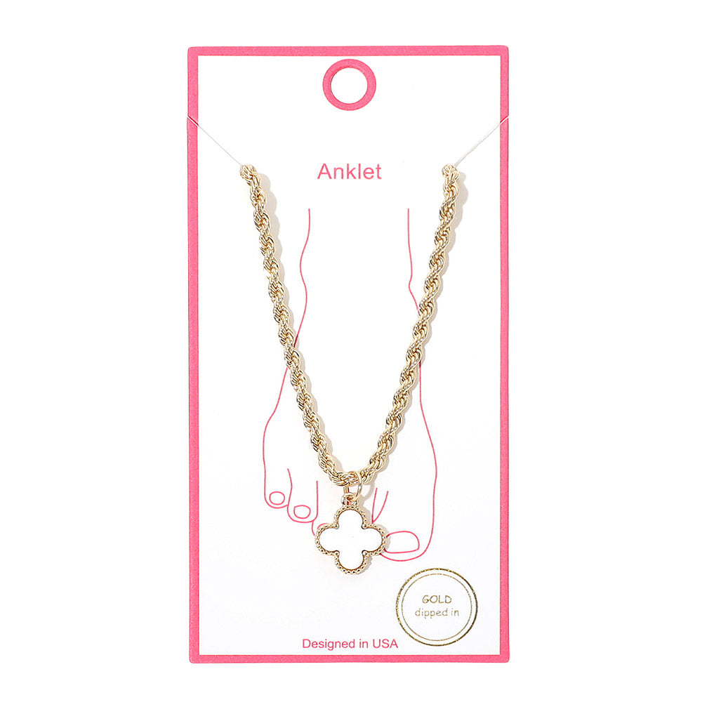Delicate yet eye-catching, this Gold Dipped Quatrefoil Charm Rope Chain Anklet features a classic rope chain paired with a charming quatrefoil accent. The textured chain adds dimension while the charm brings a subtle, stylish detail. Perfect for everyday wear, beach days, or dressing up your favorite sandals, this anklet adds just the right touch of shine.