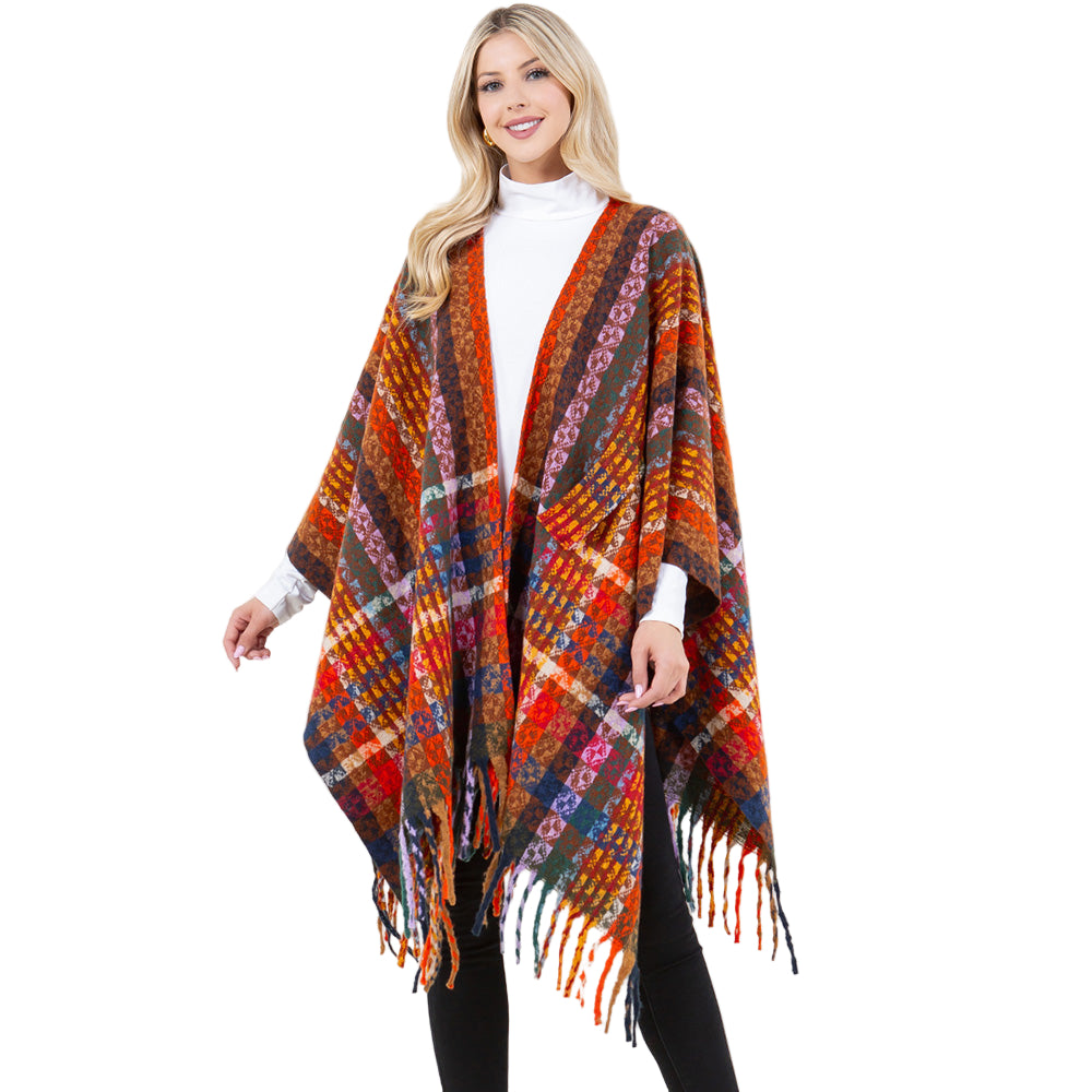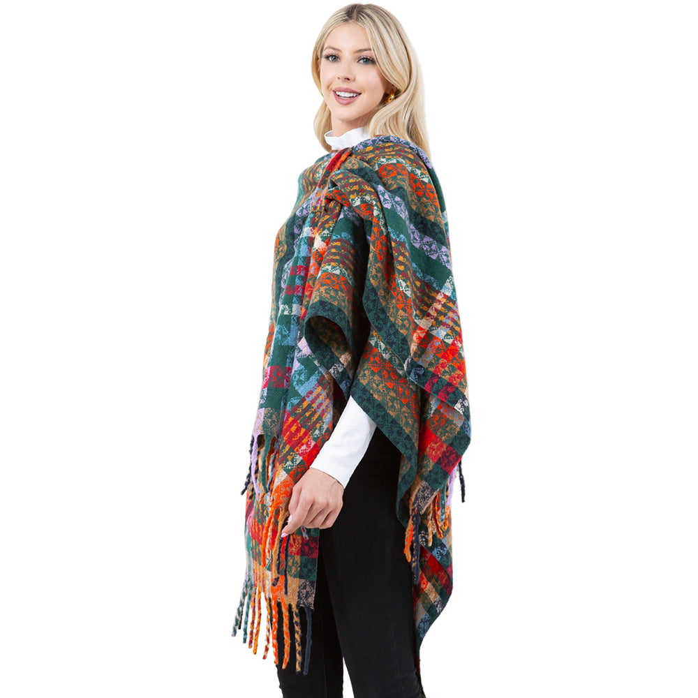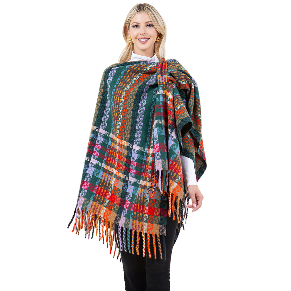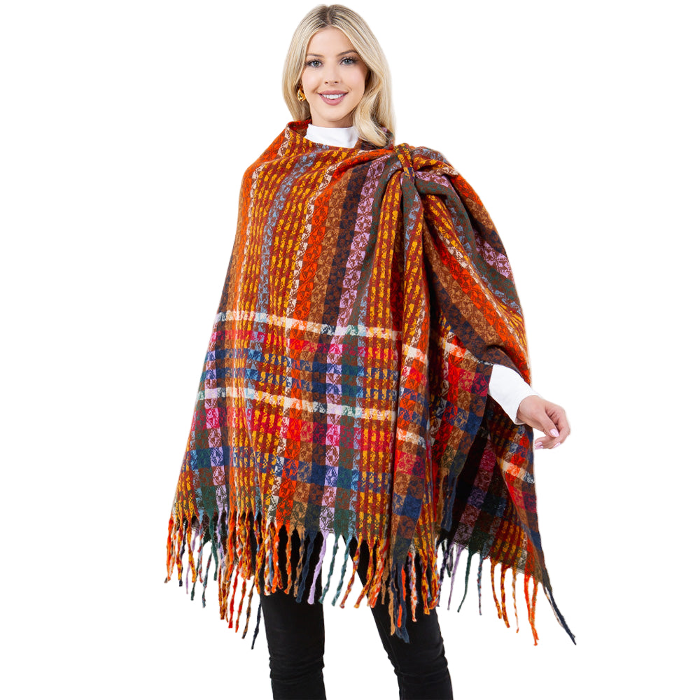 Cozy plaid fringe poncho wrap shawl featuring beautiful bright colors that bring a cheerful touch to any outfit. The soft, lightweight fabric drapes comfortably for easy layering. Finished with fringe detailing for a classic seasonal look.
