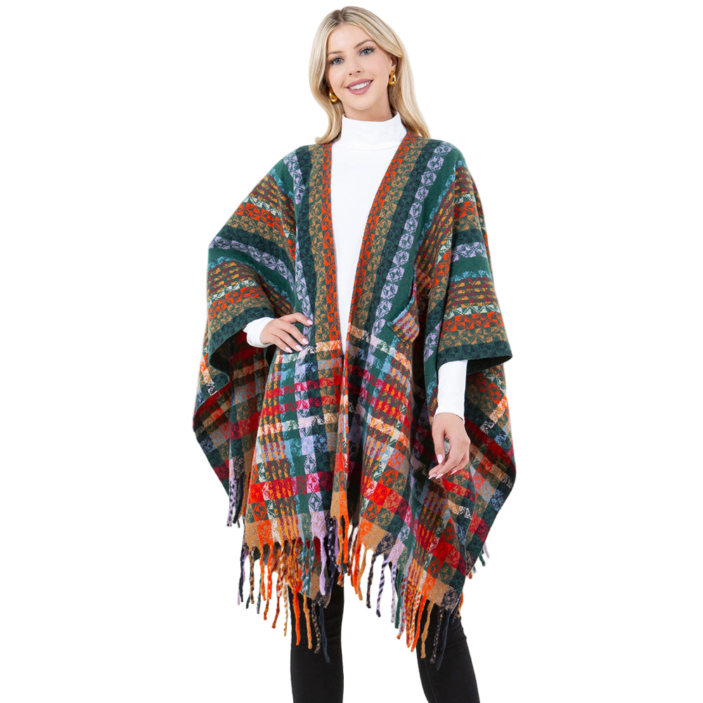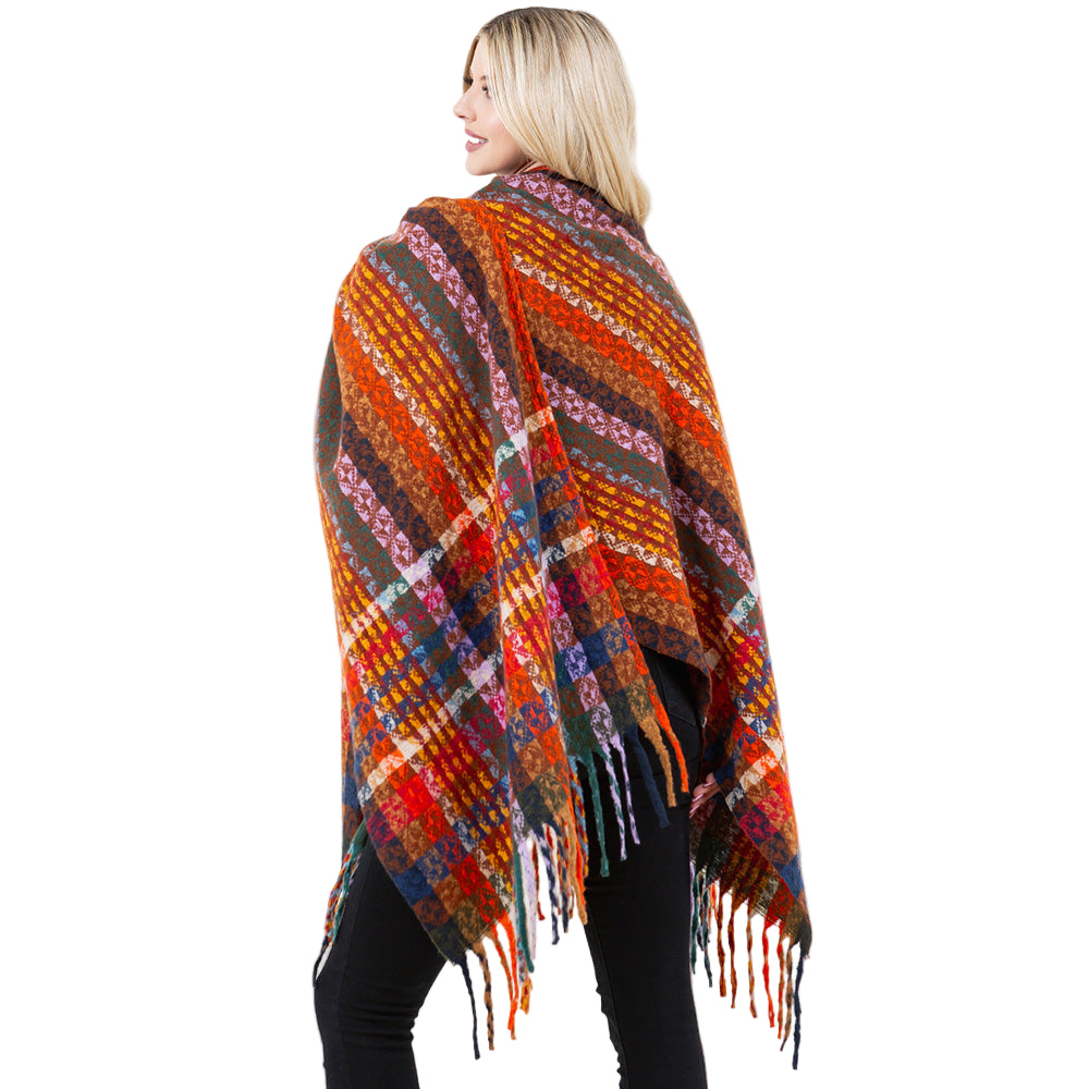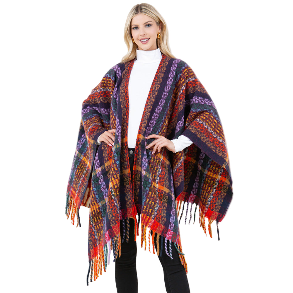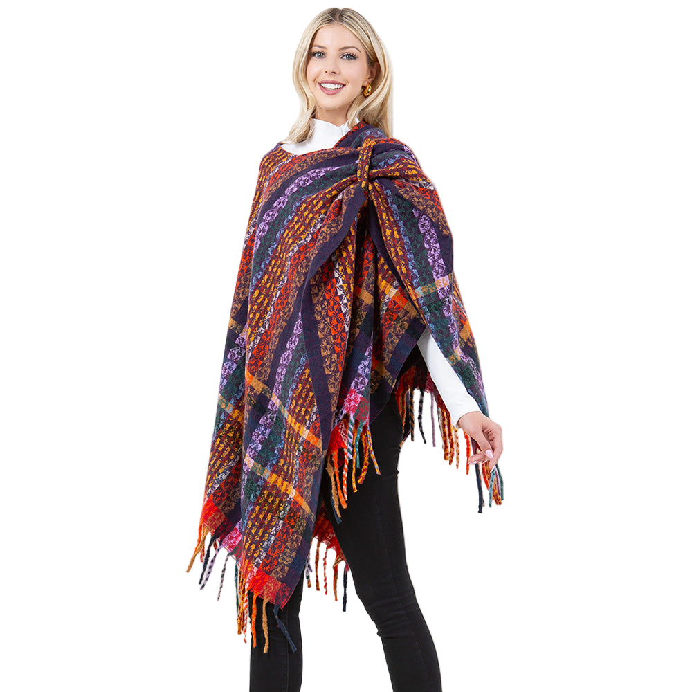 Cozy plaid fringe poncho wrap shawl featuring beautiful bright colors that bring a cheerful touch to any outfit. The soft, lightweight fabric drapes comfortably for easy layering. Finished with fringe detailing for a classic seasonal look.
