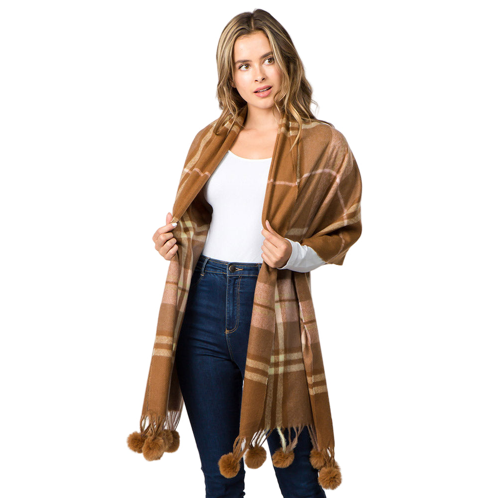 Stay cozy in style with this plaid scarf featuring soft faux fur pom pom tassels. Warm, lightweight, and easy to layer, it adds a playful and chic touch to any winter outfit.