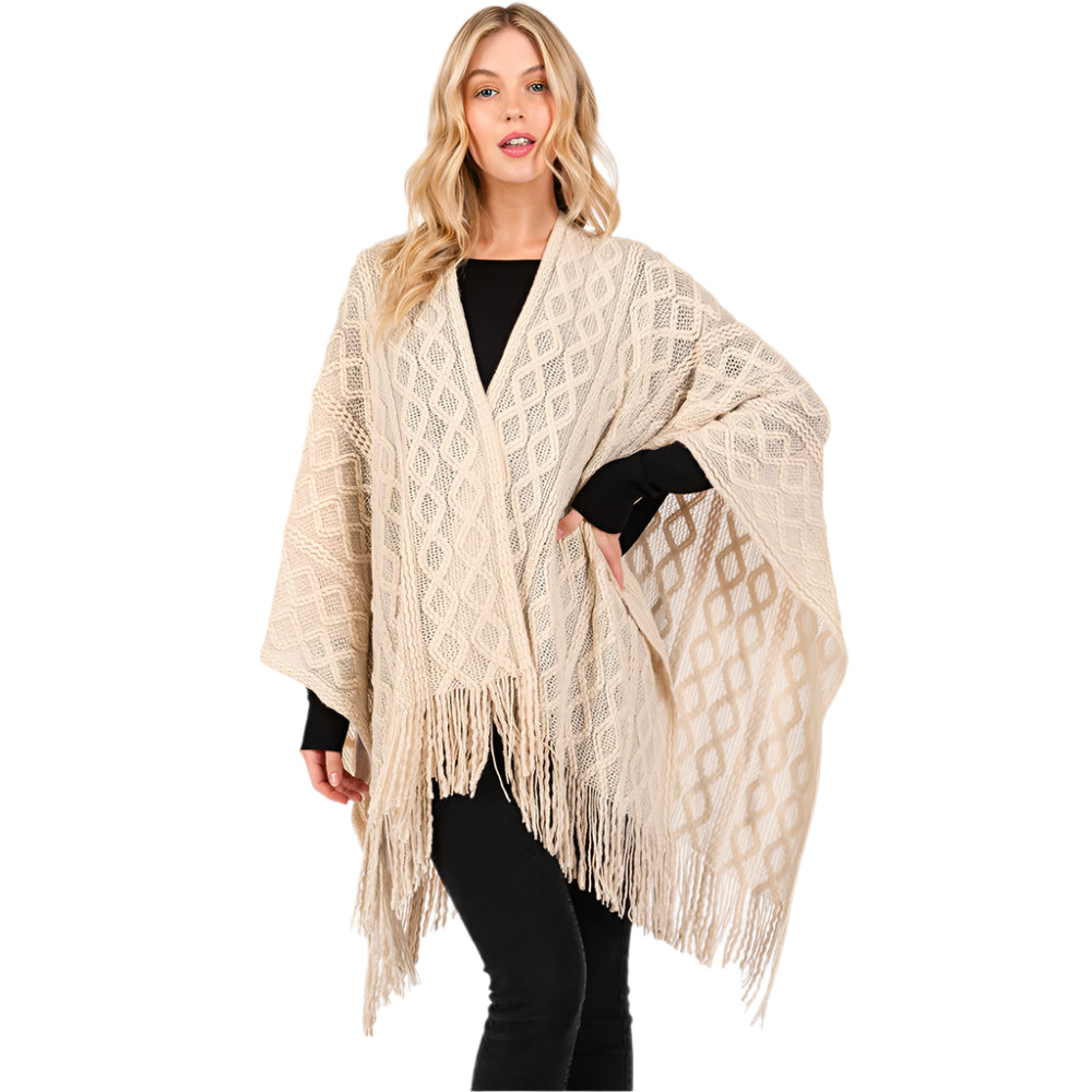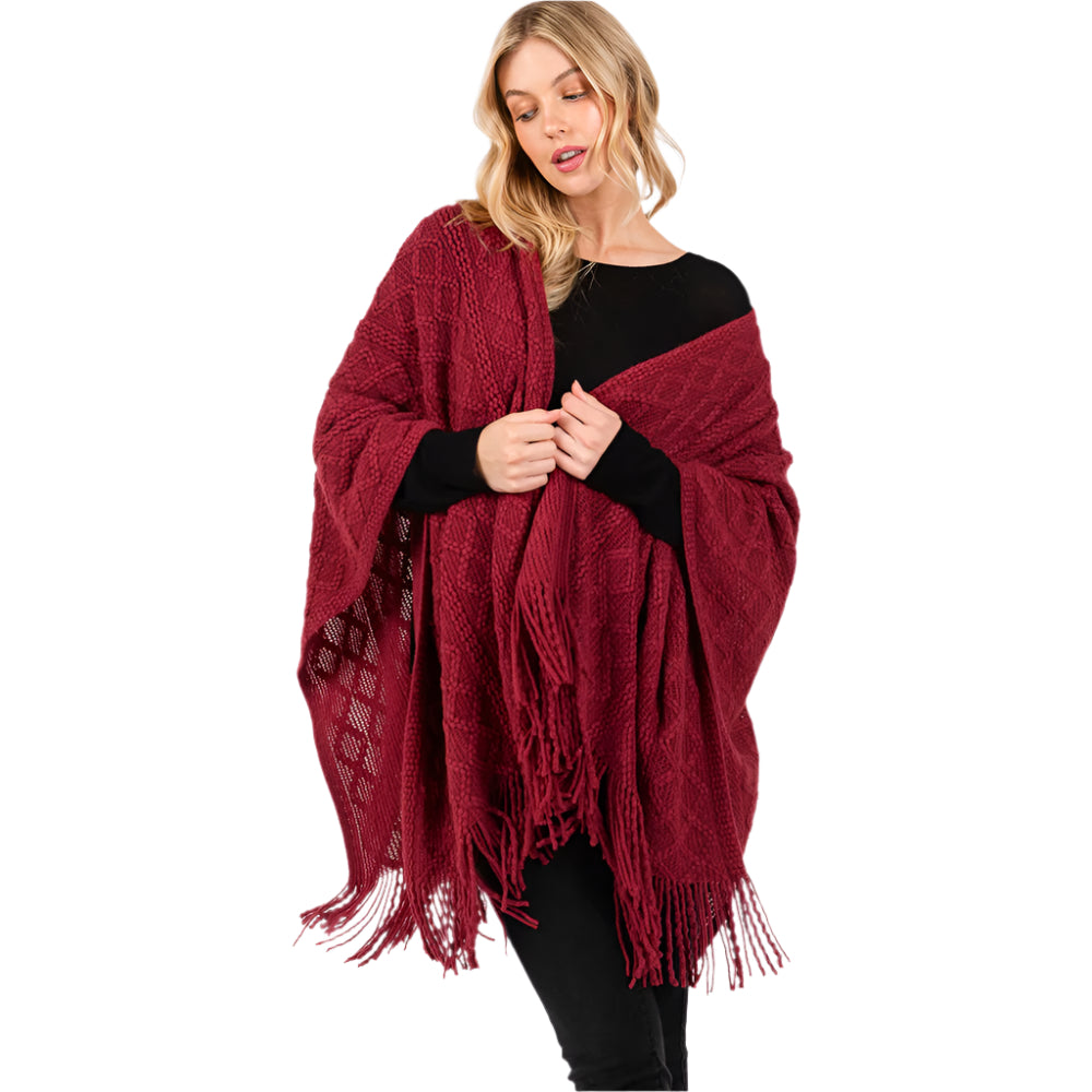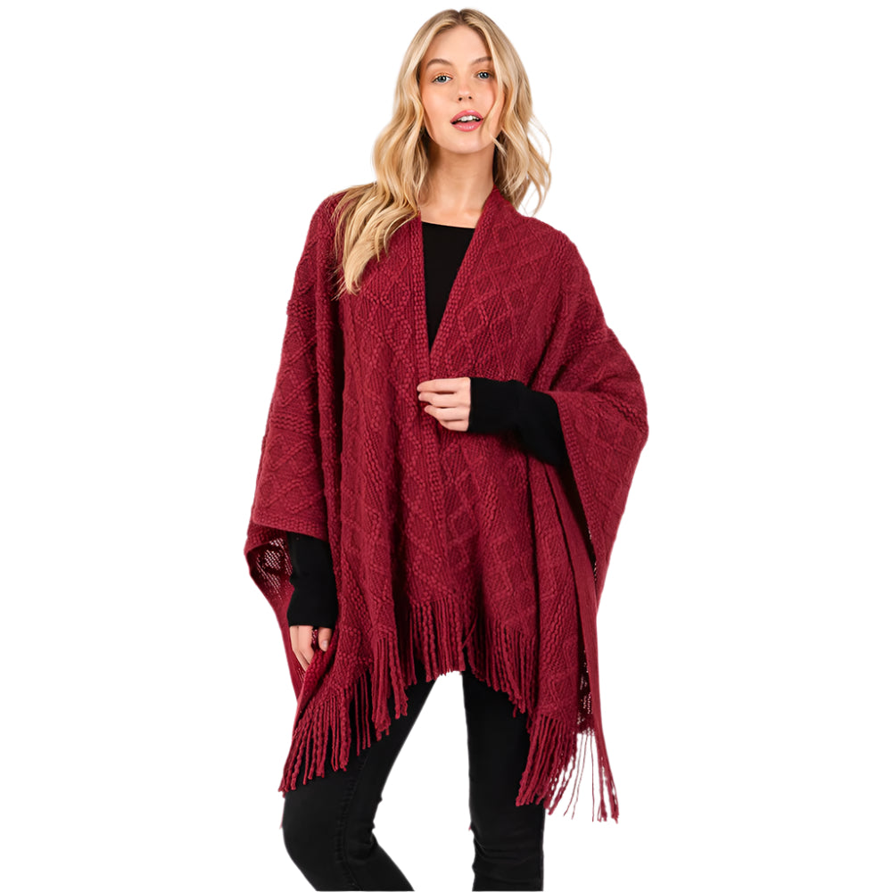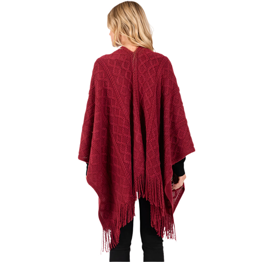 Cozy up in style with this diamond pattern knit ruana, finished with soft tassel edges for extra texture and movement. Easy to layer and perfect for cool days, this relaxed wrap is available in burgundy, beige, and black—versatile shades for any wardrobe.