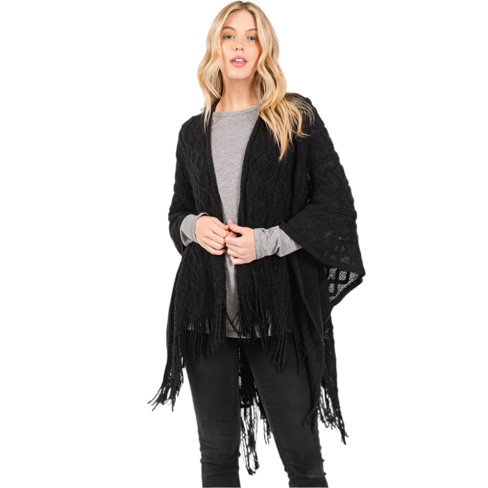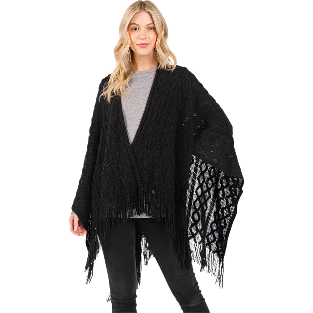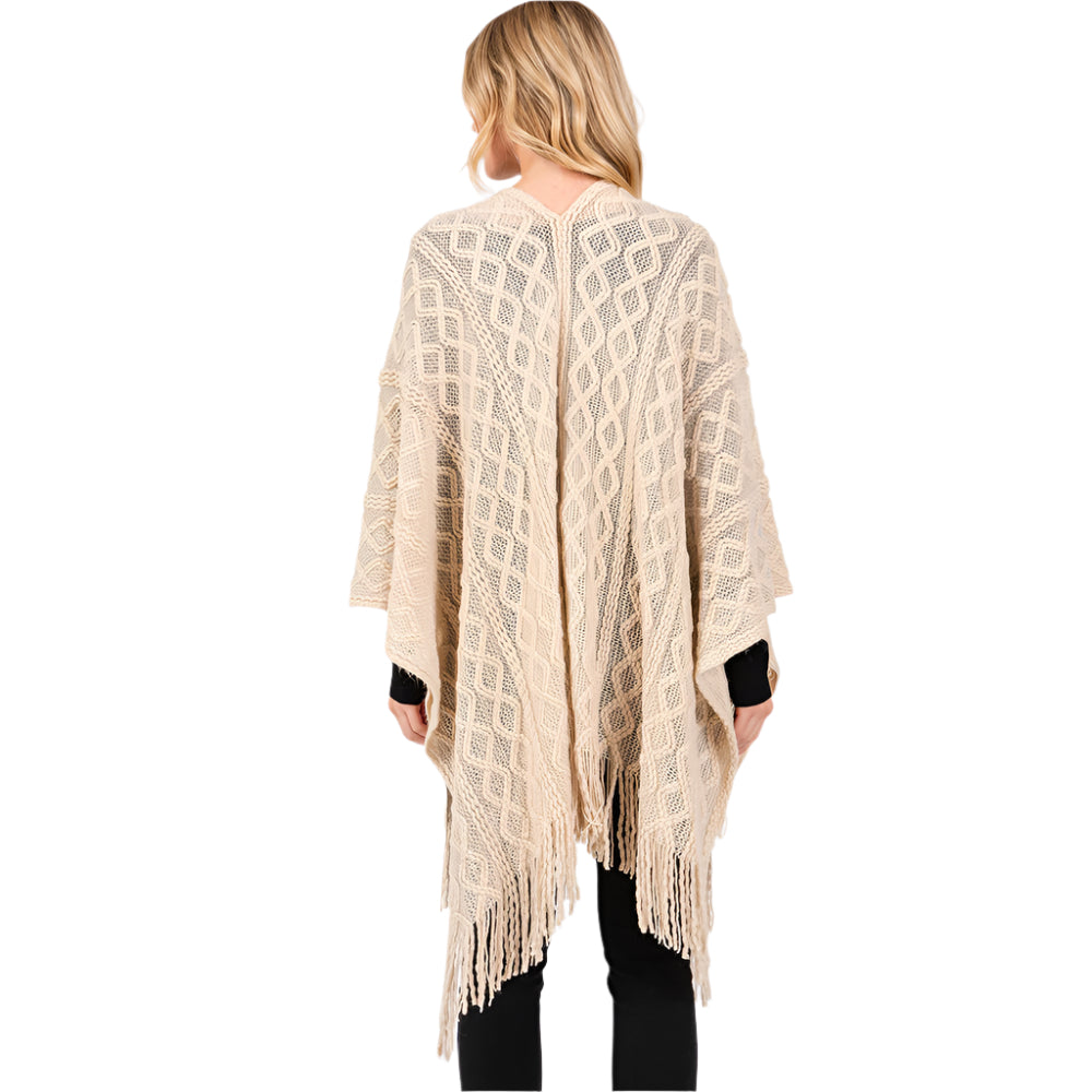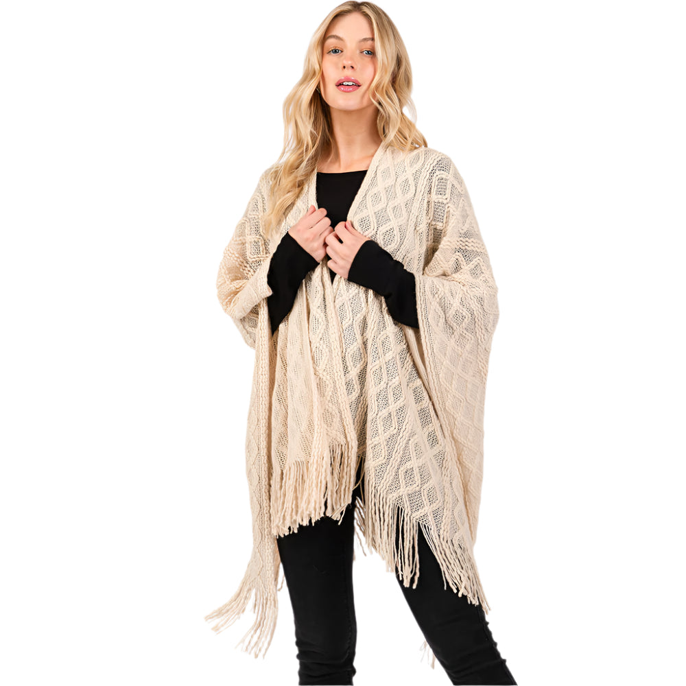 Cozy up in style with this diamond pattern knit ruana, finished with soft tassel edges for extra texture and movement. Easy to layer and perfect for cool days, this relaxed wrap is available in burgundy, beige, and black—versatile shades for any wardrobe.
