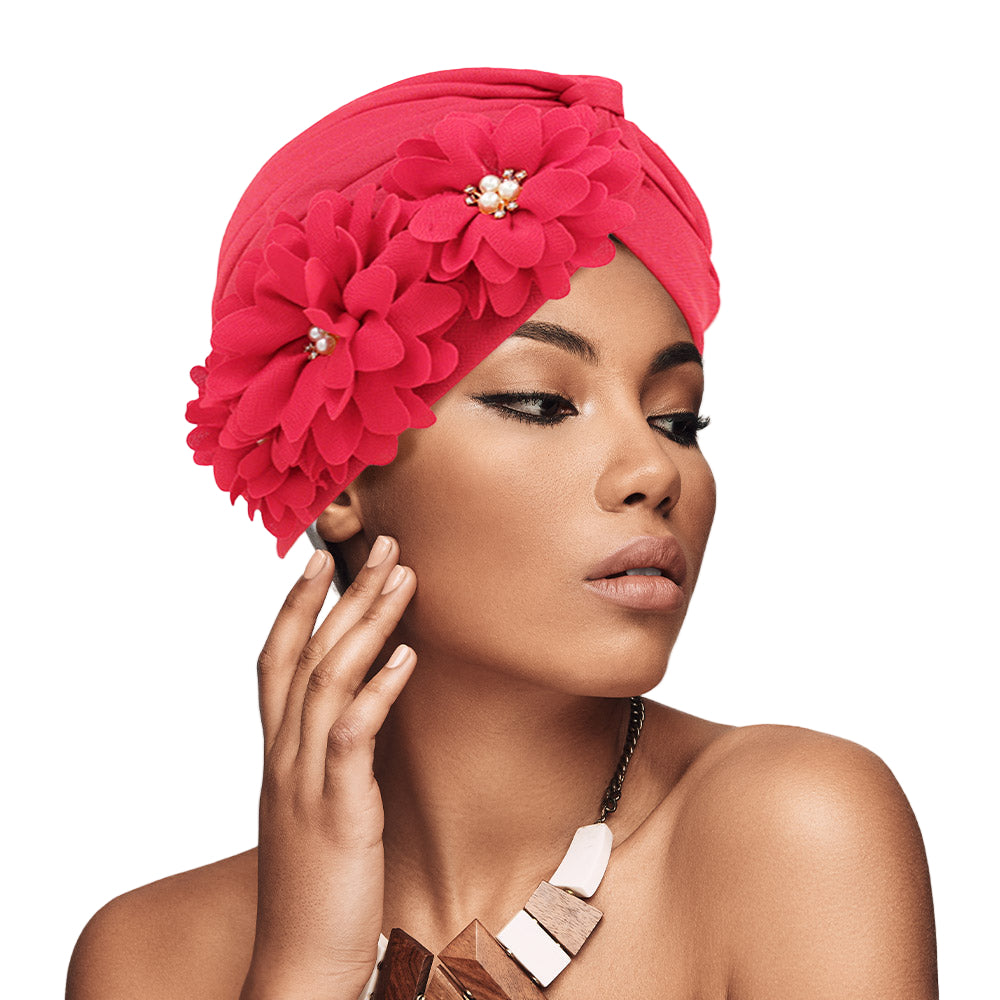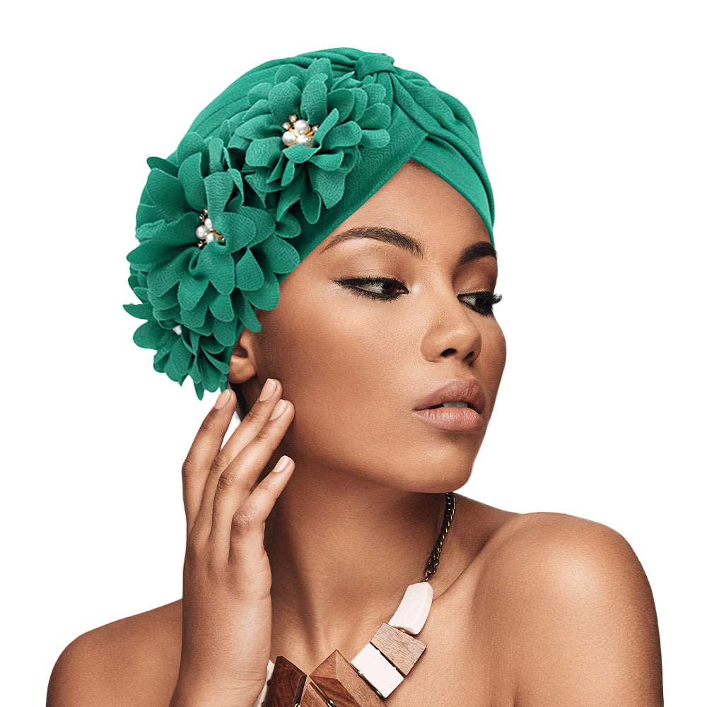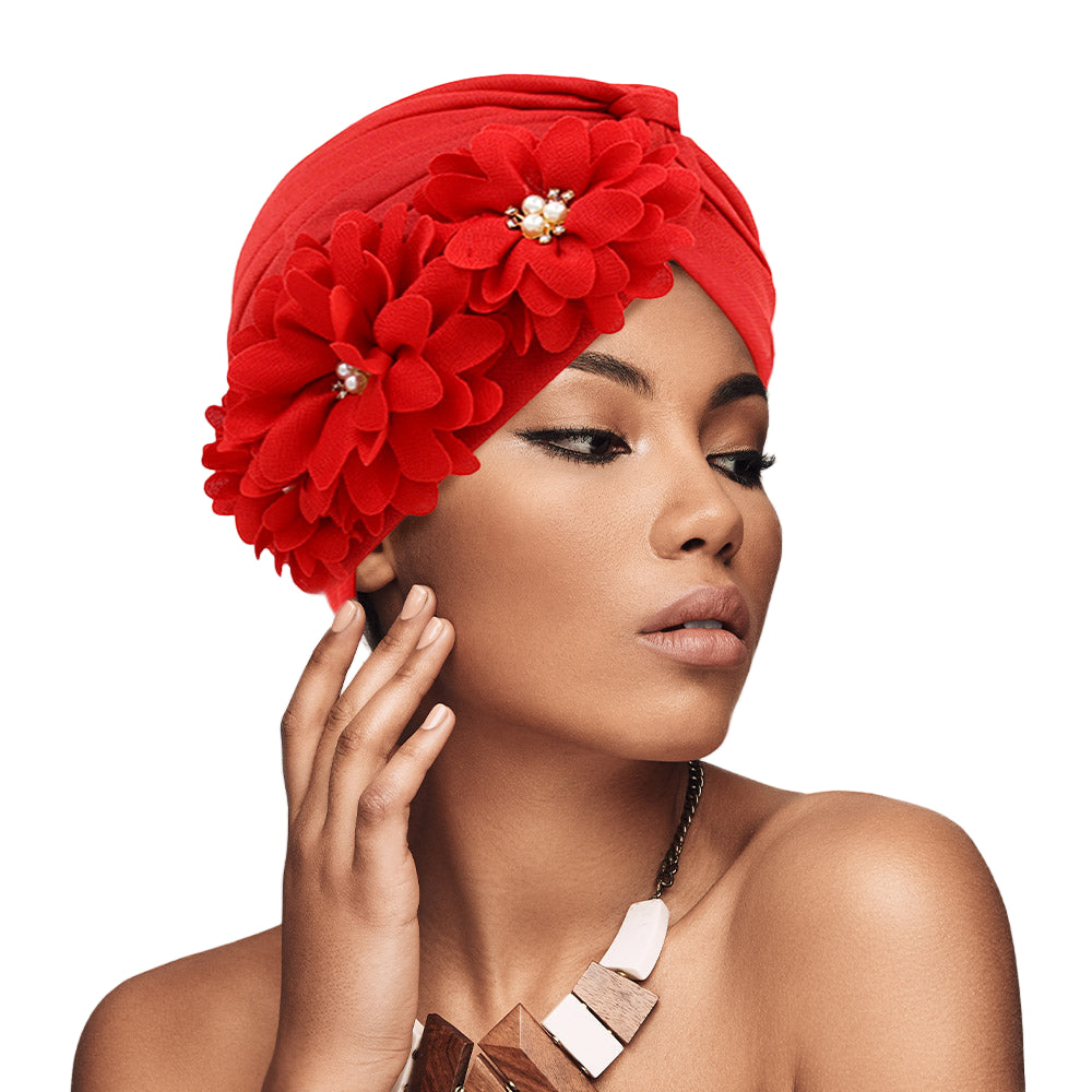 Elegant turban headwrap featuring layered floral appliqué with pearl accents. Its sculpted shape and stretch-fit design offer a chic, comfortable look perfect for fashion styling, special events, or adding a statement touch to everyday outfits.