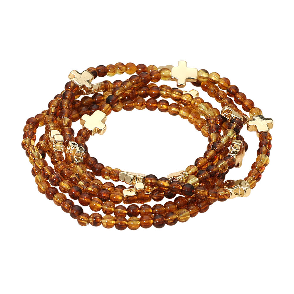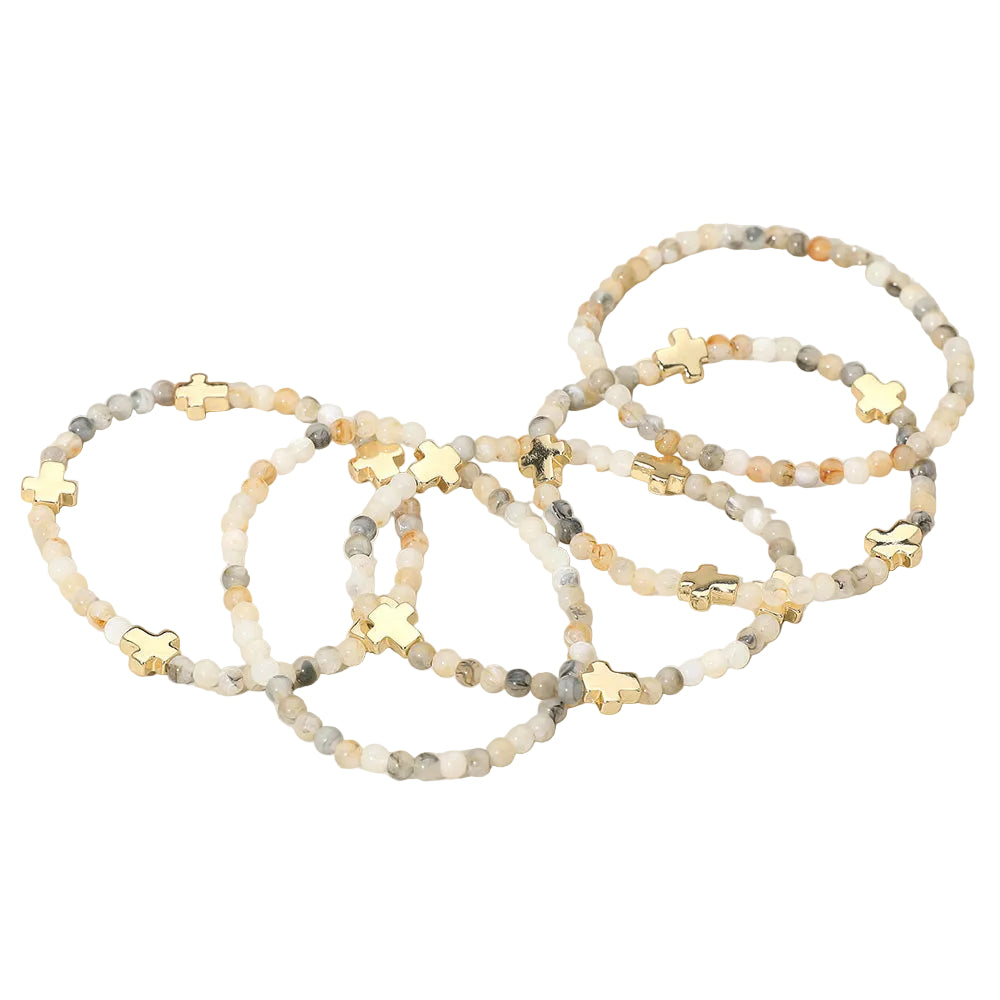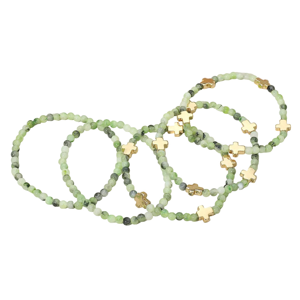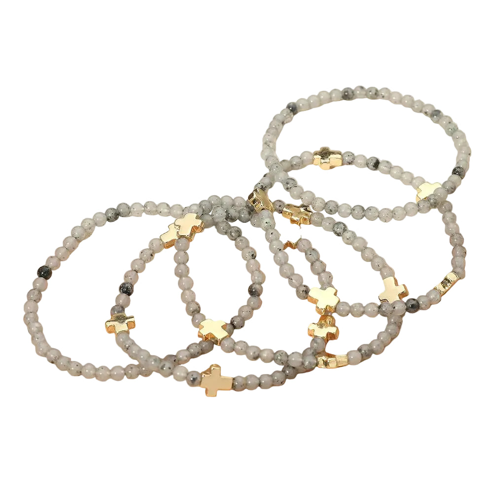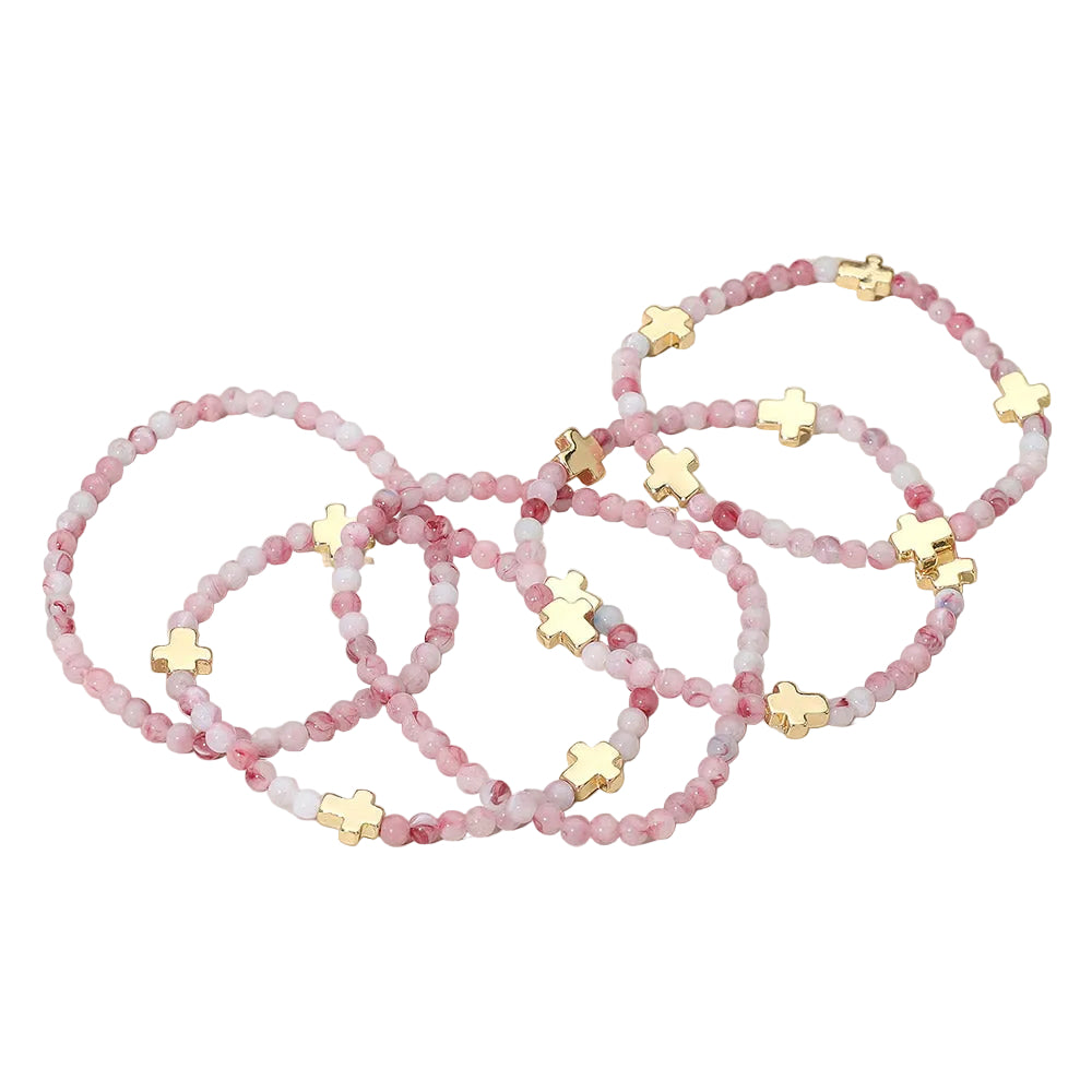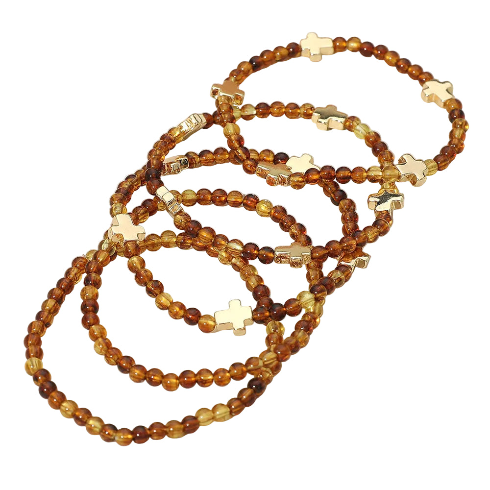 A set of five stretch bracelets featuring faceted beads and metal cross charms. Comfortable and easy to wear, perfect for stacking or layering to add a stylish, meaningful touch to any outfit.