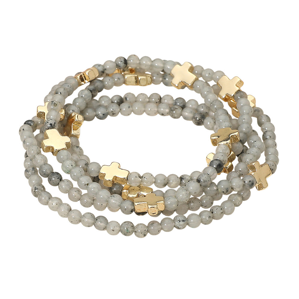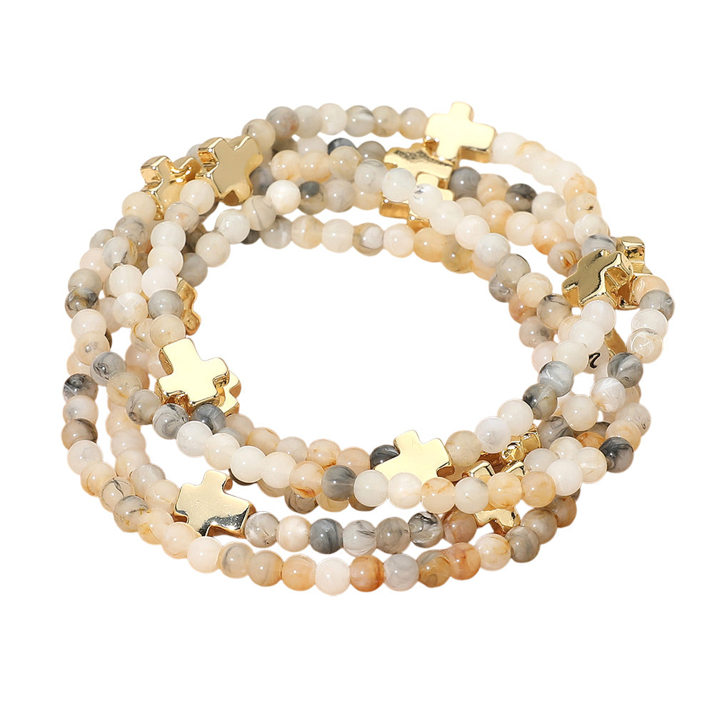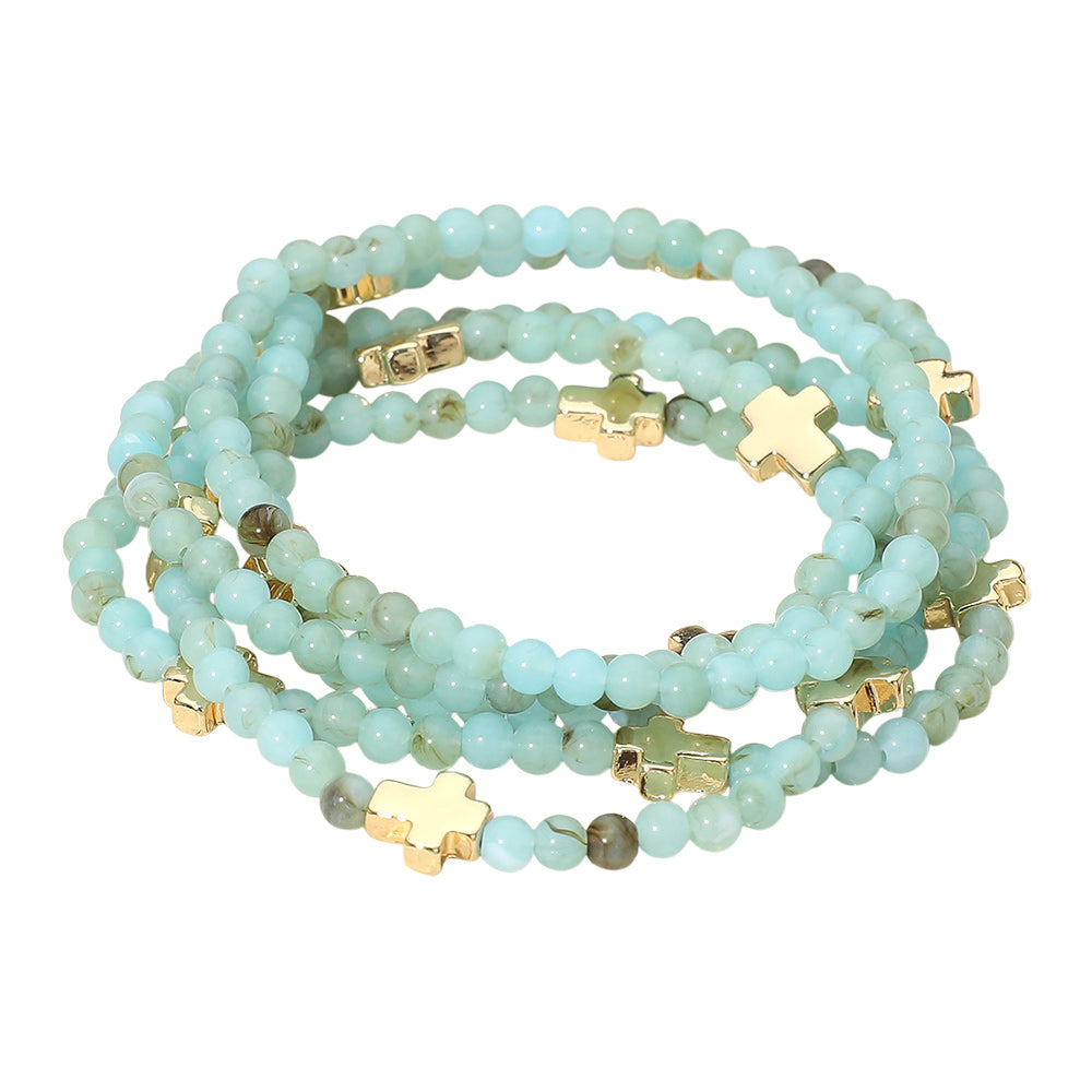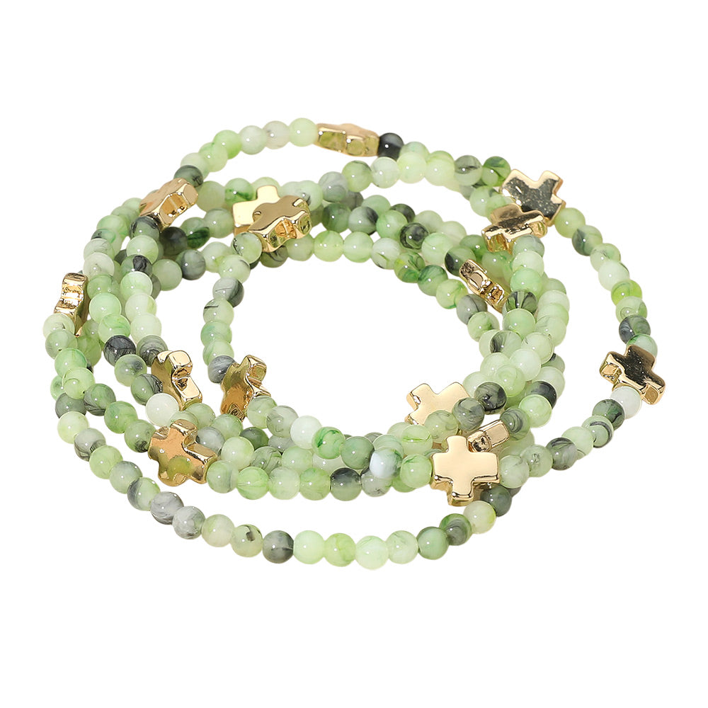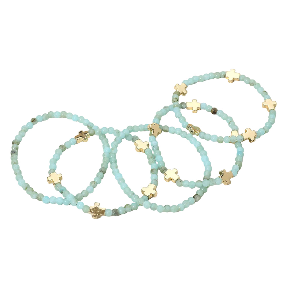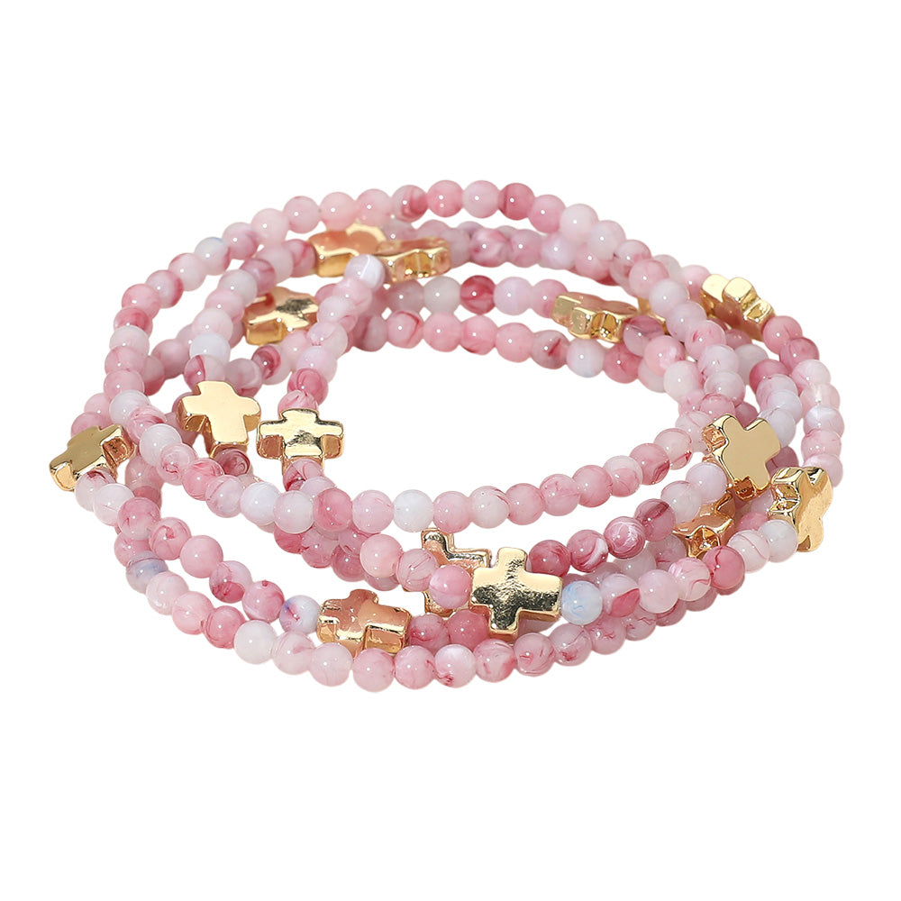 A set of five stretch bracelets featuring faceted beads and metal cross charms. Comfortable and easy to wear, perfect for stacking or layering to add a stylish, meaningful touch to any outfit.