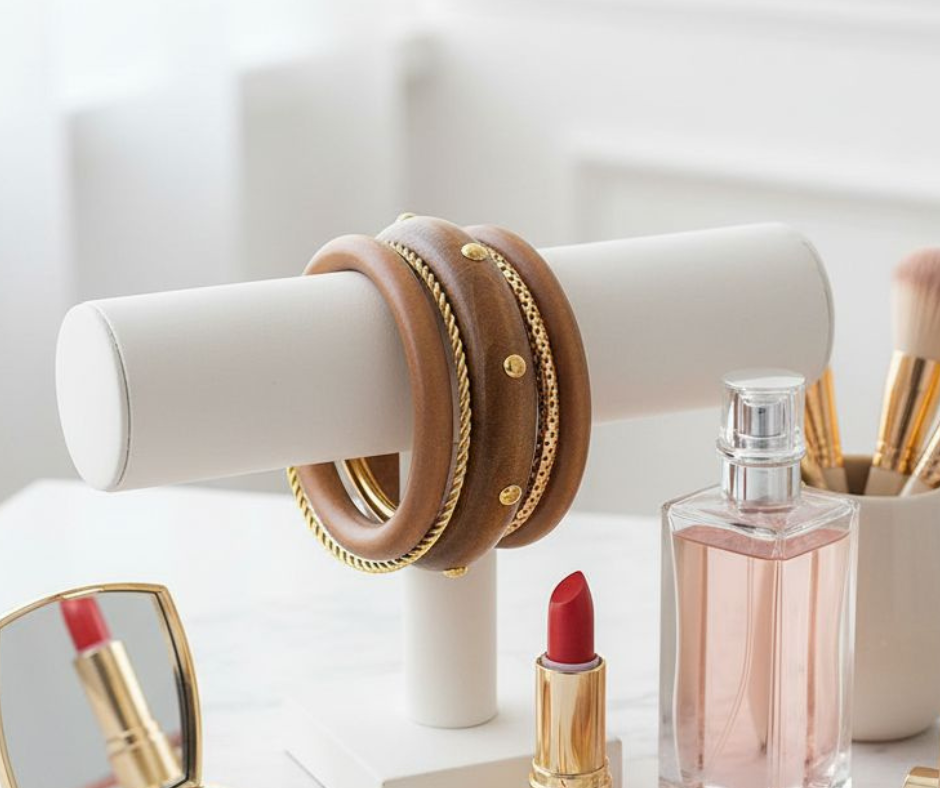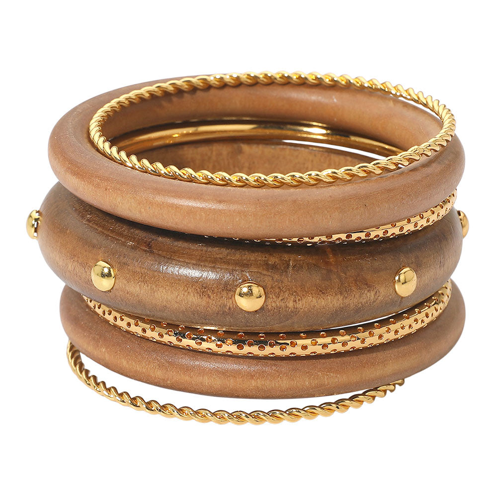 A bold bracelet set featuring a mix of wooden and metal bangles accented with stud details. Designed to be worn together or styled separately, this multi-layered set adds texture and statement style to both casual and dressy looks.