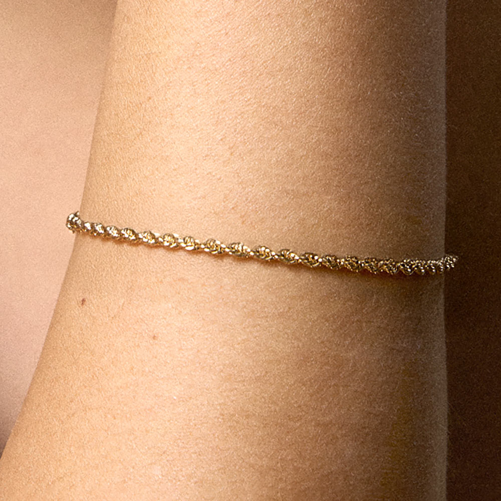 An 18K gold-filled rope chain bracelet featuring a classic twisted design with a polished finish. Timeless and versatile, it’s perfect for everyday wear, easy layering, or wearing solo for a clean, refined look.