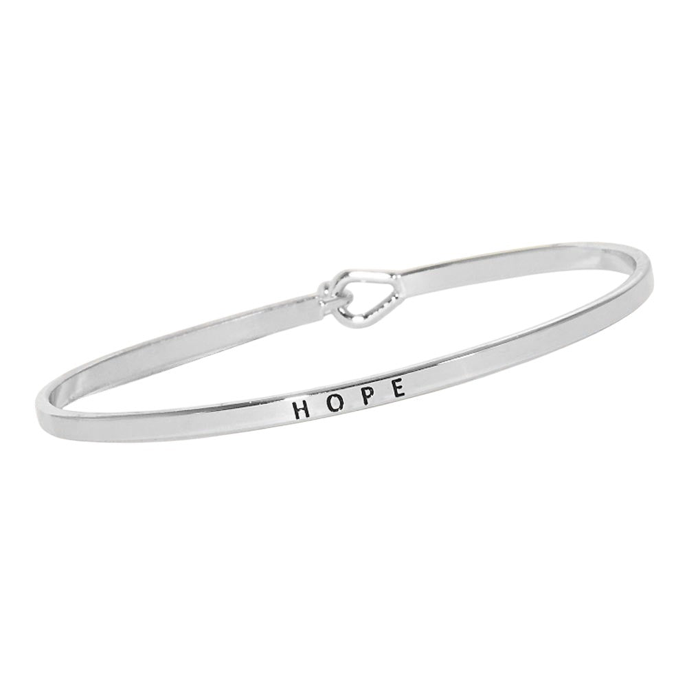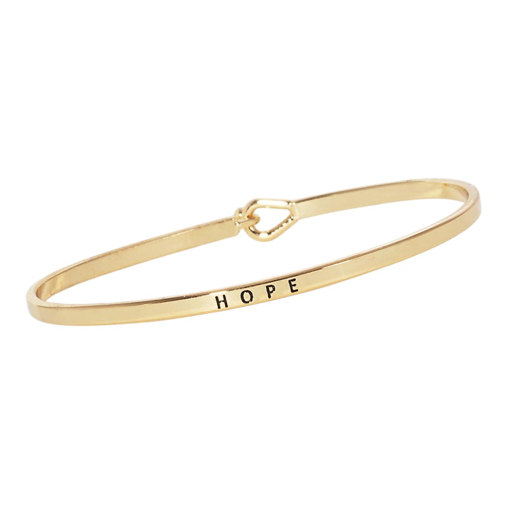 Keep a message of encouragement close with this thin brass metal bangle engraved with the word "HOPE." A minimalist accessory that adds meaning to your everyday style, whether worn alone or stacked.