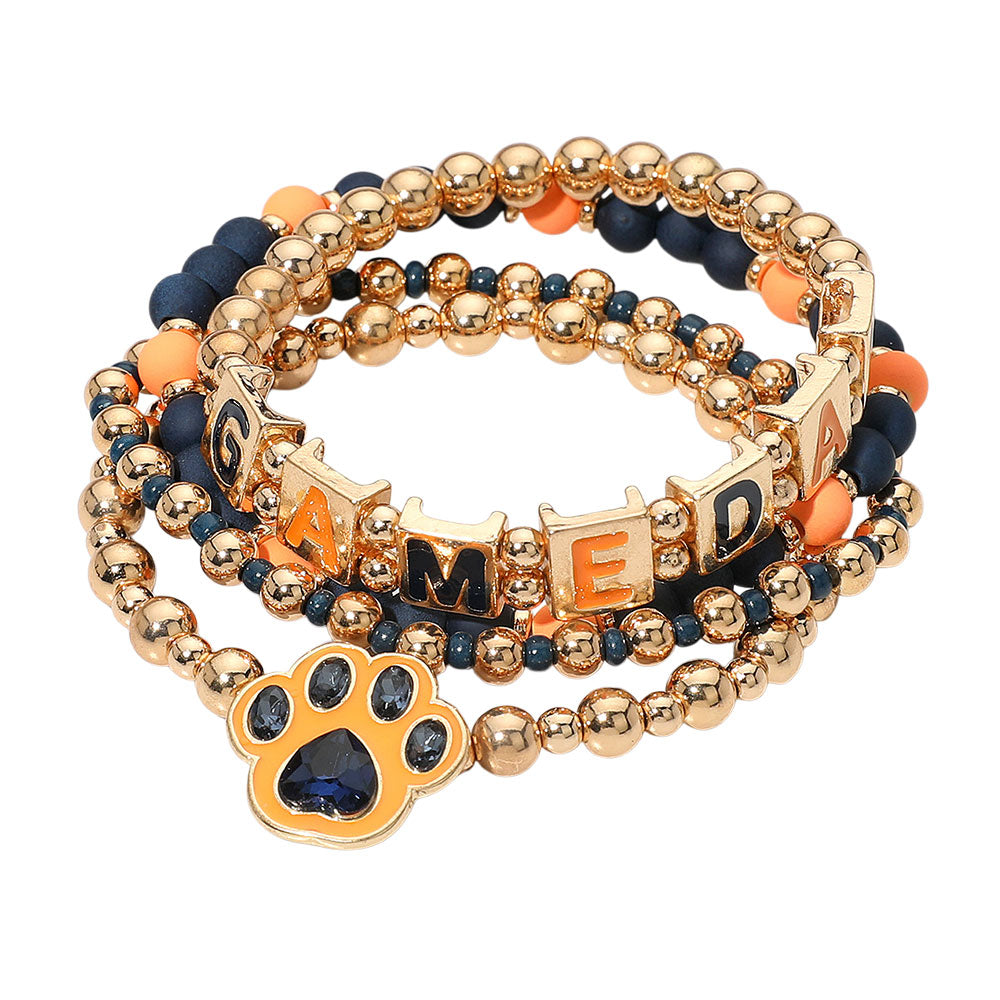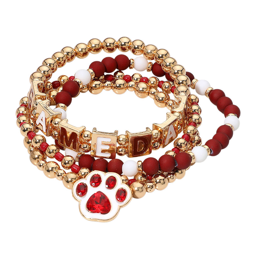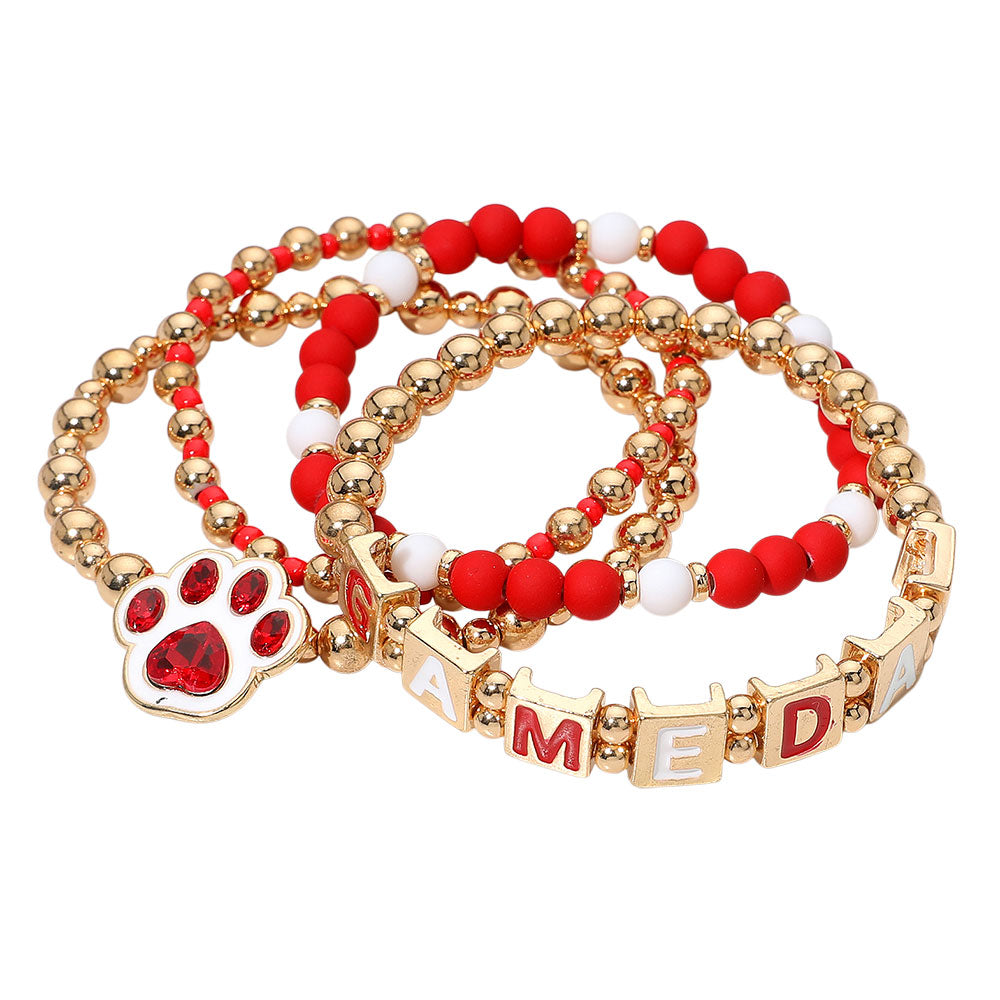 Show your team spirit with this 4-piece beaded stretch bracelet set featuring playful paw charms and layered bead designs. Perfect for game day or any casual look that needs a sporty touch.