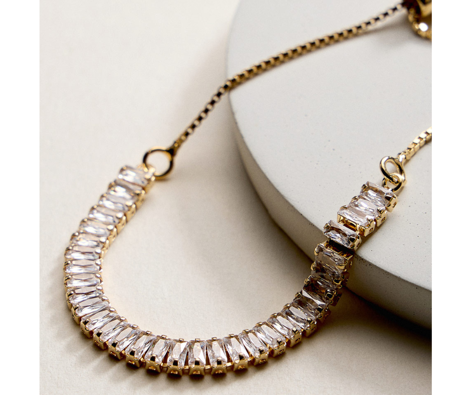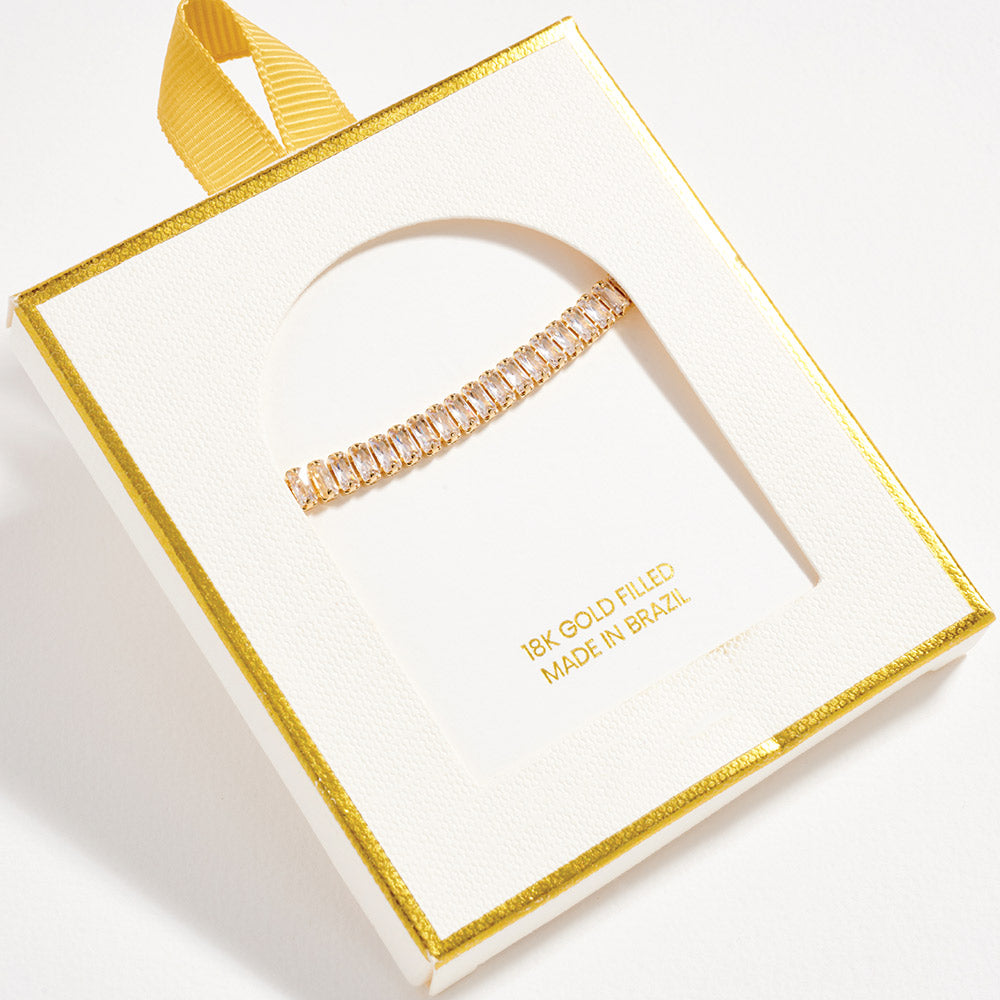 An adjustable cinch pull-tie bracelet featuring linked baguette-cut cubic zirconia stones set in 18K gold-filled metal. Designed with a refined cluster look and a flexible fit, this bracelet adds a polished, modern accent that layers easily or stands out on its own.