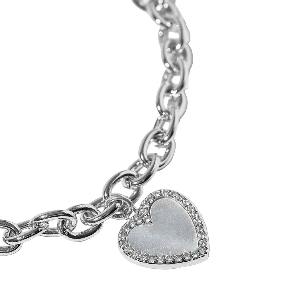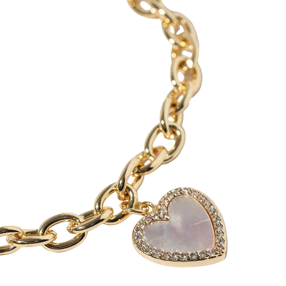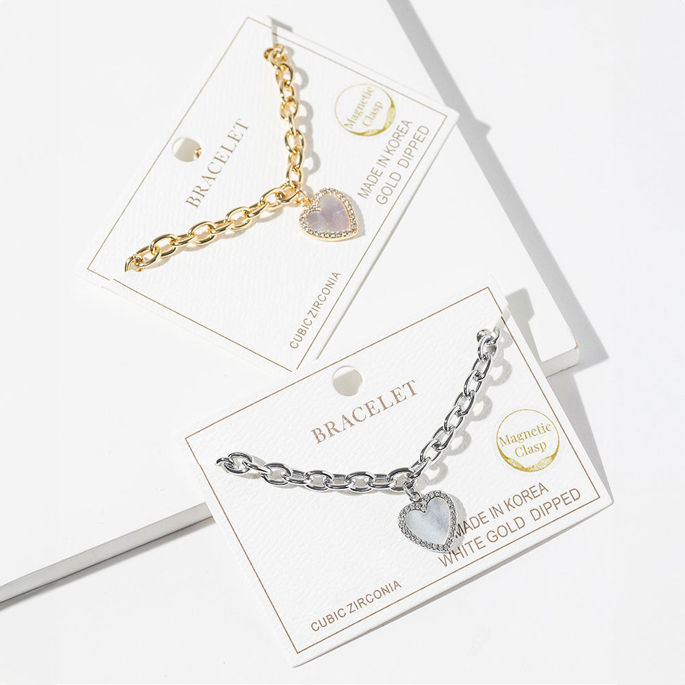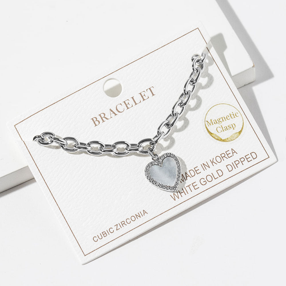 Gold dipped cubic zirconia stone rim mother of pearl heart charm magnetic chain bracelet featuring a soft, luminous center with a subtle touch of sparkle. The magnetic closure offers easy wear while keeping a polished, comfortable fit. A sweet yet refined style perfect for everyday looks.