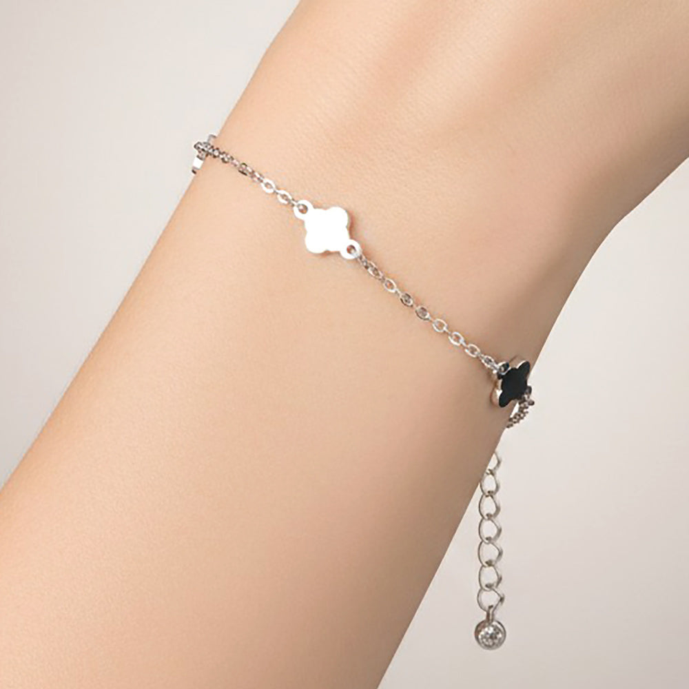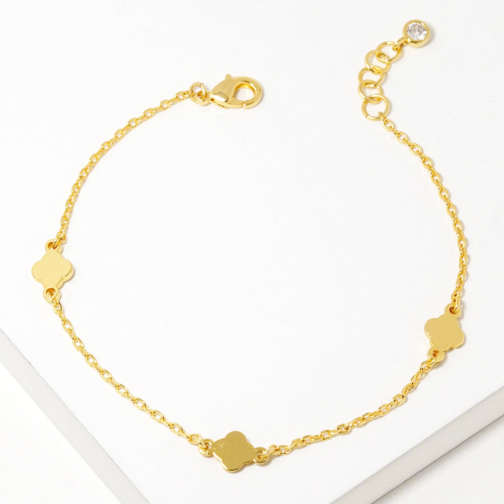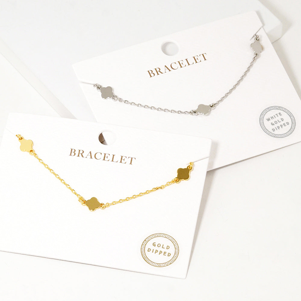 A gold dipped quatrefoil charm station link bracelet featuring delicate, evenly spaced charms for a timeless and polished look. Also available in white gold dipped, this piece adds a subtle yet eye-catching touch to any outfit.