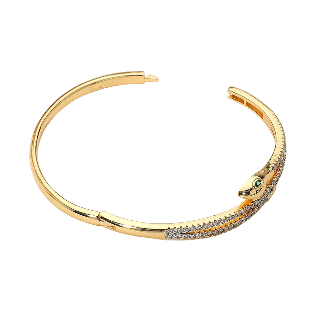 This stainless steel hinged bangle bracelet features a sleek snake-inspired design adorned with sparkling rhinestone pavé. Water resistant and durable, it adds a modern and elegant touch to any outfit. The hinged closure ensures a comfortable and secure fit for everyday wear.