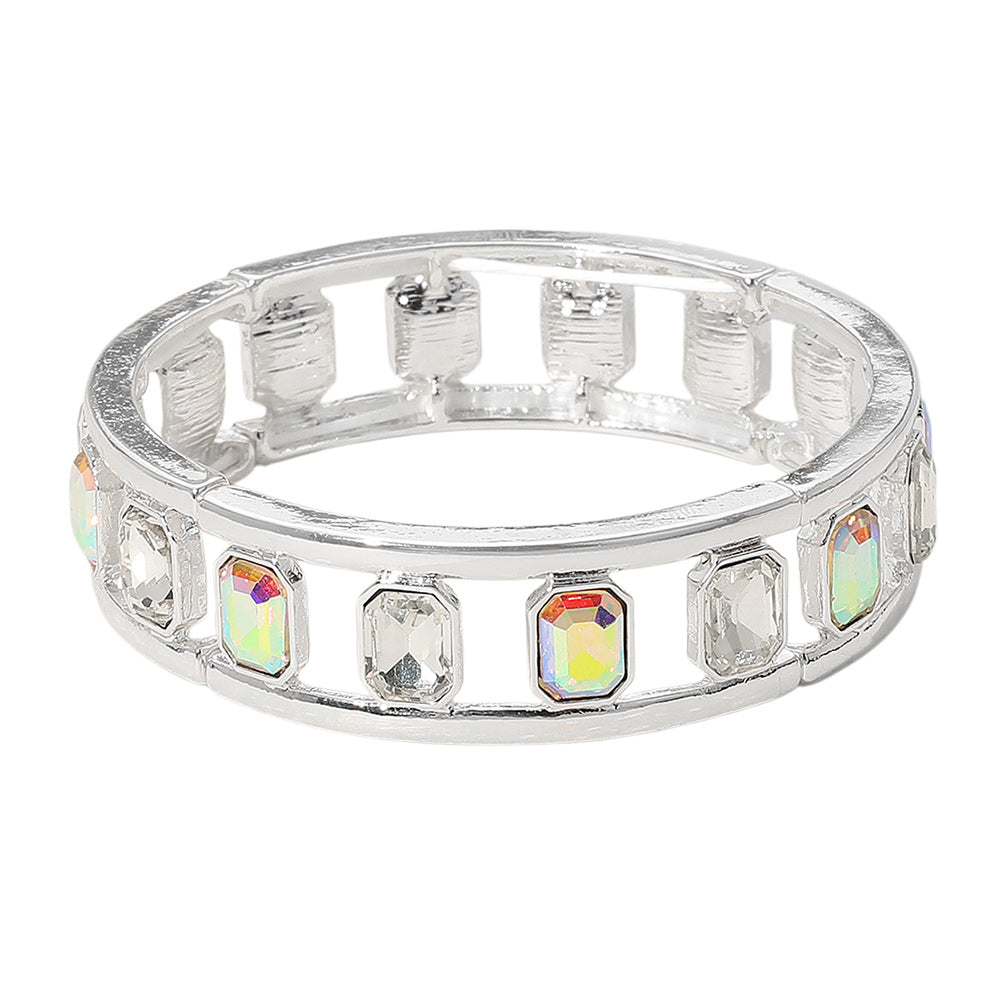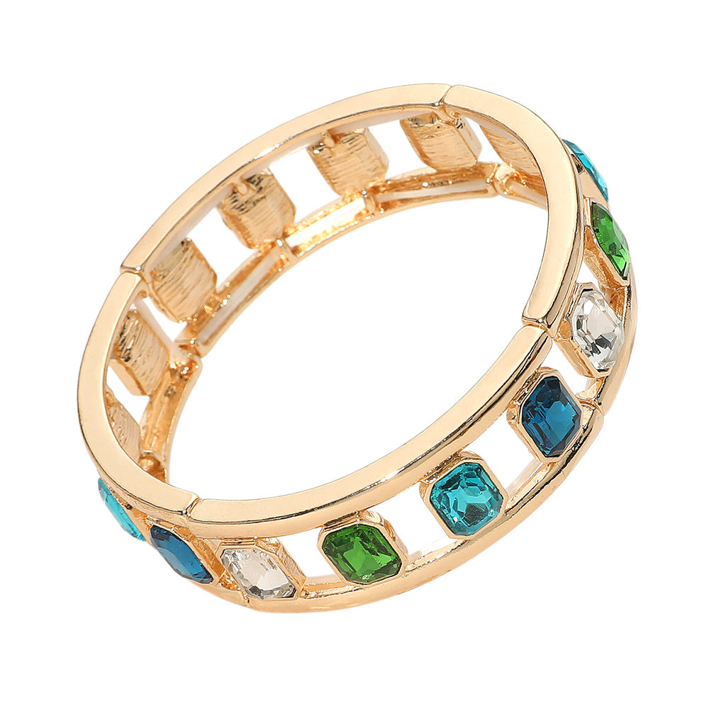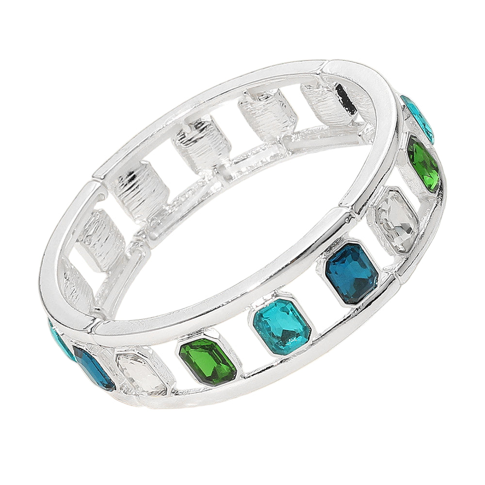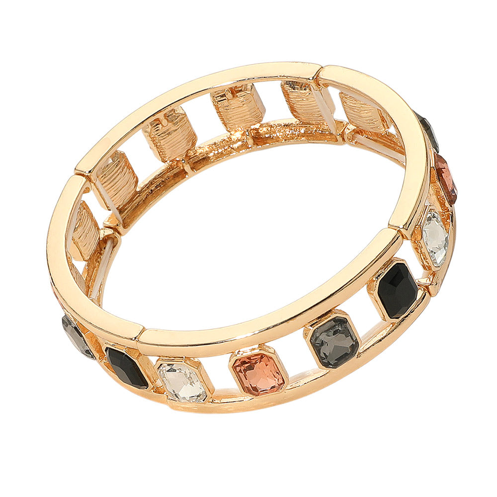 This bracelet features an open frame design adorned with striking emerald-cut stones that add a refined touch. The stretch fit ensures all-day comfort and easy wear, making it a perfect piece for both casual and dressy looks.
