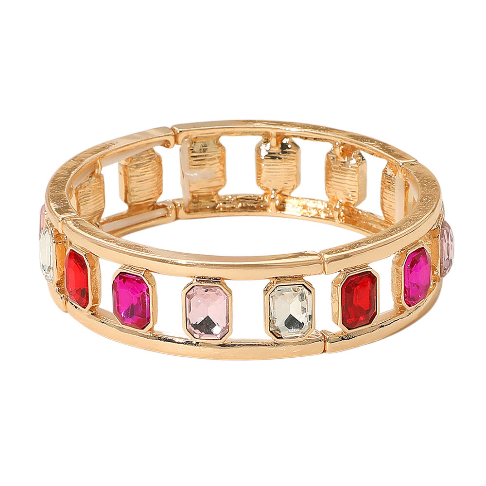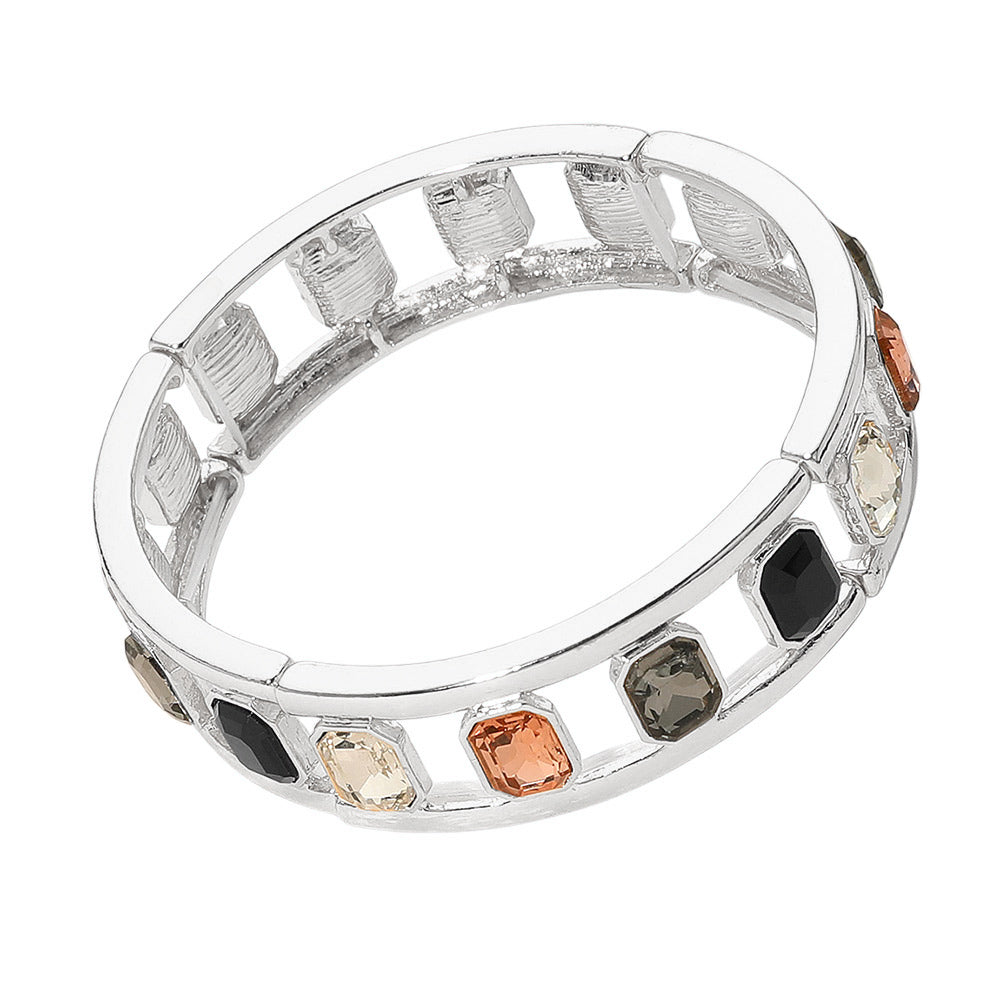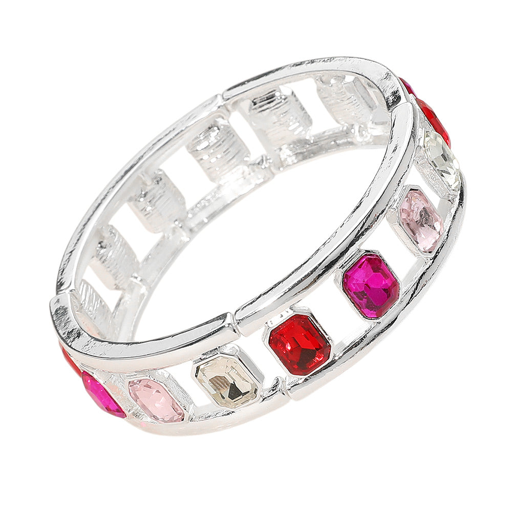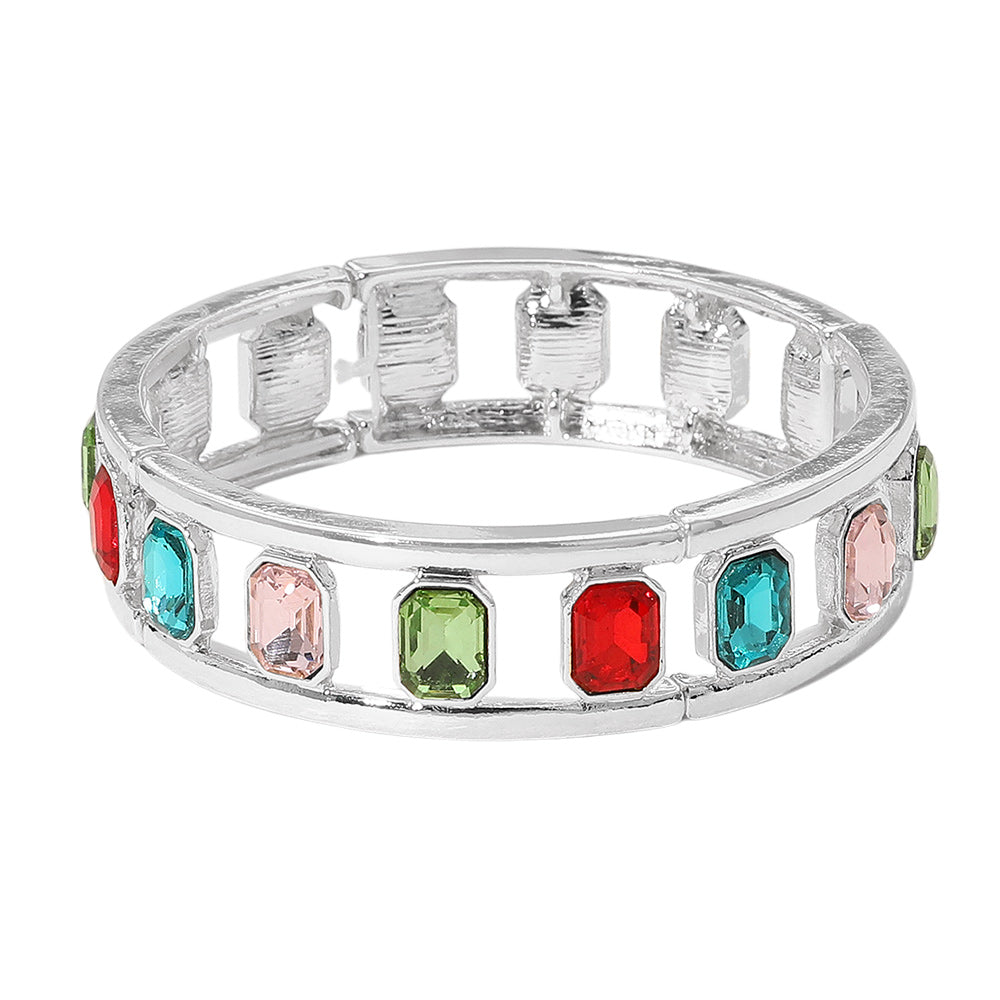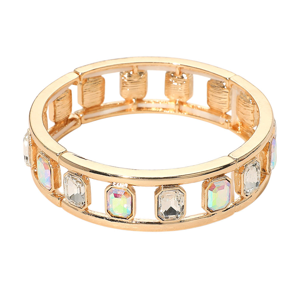 This bracelet features an open frame design adorned with striking emerald-cut stones that add a refined touch. The stretch fit ensures all-day comfort and easy wear, making it a perfect piece for both casual and dressy looks.