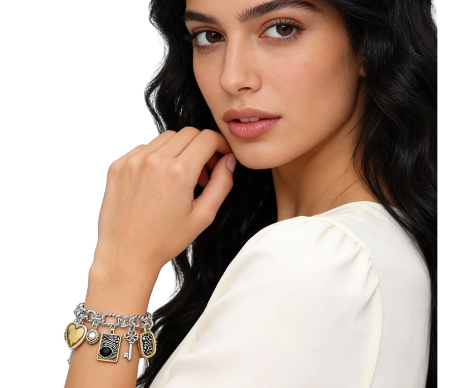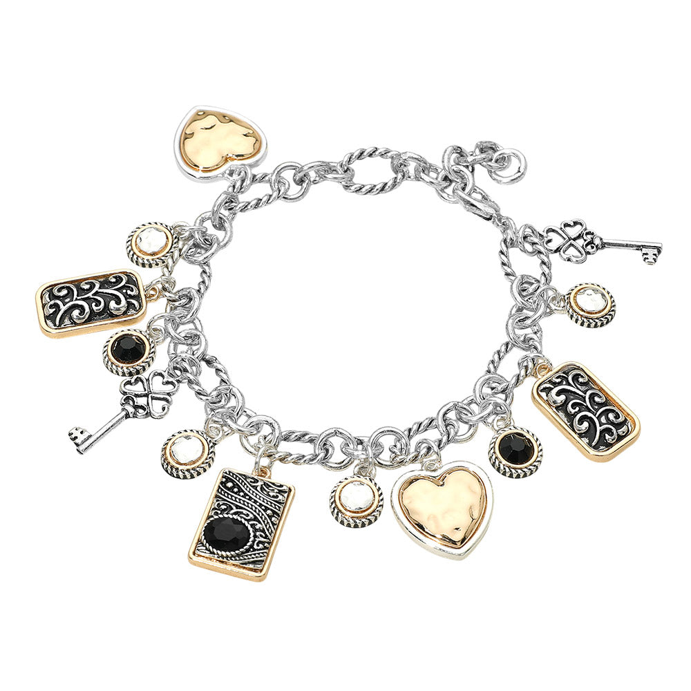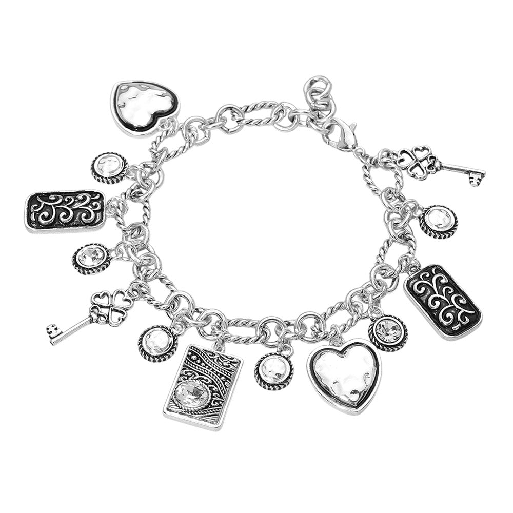 Two tone antique metal charm station bracelet featuring heart, key, and rectangular scrollwork accents with a subtle stone detail, also available in all silver. Designed with a classic vintage feel, it adds character and interest to any bracelet stack. Finished with an easy, comfortable fit for everyday wear.