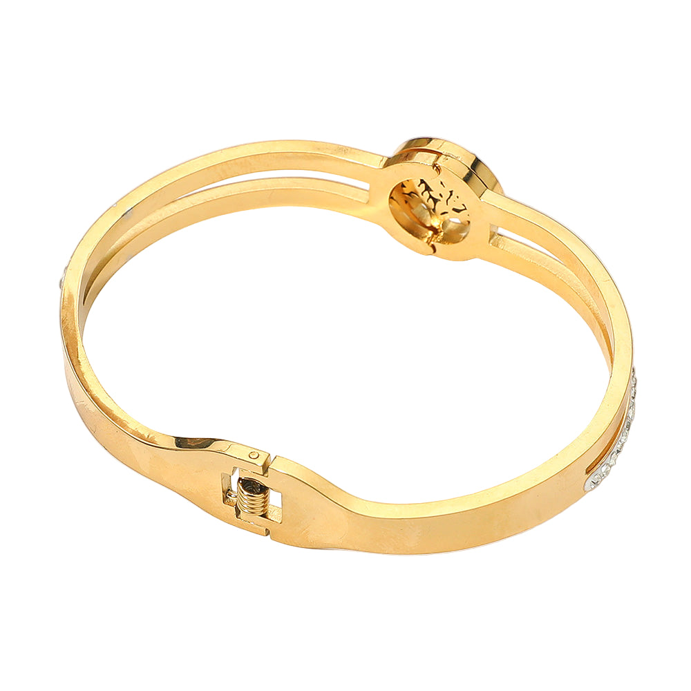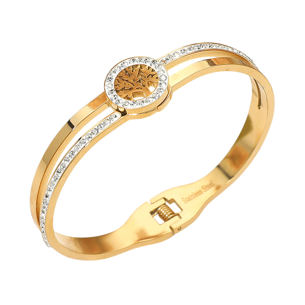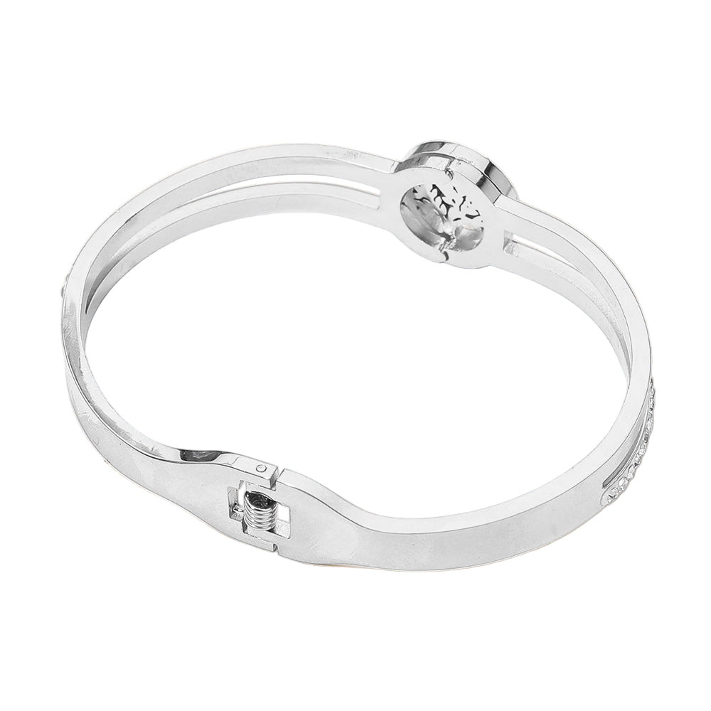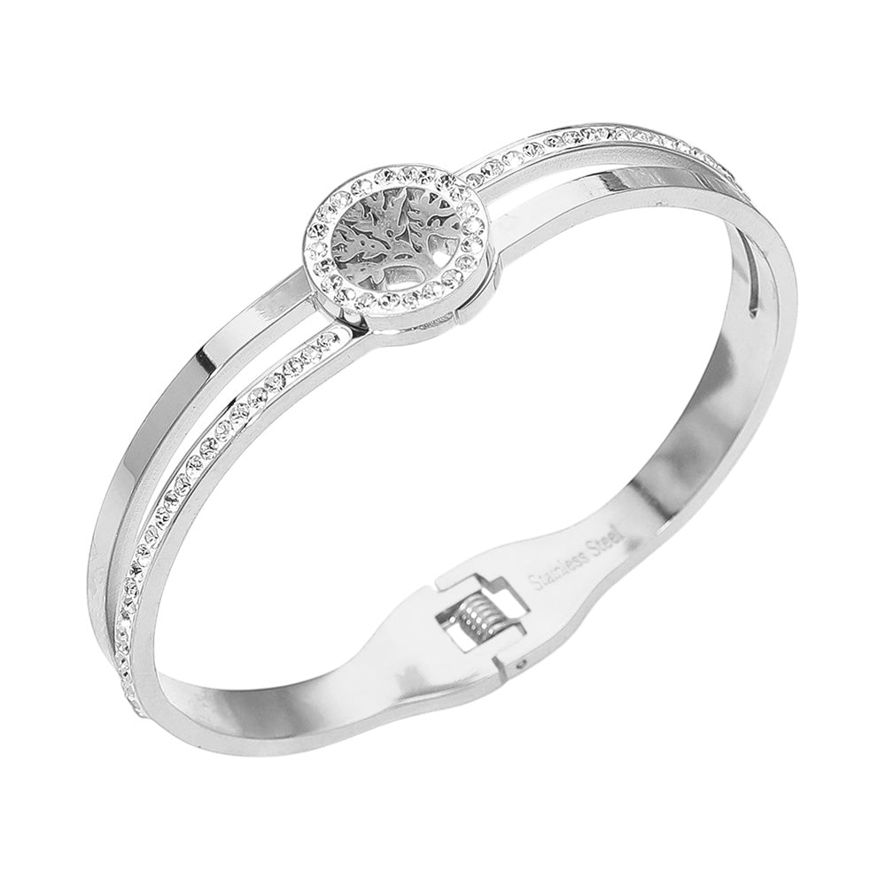 Symbolizing growth and strength, this stainless steel hinged bangle features a detailed Tree of Life accent. Stylish and meaningful, it’s water and tarnish resistant, making it a lasting accessory for everyday wear.