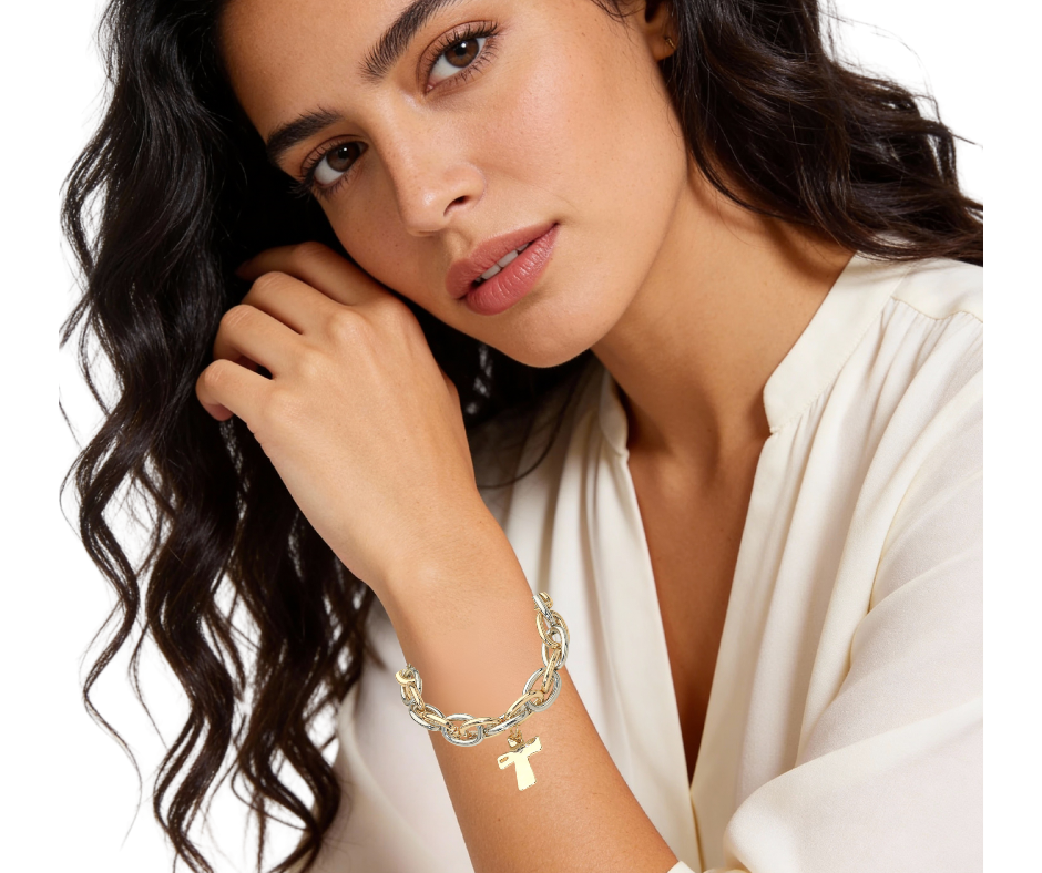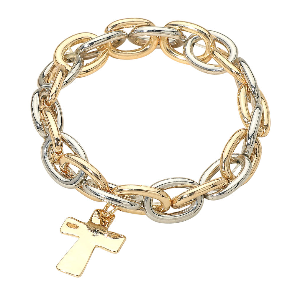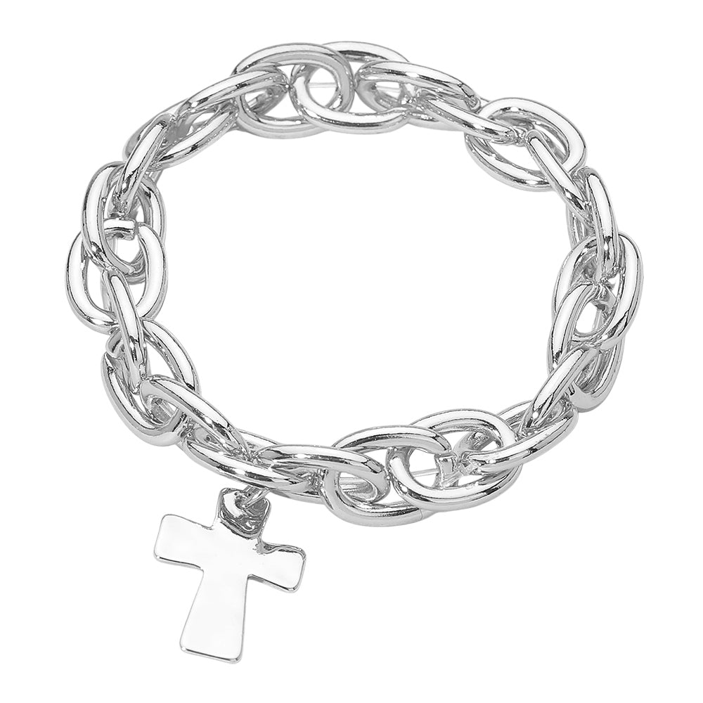 A bold stretch bracelet featuring chunky metal chain links accented with a cross charm. Designed with a flexible slip-on fit for easy wear, it adds a strong statement touch while staying comfortable for everyday styling.