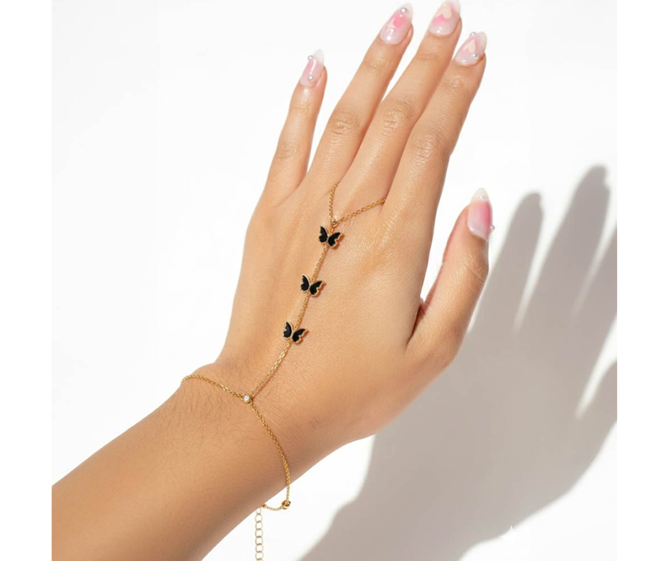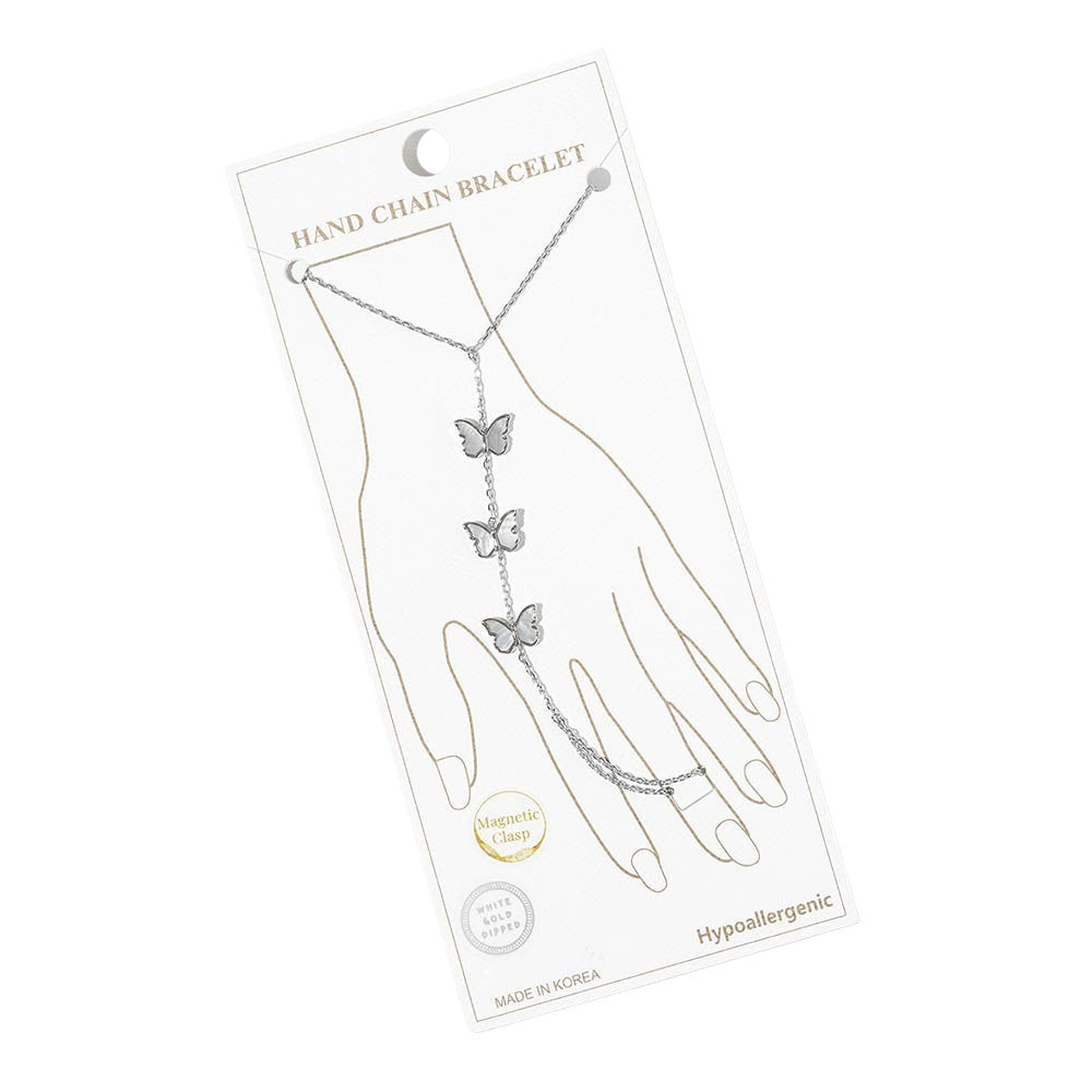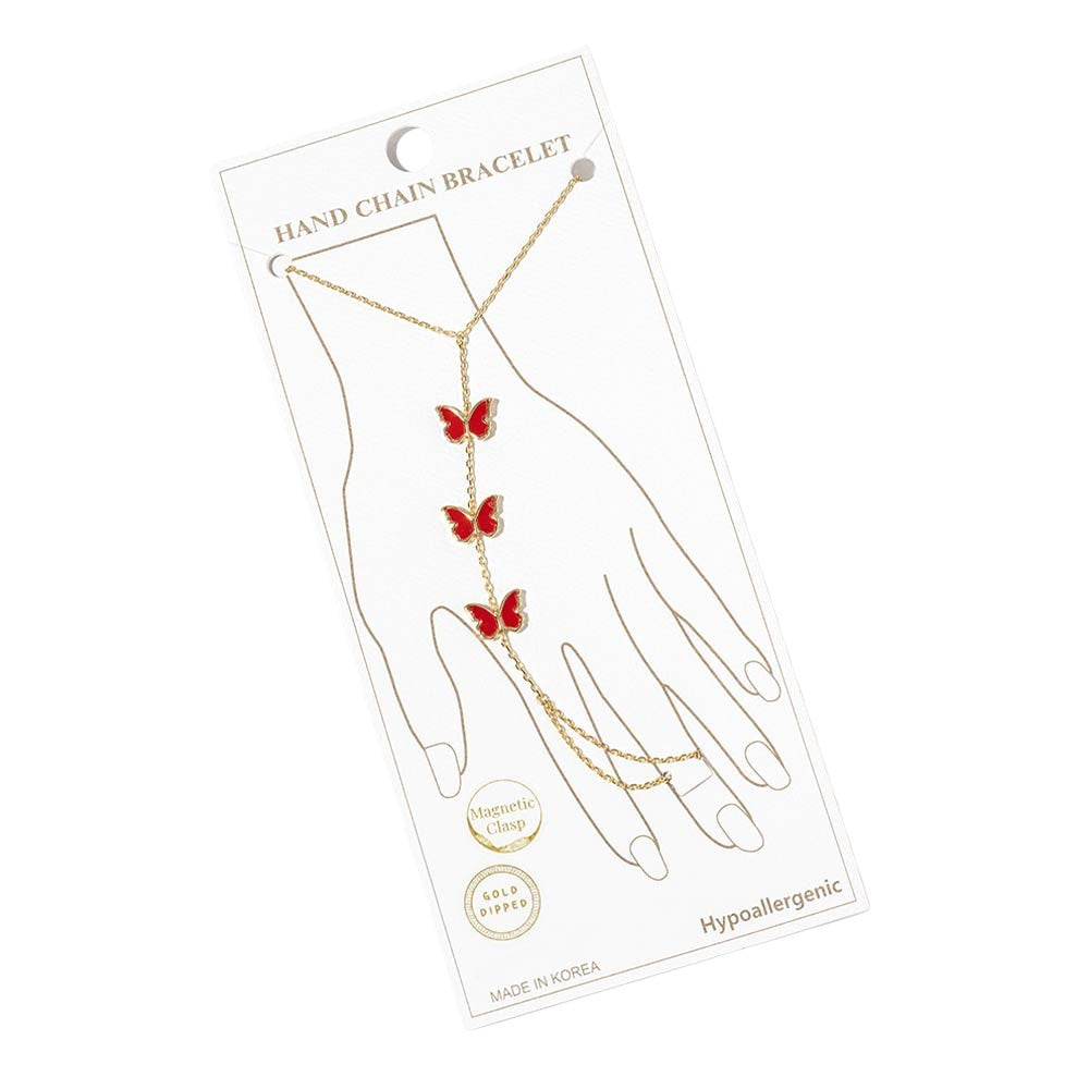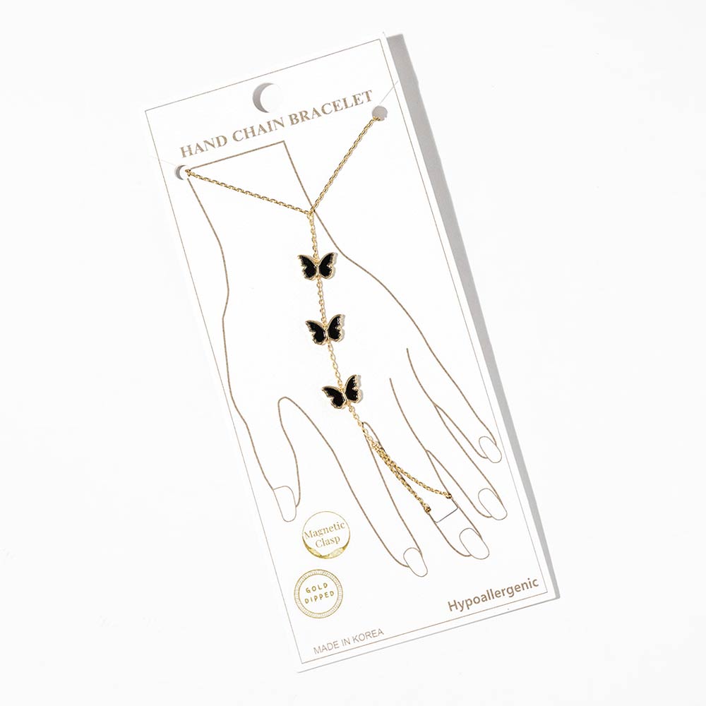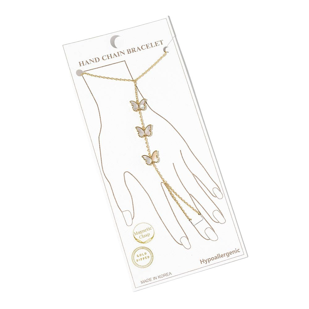 18K gold dipped butterfly charm link hand chain magnetic bracelet. A delicate and versatile bracelet that can be worn alone or layered, adding a feminine and polished touch to any look.