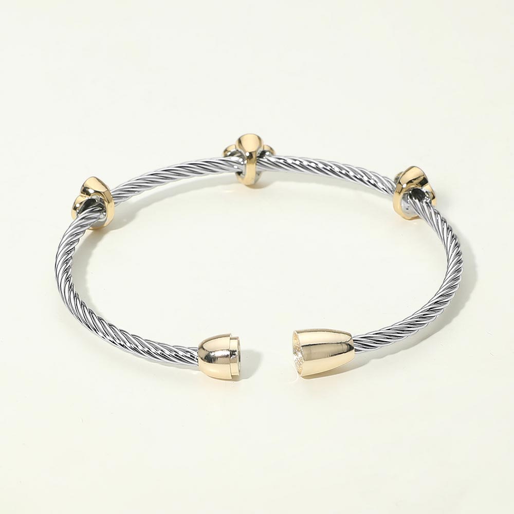 Add a modern touch of sparkle to your wrist with this 14K gold plated two tone twisted cable magnetic bracelet. Featuring cubic zirconia pavé quatrefoil bezel station accents, this piece blends classic charm with contemporary shine. The magnetic closure makes it easy to wear, while the two tone finish makes it versatile for styling with other jewelry.