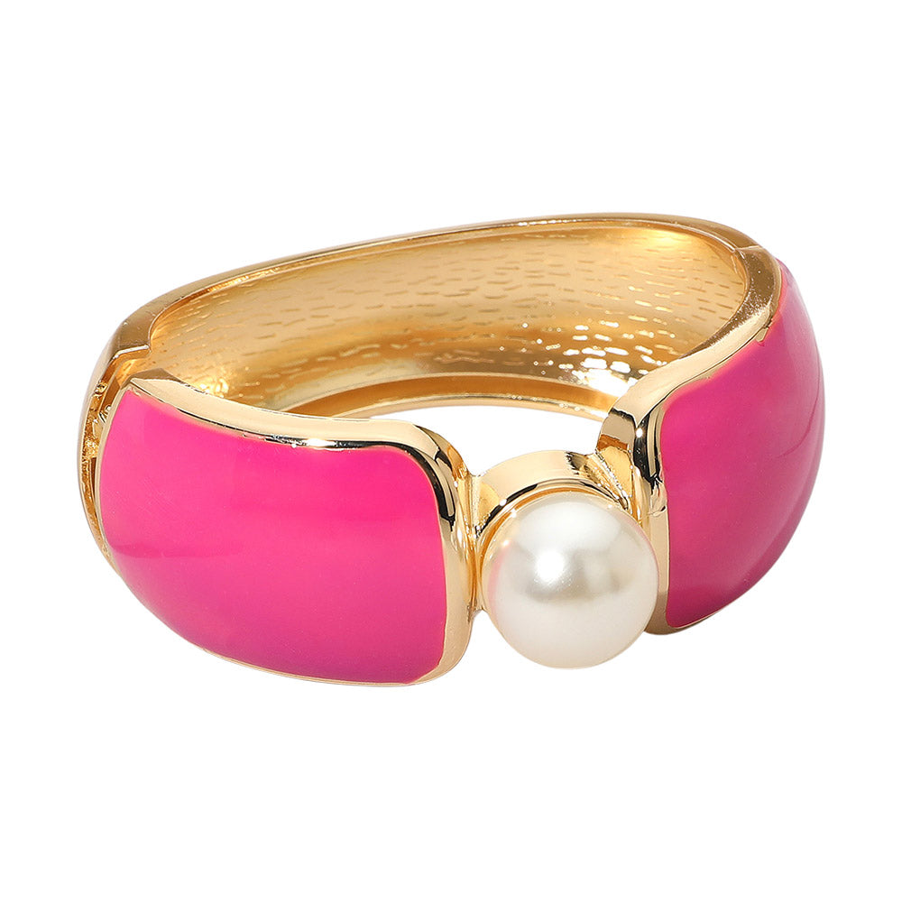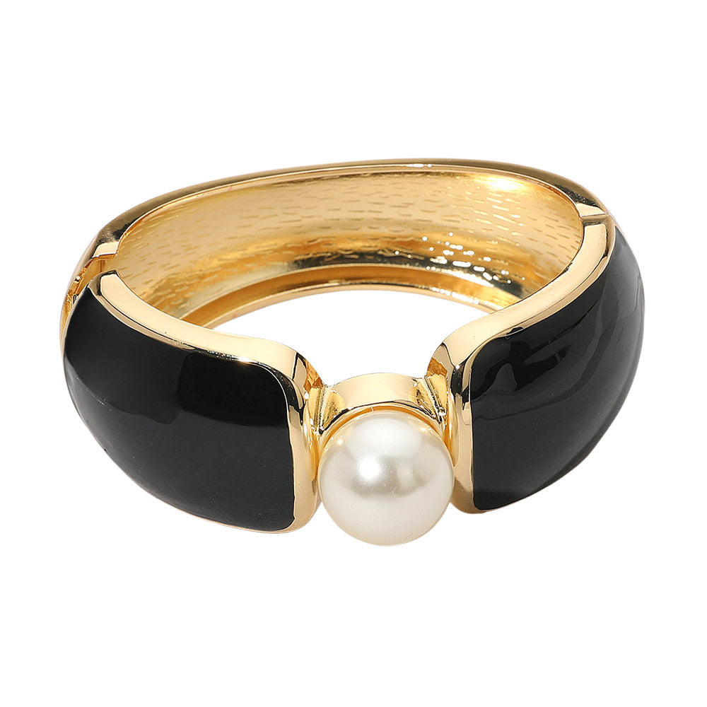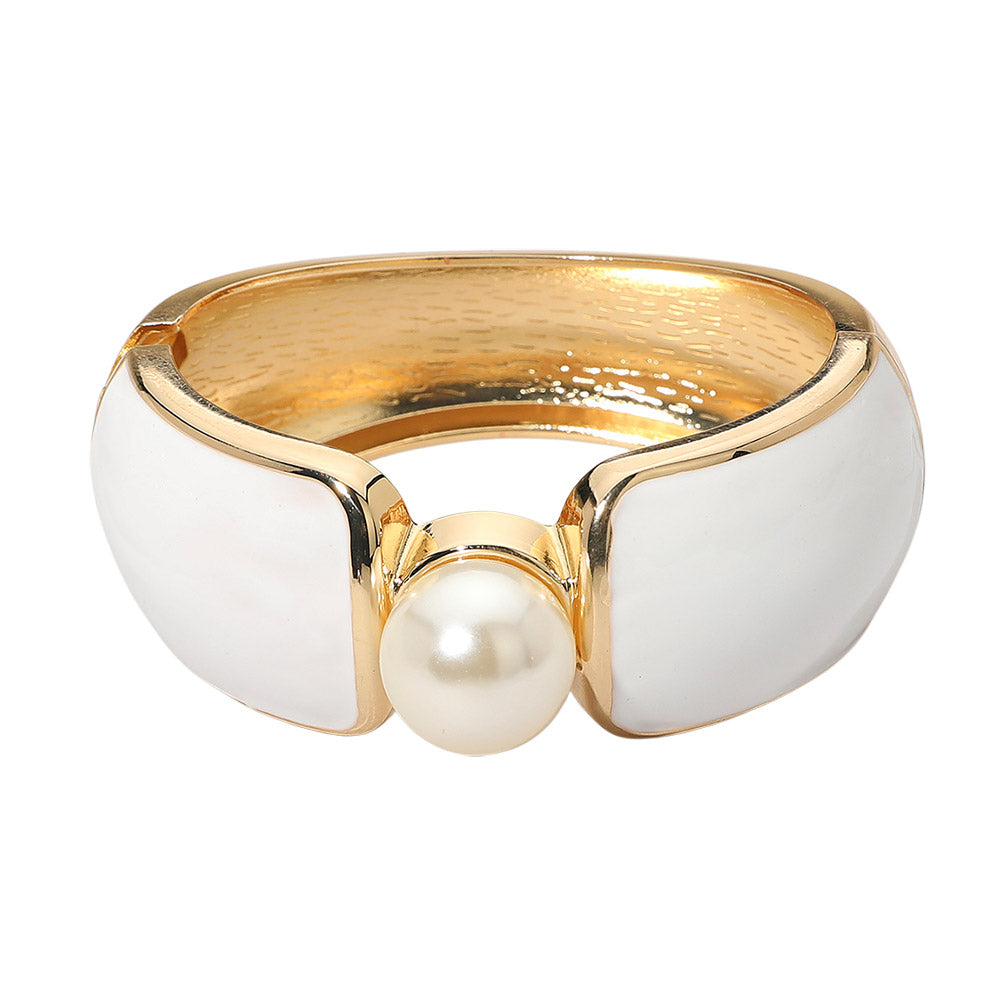 Central Pearl Accent Wide Enamel Hinged Bangle Bracelet — a stylish wide bangle featuring a glossy enamel finish and a central pearl accent for a refined statement look. Designed with a secure hinged closure for easy wear.
