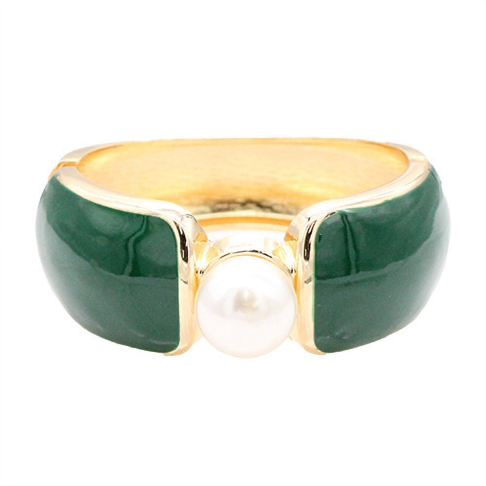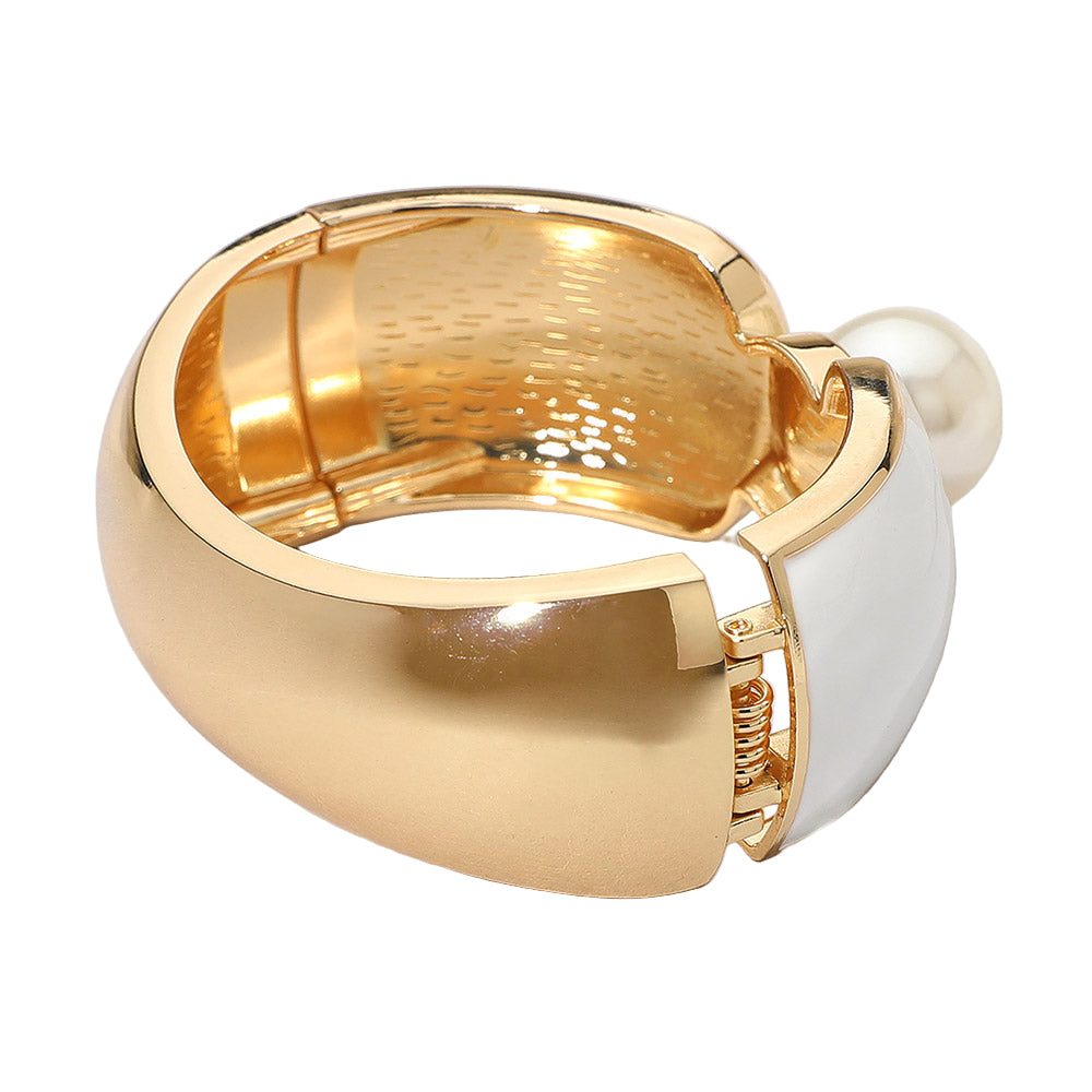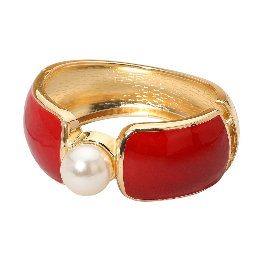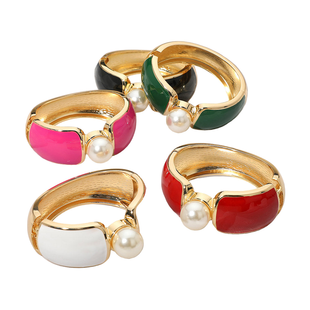 Central Pearl Accent Wide Enamel Hinged Bangle Bracelet — a stylish wide bangle featuring a glossy enamel finish and a central pearl accent for a refined statement look. Designed with a secure hinged closure for easy wear.