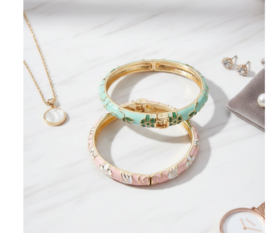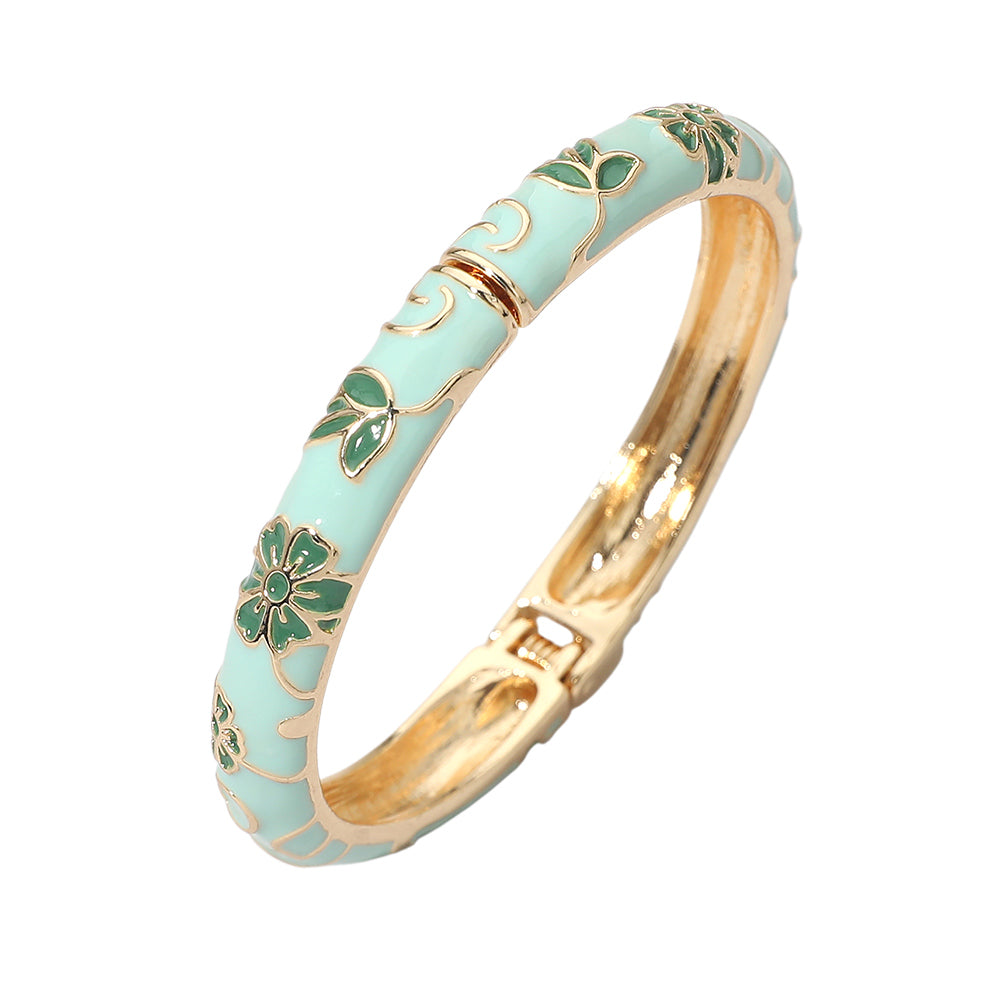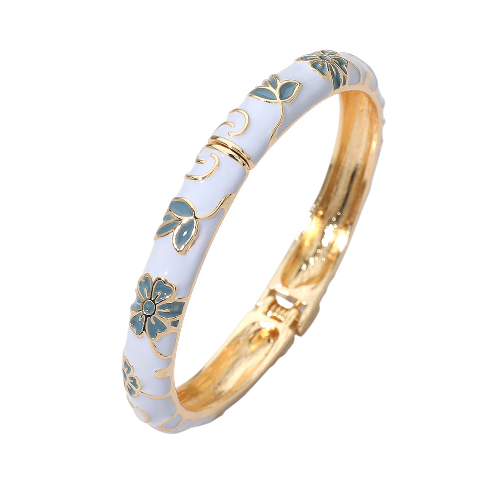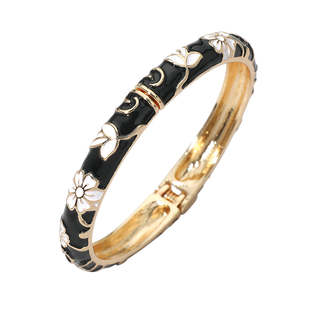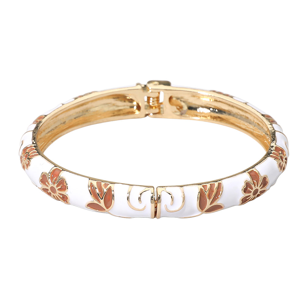 Brighten your accessory collection with this Floral Enamel Hinged Bangle Bracelet. Featuring delicate enamel floral details and a sleek hinged closure, it offers the perfect balance of charm and elegance. Wear it alone for a feminine touch or stack it with other bangles for a chic, layered look.