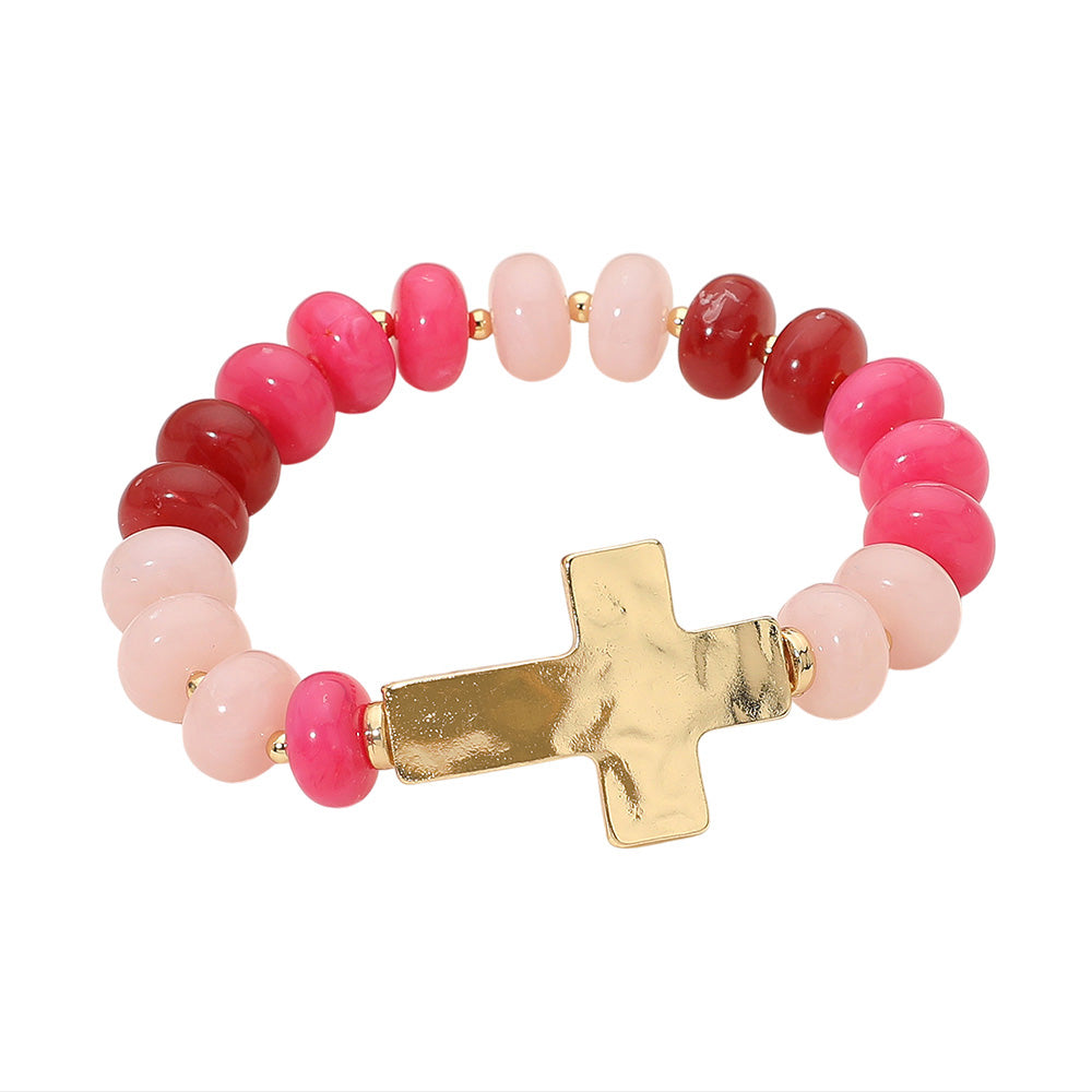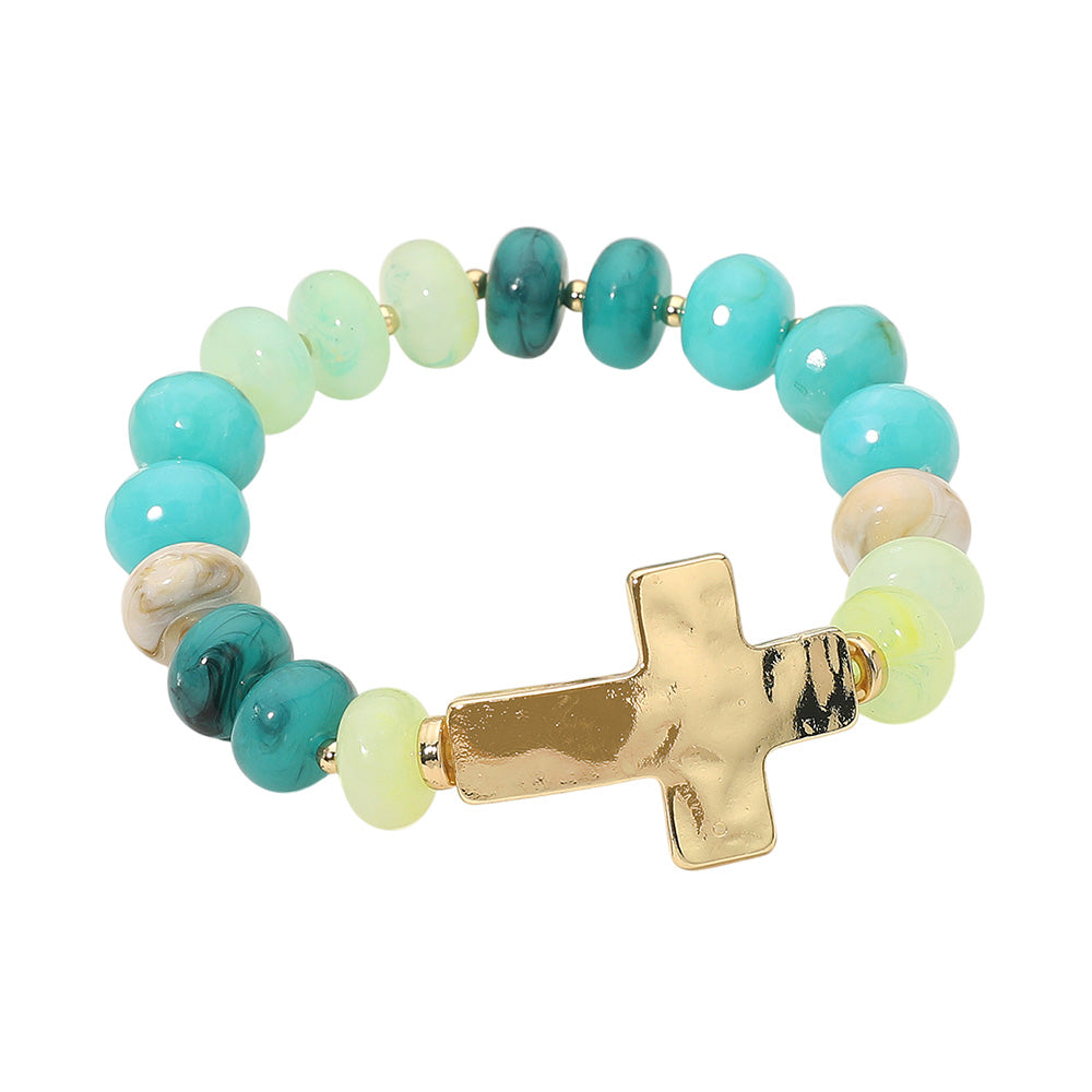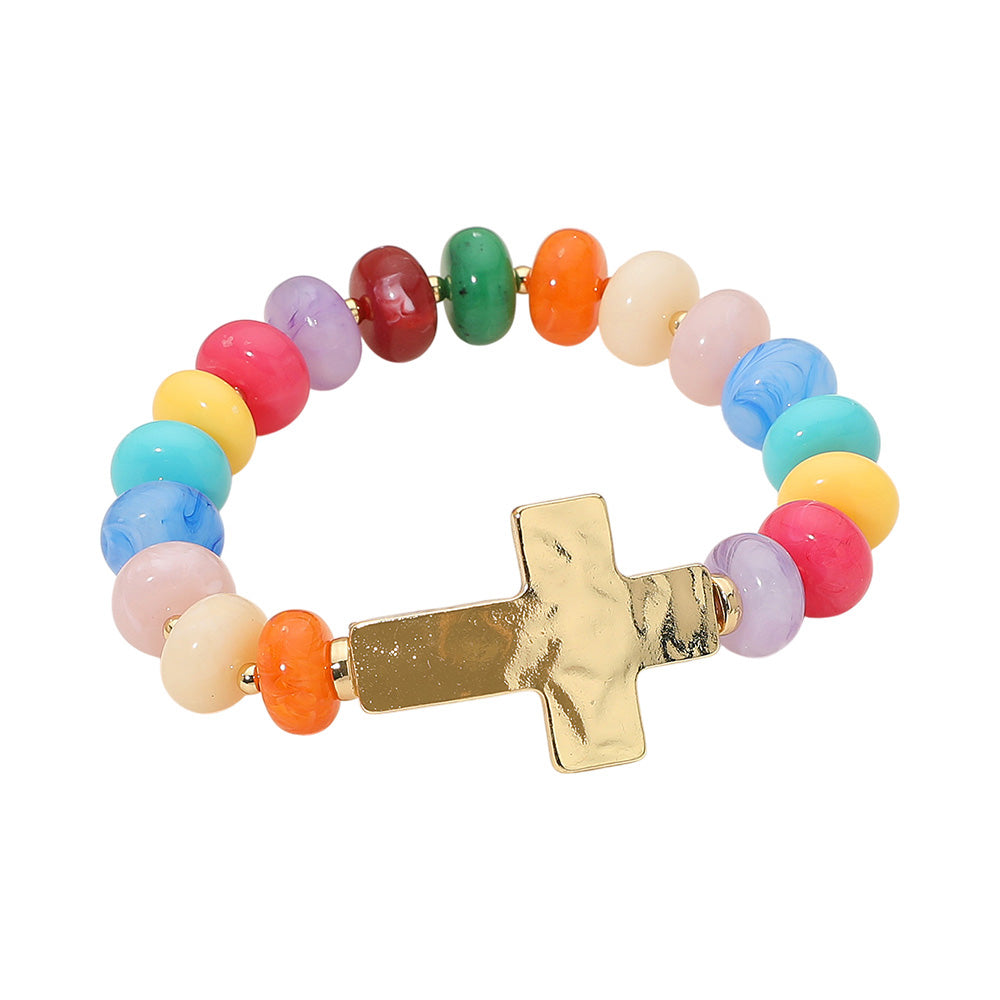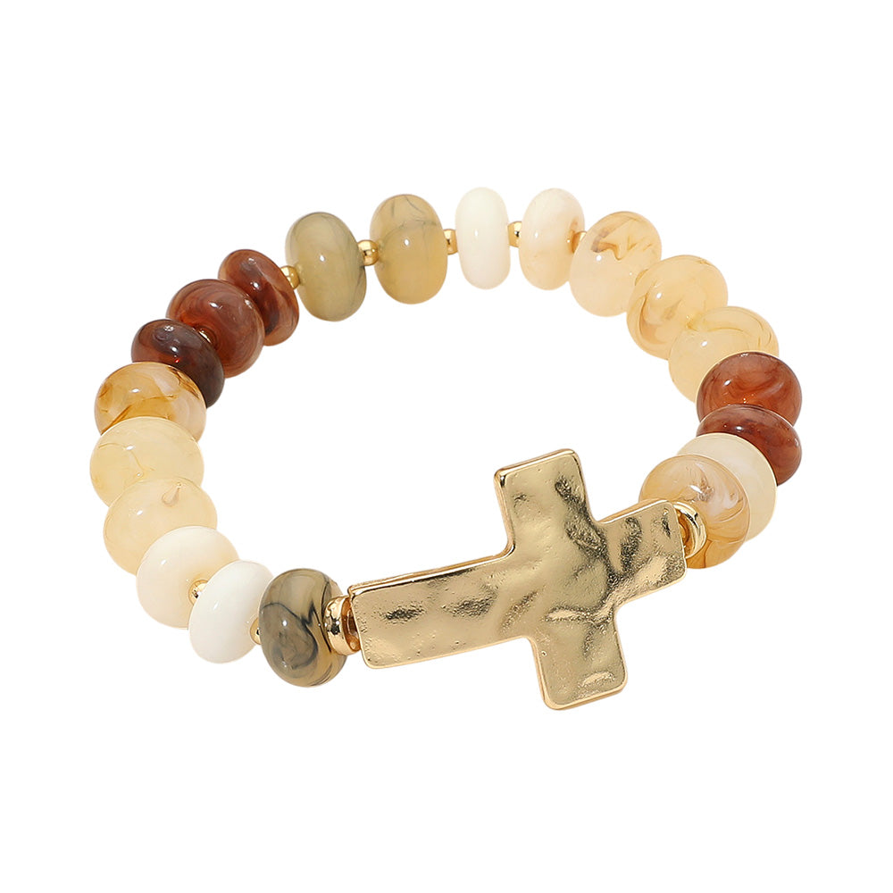 This stretch bracelet features flat resin disc beads paired with a hammered polished metal cross accent for a stylish and meaningful look. Comfortable to wear and easy to stack with other favorites.