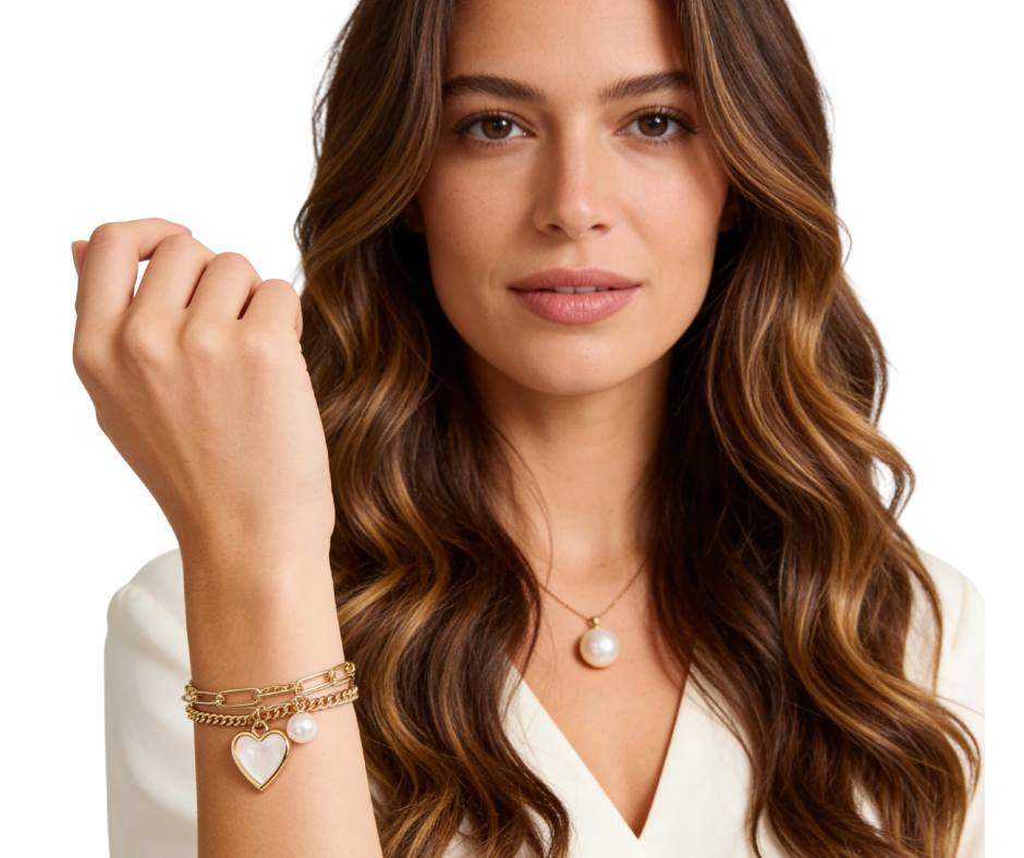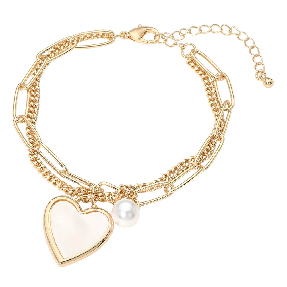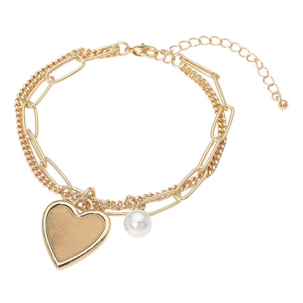 A modern mix of classic and trendy, this layered bracelet features a bold paperclip chain paired with a curb chain and finished with a delicate heart pearl charm. The layered design gives you that stacked look in one easy piece.