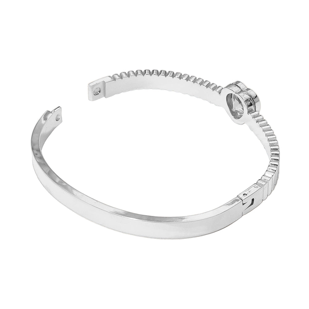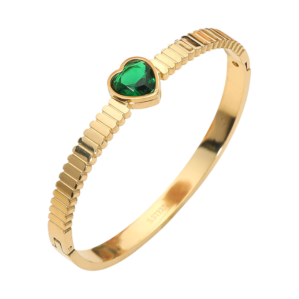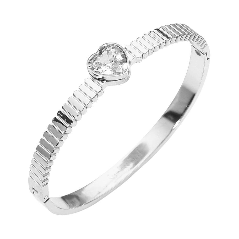 This stainless steel hinged bangle features a sleek heart design accented with a sparkling stone for a subtle touch of charm. Water and tarnish resistant, it’s a durable piece that blends style with everyday wearability.