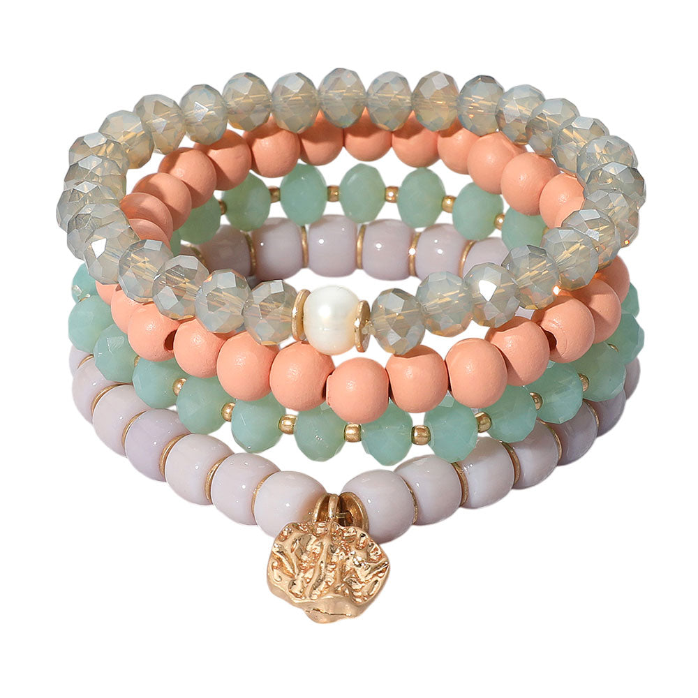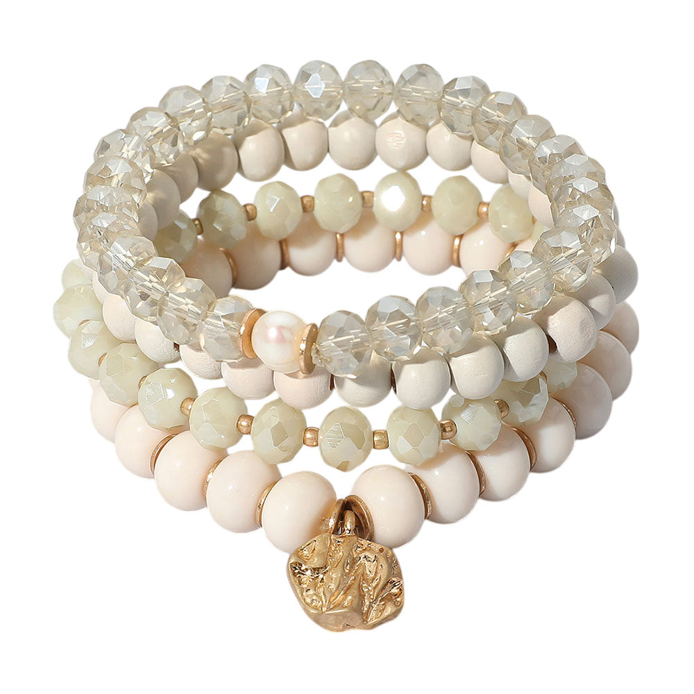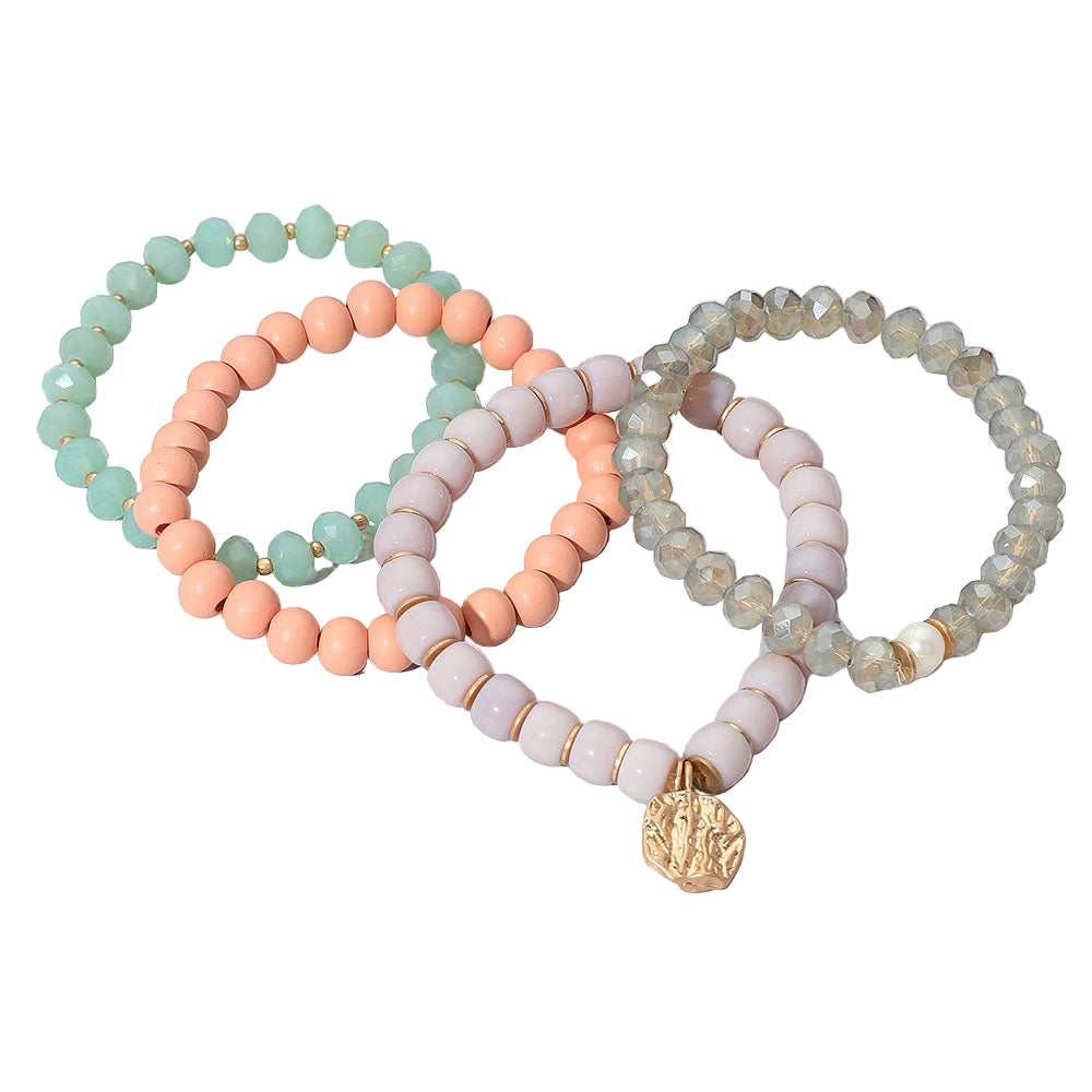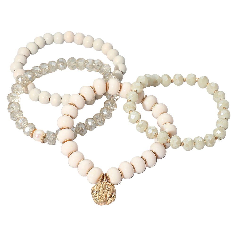 Set of 4 stretchable bracelets featuring natural stone and wood beads with charming accents. Comfortable to wear and easy to mix and match, these bracelets add a stylish earthy touch to your everyday look or make a thoughtful gift.