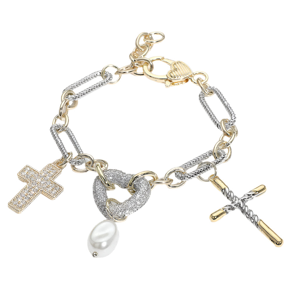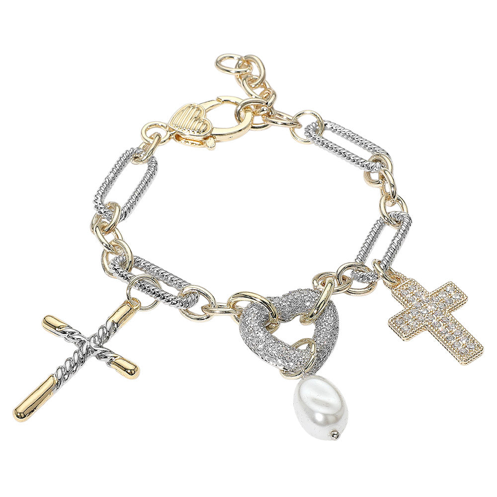 This two-tone mixed link chain bracelet is 14K gold plated and features a beautiful combo of charms: a cubic zirconia stone-paved cross, heart, and pearl accent. A unique blend of shine, texture, and meaning—perfect for stacking or wearing solo.