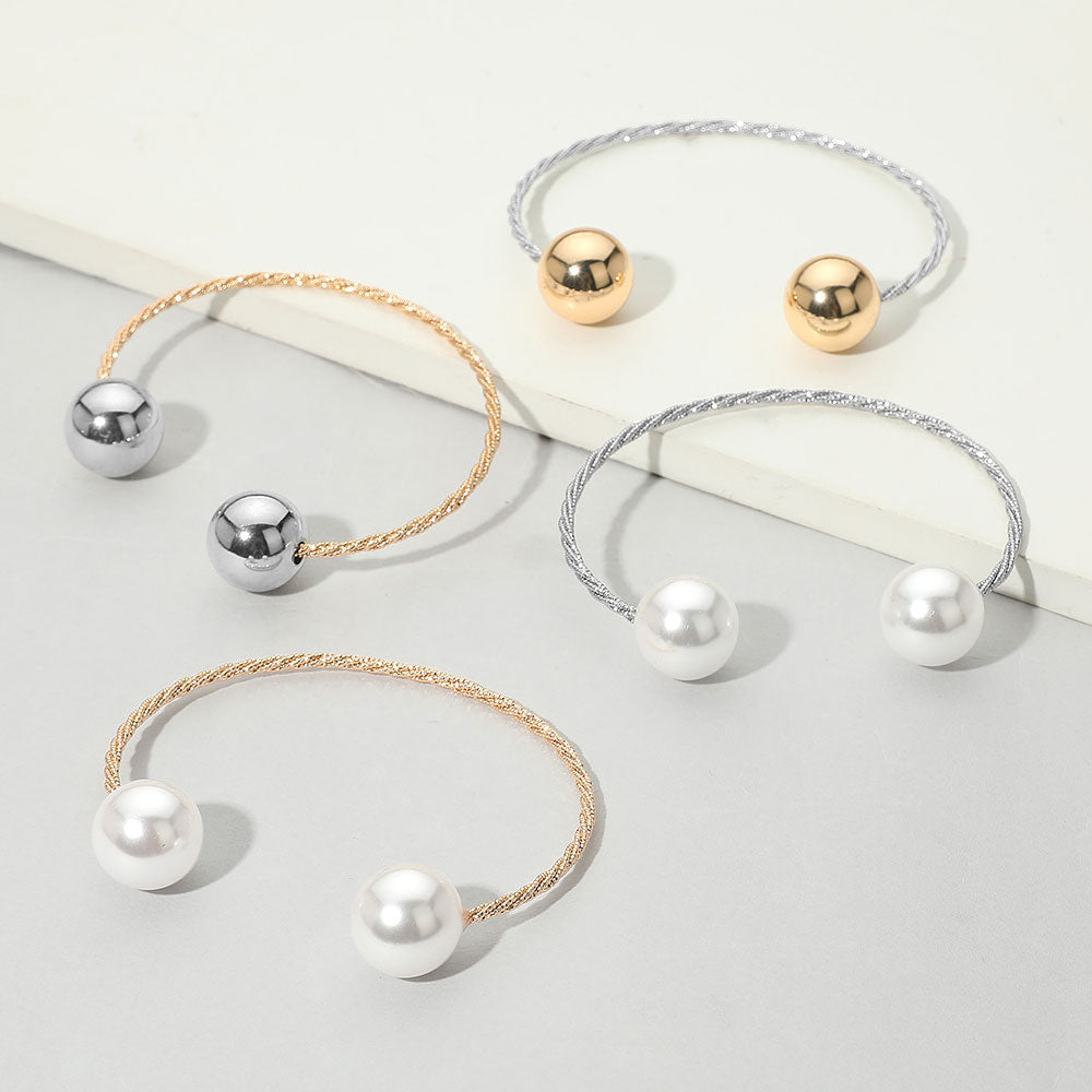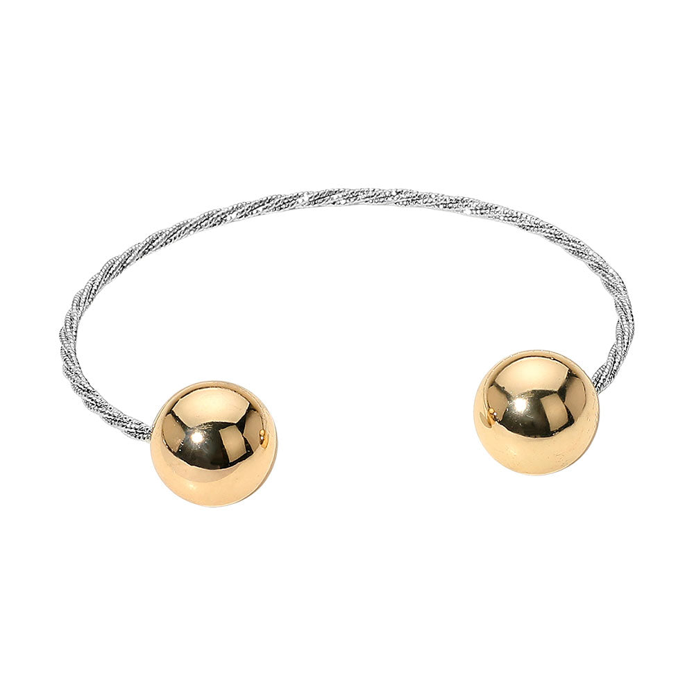 This sleek open cuff bracelet features polished metal ball accents at each end for a modern and minimalist look. Adjustable and versatile, it’s perfect for layering or wearing alone as a statement piece.