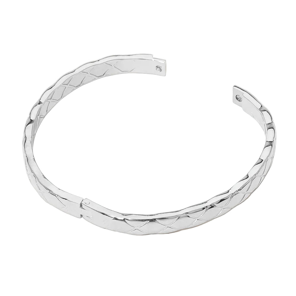 Add a sleek, modern touch to your wrist with this stainless steel crisscross textured hinged bangle bracelet. Designed with intersecting bands and subtle texture, this piece blends bold structure with everyday wearability. The hinged closure makes it easy to slip on and off, while the polished finish gives it a clean, refined look. Perfect worn alone or stacked with your favorite bracelets.