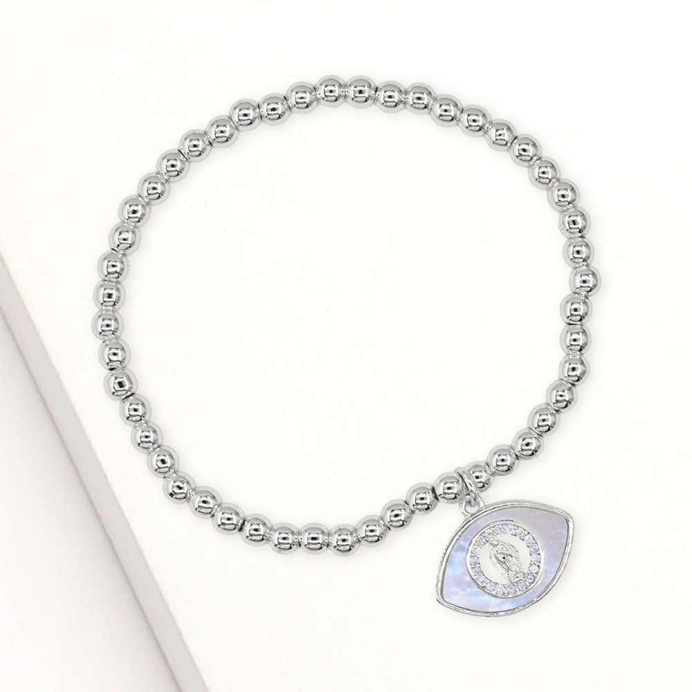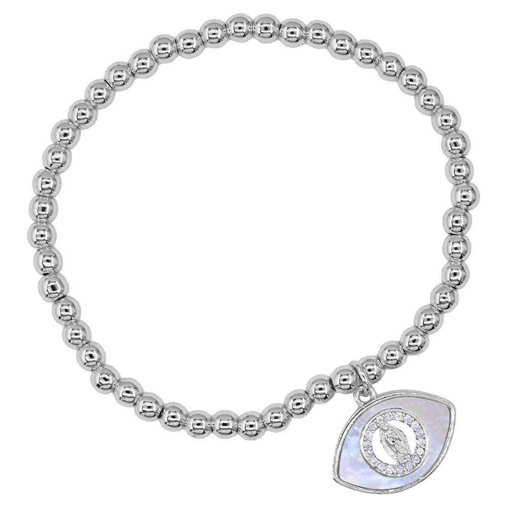 A protective evil eye charm framed with shimmering cubic zirconia and accented with mother of pearl makes this stretch bracelet both meaningful and stylish. Crafted in stainless steel for lasting wear, it’s available in gold or silver tone and designed for a comfortable fit.