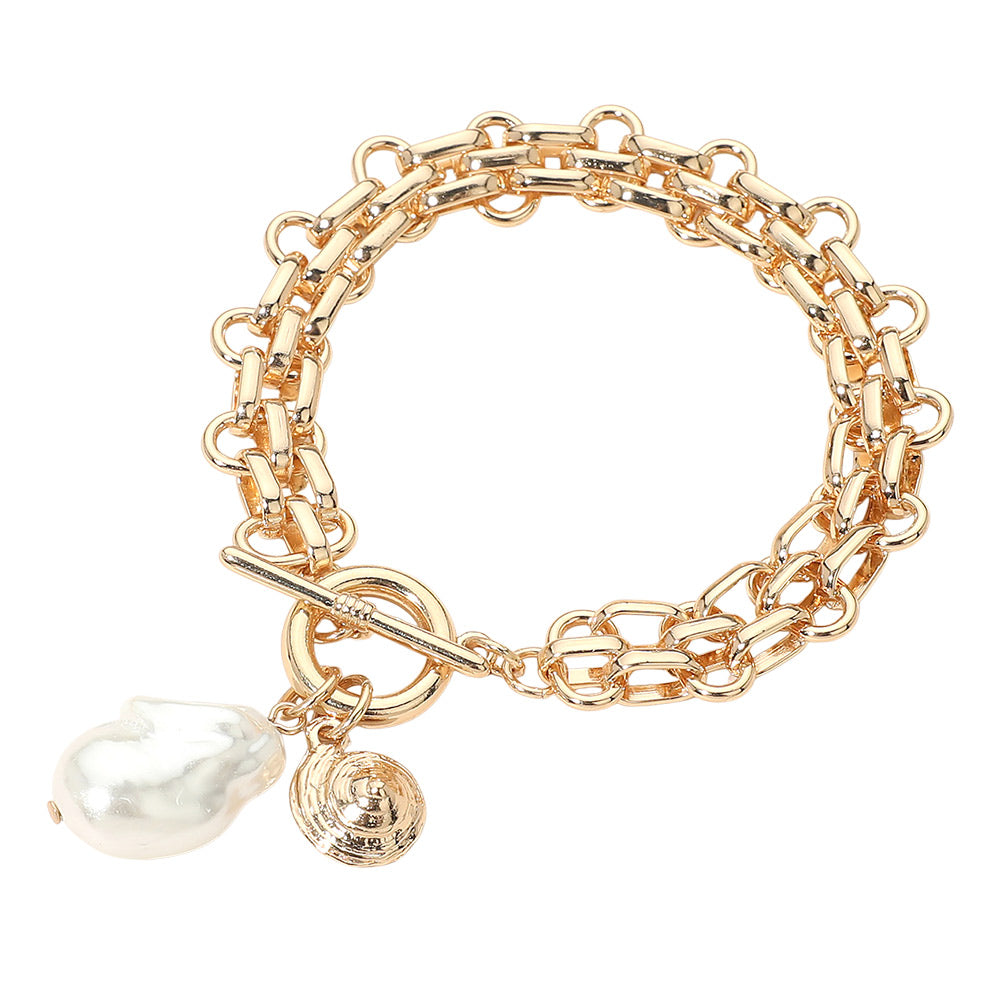 A chunky bracelet featuring organic pearl shell charms for a natural, textured look. Designed with a toggle closure for easy and secure wear. A statement piece that brings a coastal-inspired touch to everyday styling.
