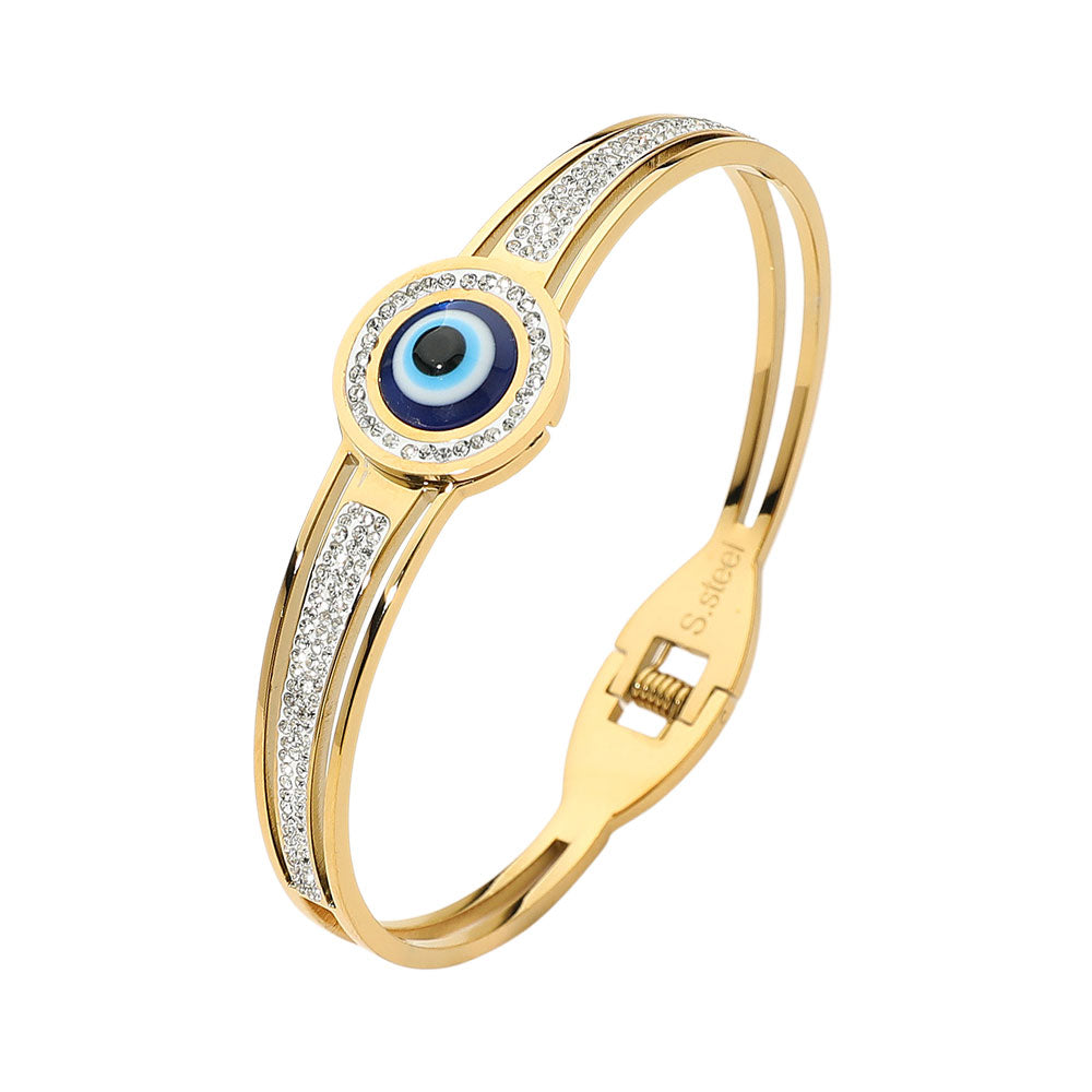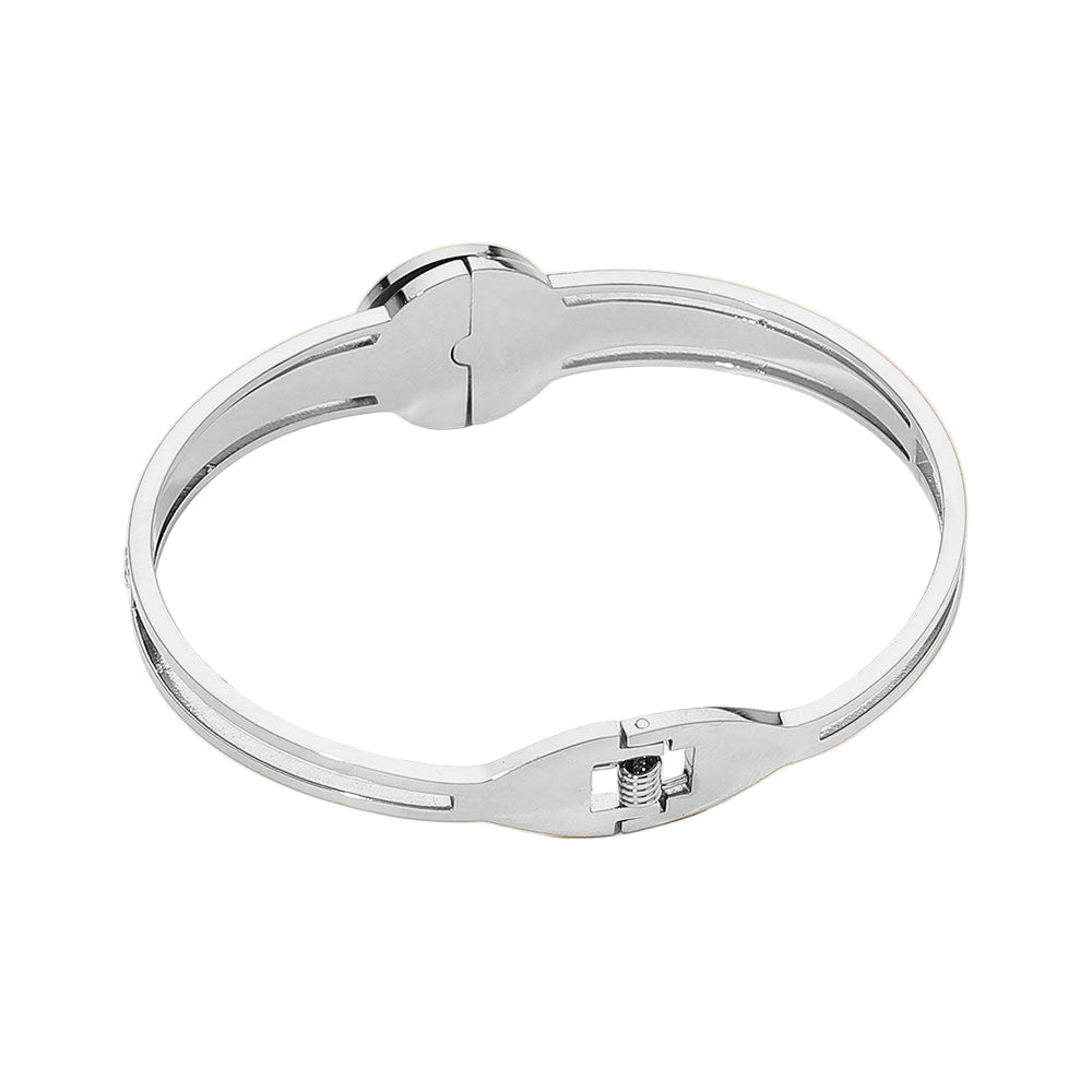 This stainless steel hinged bangle showcases a beautiful cubic zirconia paved evil eye accent that adds a subtle sparkle and modern charm. A stylish piece that’s perfect for any occasion.