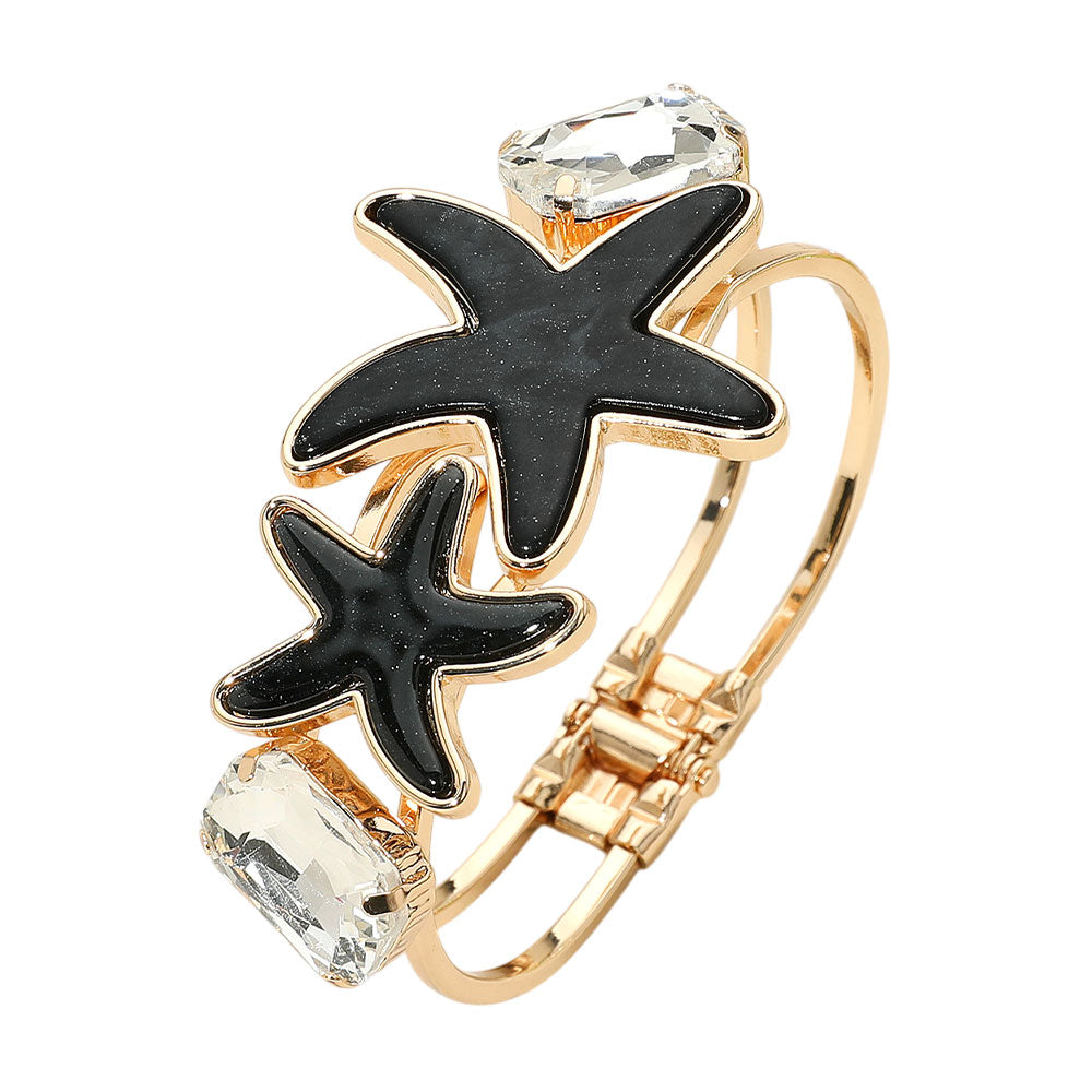 Glittered Resin Double Starfish Hinged Bangle Bracelet features sparkling resin starfish accents that shimmer beautifully with every move. Designed with a secure hinged closure for easy wear and a fun coastal-inspired look.