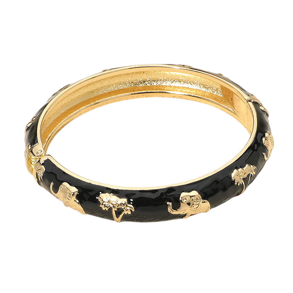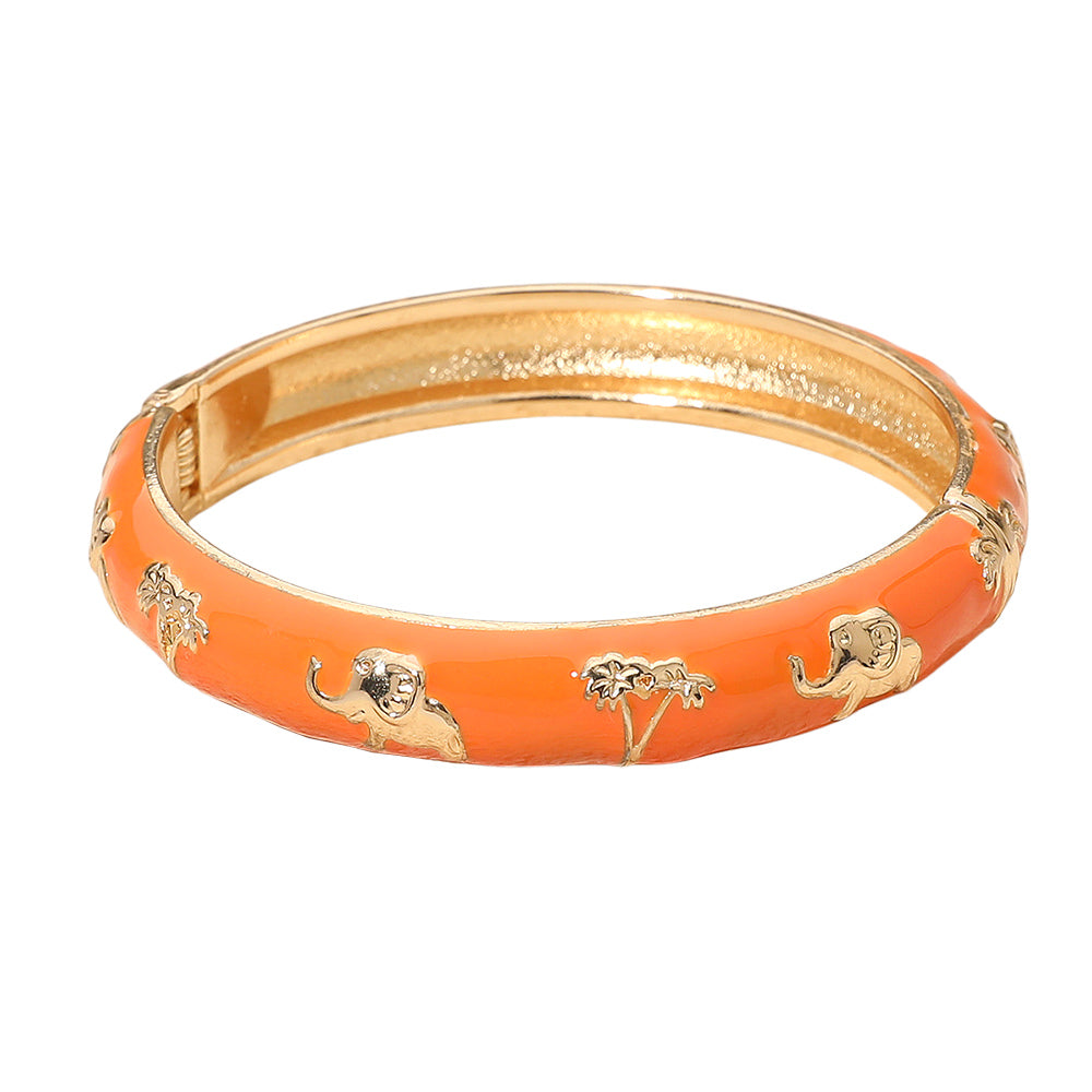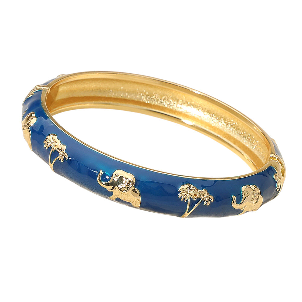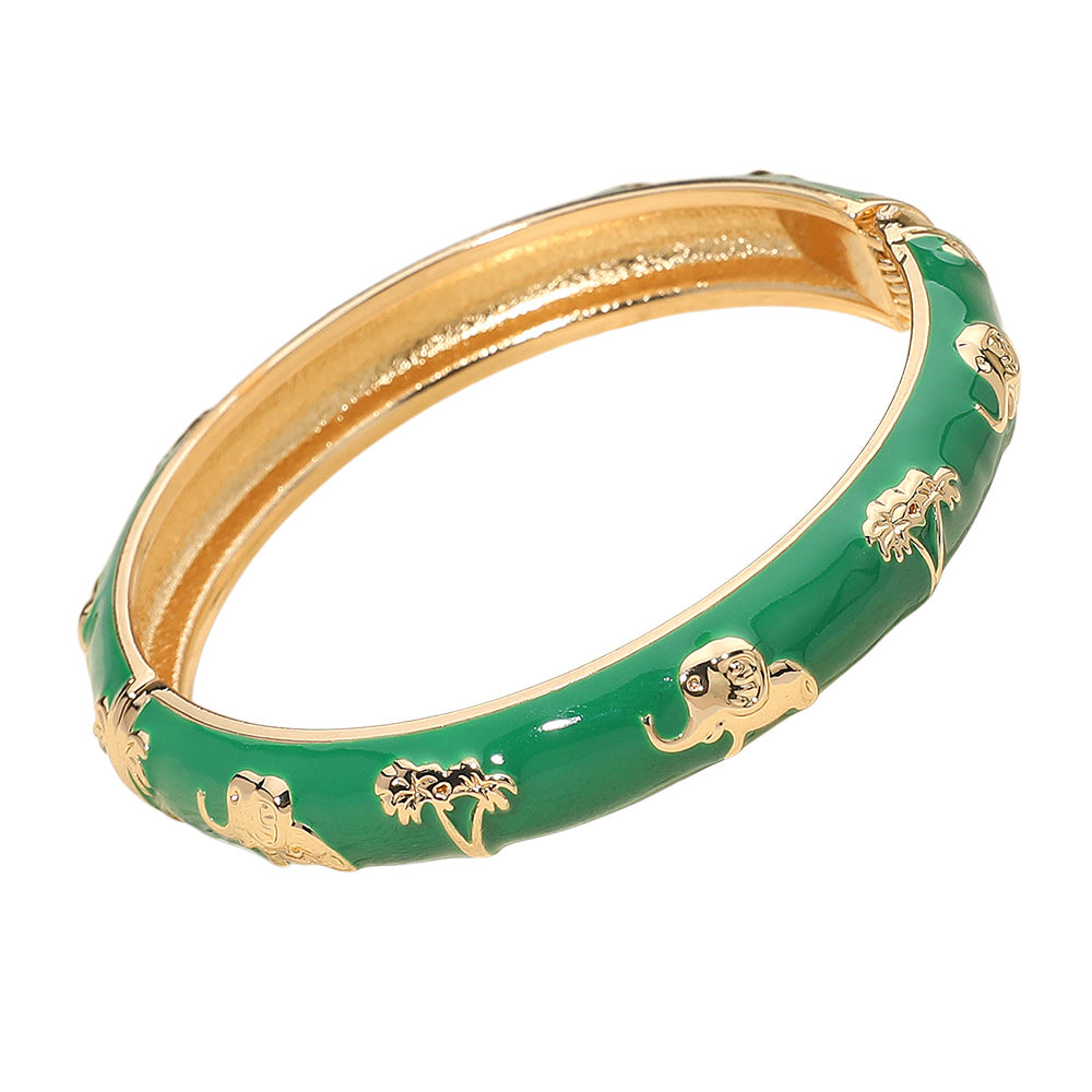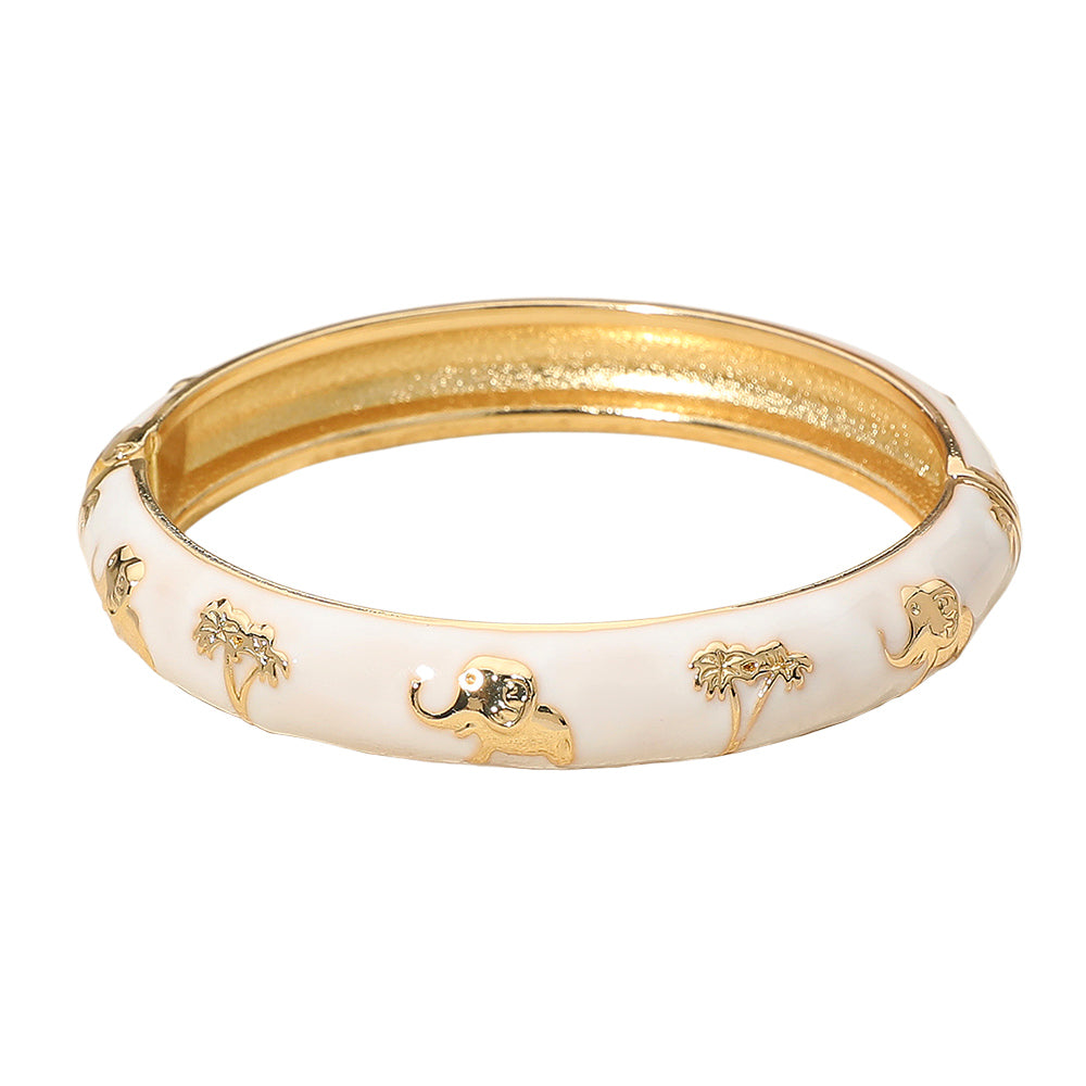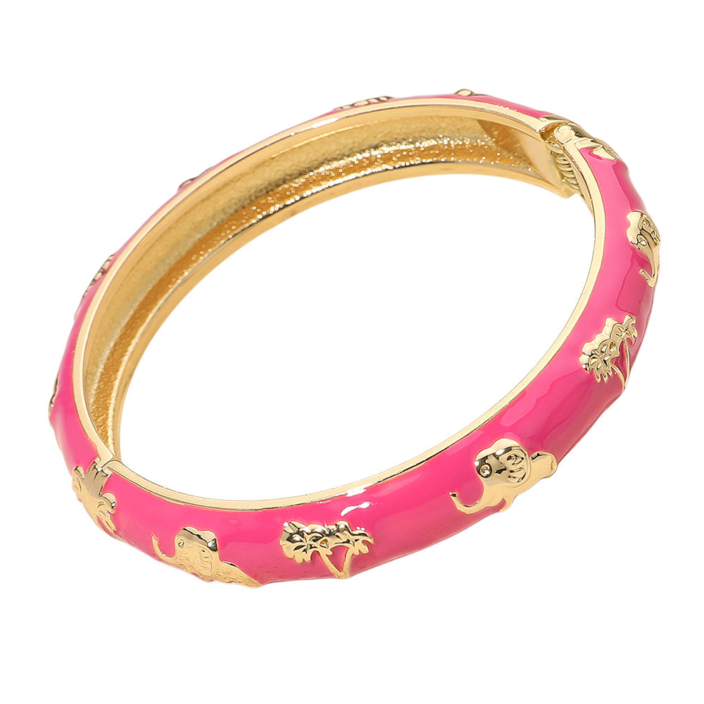 Elephant and Tree Embossed Enamel Hinged Bangle Bracelet features beautifully detailed embossed elephant and tree designs on a glossy enamel band. It includes a secure hinged closure for easy wear and a unique statement look.