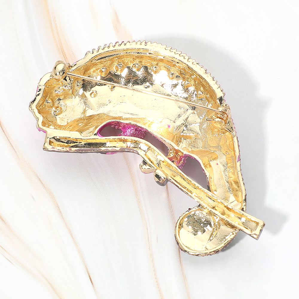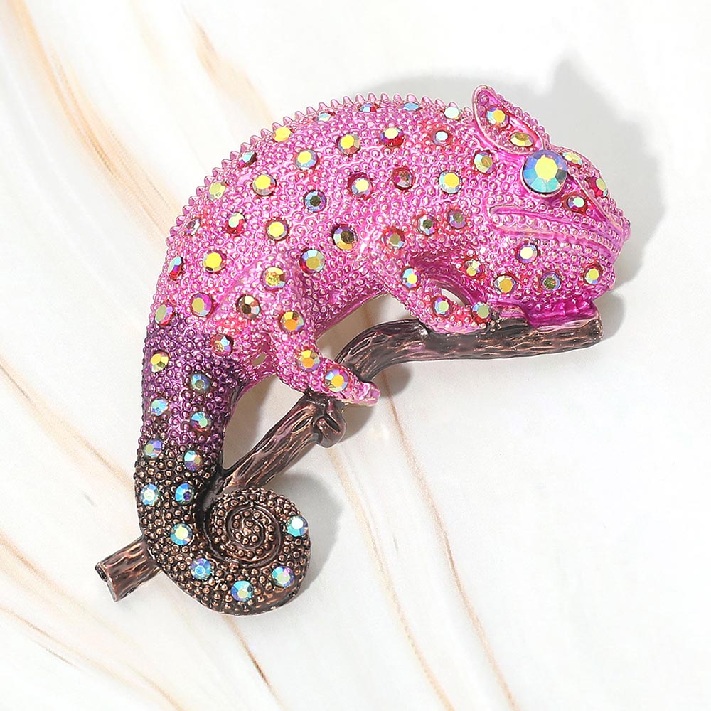 This statement pin brooch features a detailed chameleon design accented with sparkling rhinestones for a bold, eye-catching look. The shimmering embellishments add texture and shine while highlighting the unique shape. Perfect for adding a fun and standout touch to jackets, bags, or accessories.
