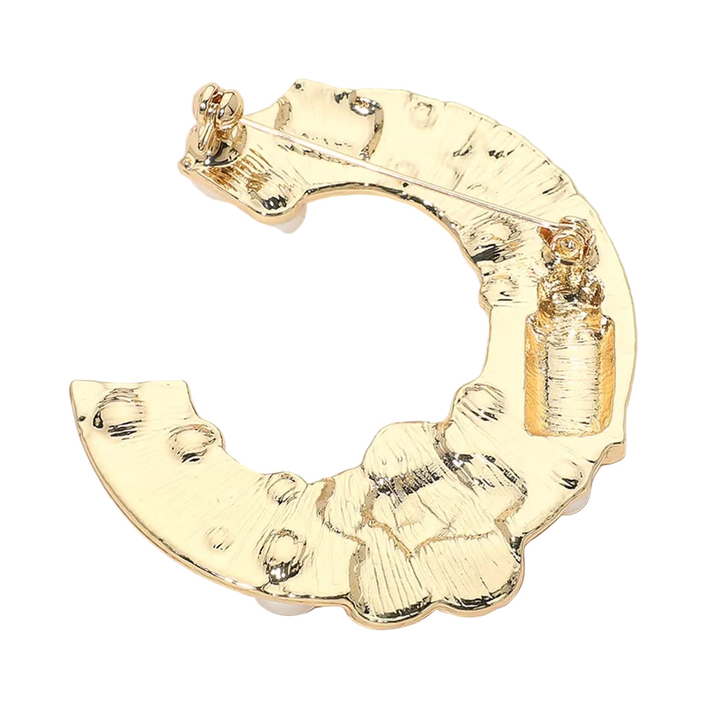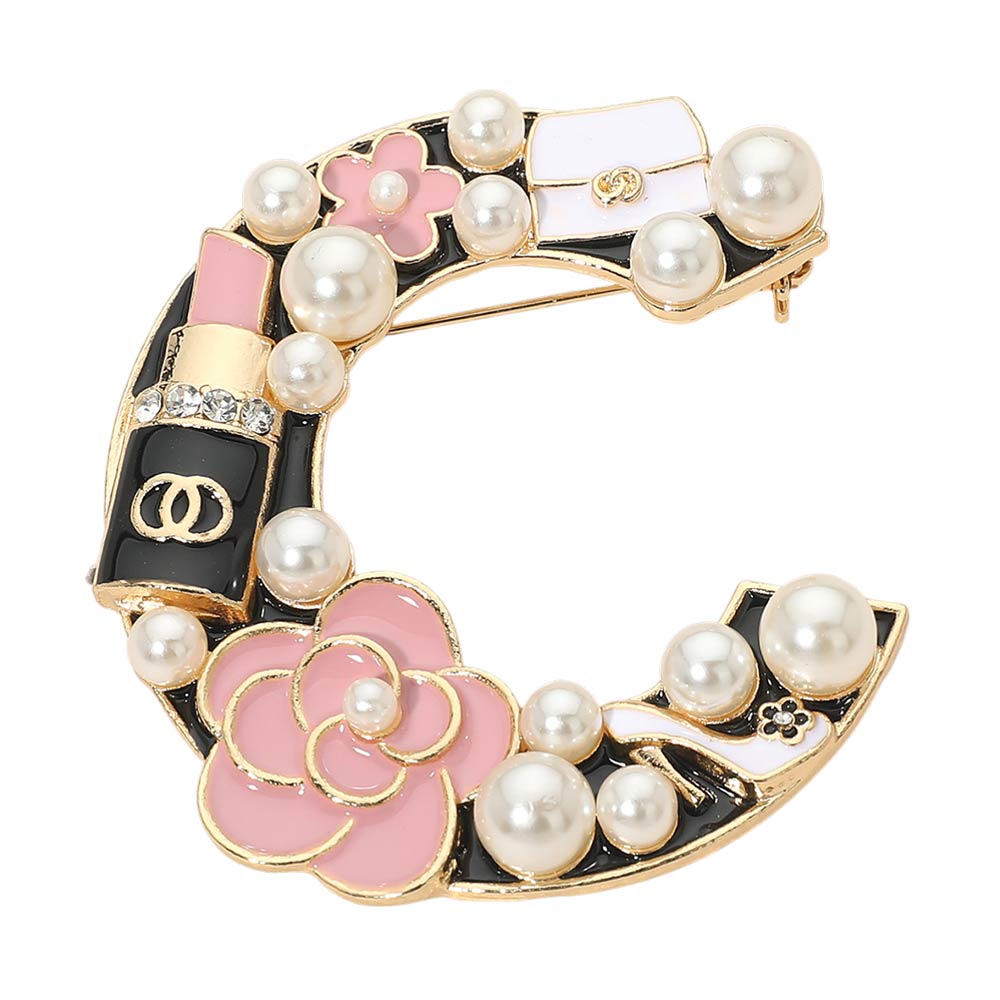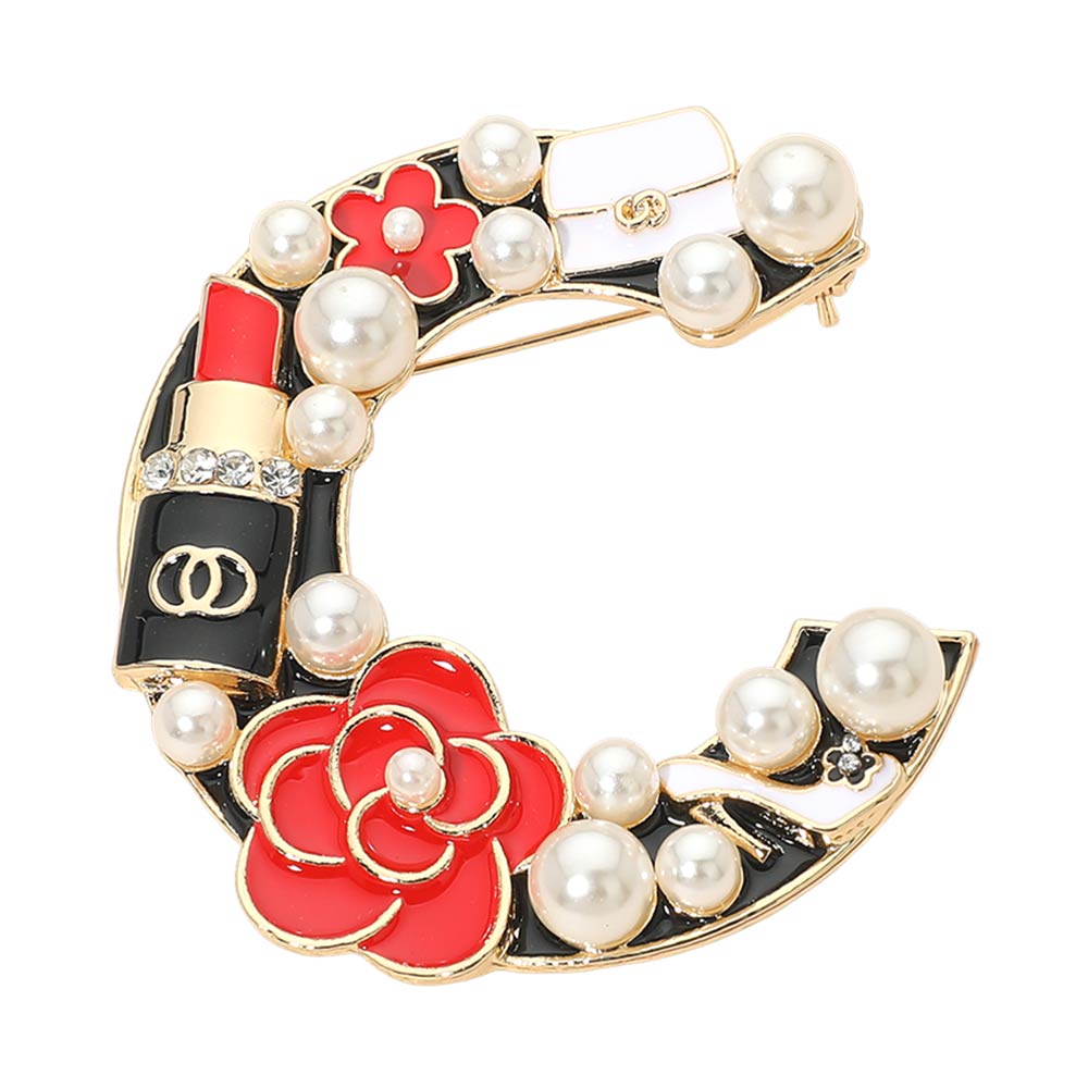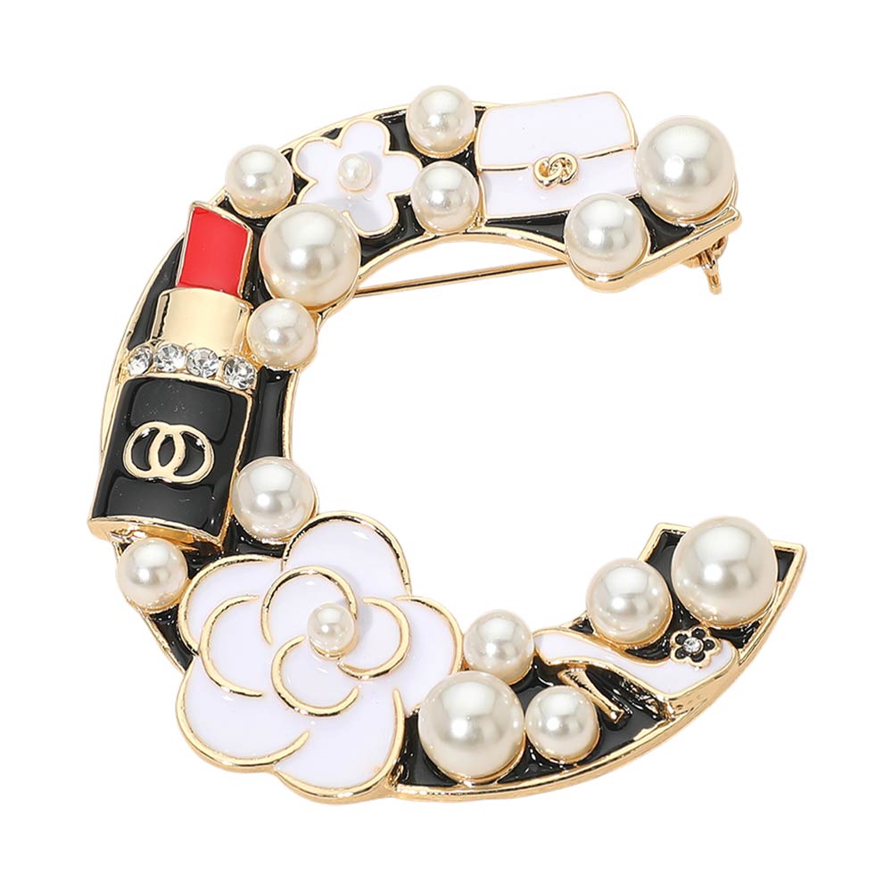This decorative pin brooch features a letter “C” design adorned with pearls, lipstick, and floral embellishments. A playful and chic accessory perfect for personalizing your outfit with a touch of sparkle and charm.