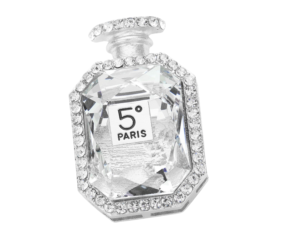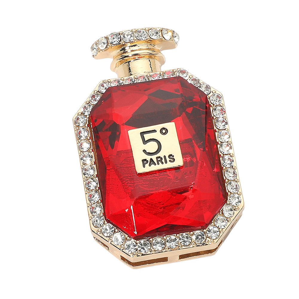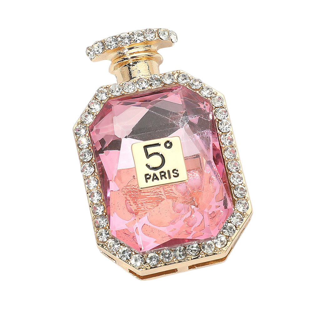 Chic and timeless perfume bottle pin brooch. Features a sparkling rhinestone design that adds a hint of glamour to any outfit or accessory. Perfect for pinning on jackets, scarves, or handbags.