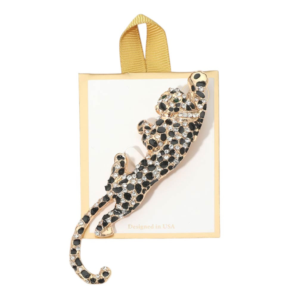 Unleash your wild side with this Rhinestone Embellished Leopard Pin Brooch. Designed with dazzling rhinestones and fierce detailing, this statement piece adds instant sparkle and attitude to any look. Pin it on a blazer, denim jacket, handbag, or hat for a bold finishing touch that stands out in all the right ways.