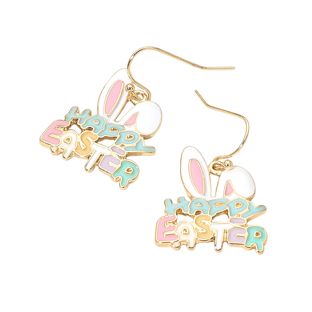 Festive bunny dangle earrings featuring a cheerful “HAPPY EASTER” design. Lightweight with fun movement, they’re perfect for celebrating the holiday or adding a playful seasonal touch to your look.