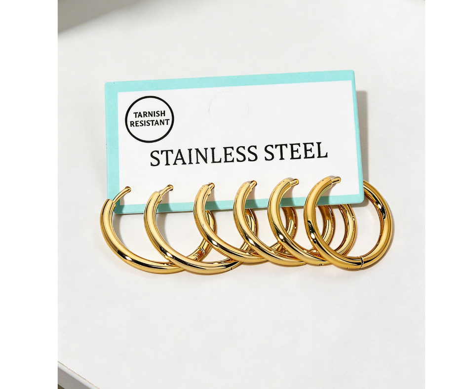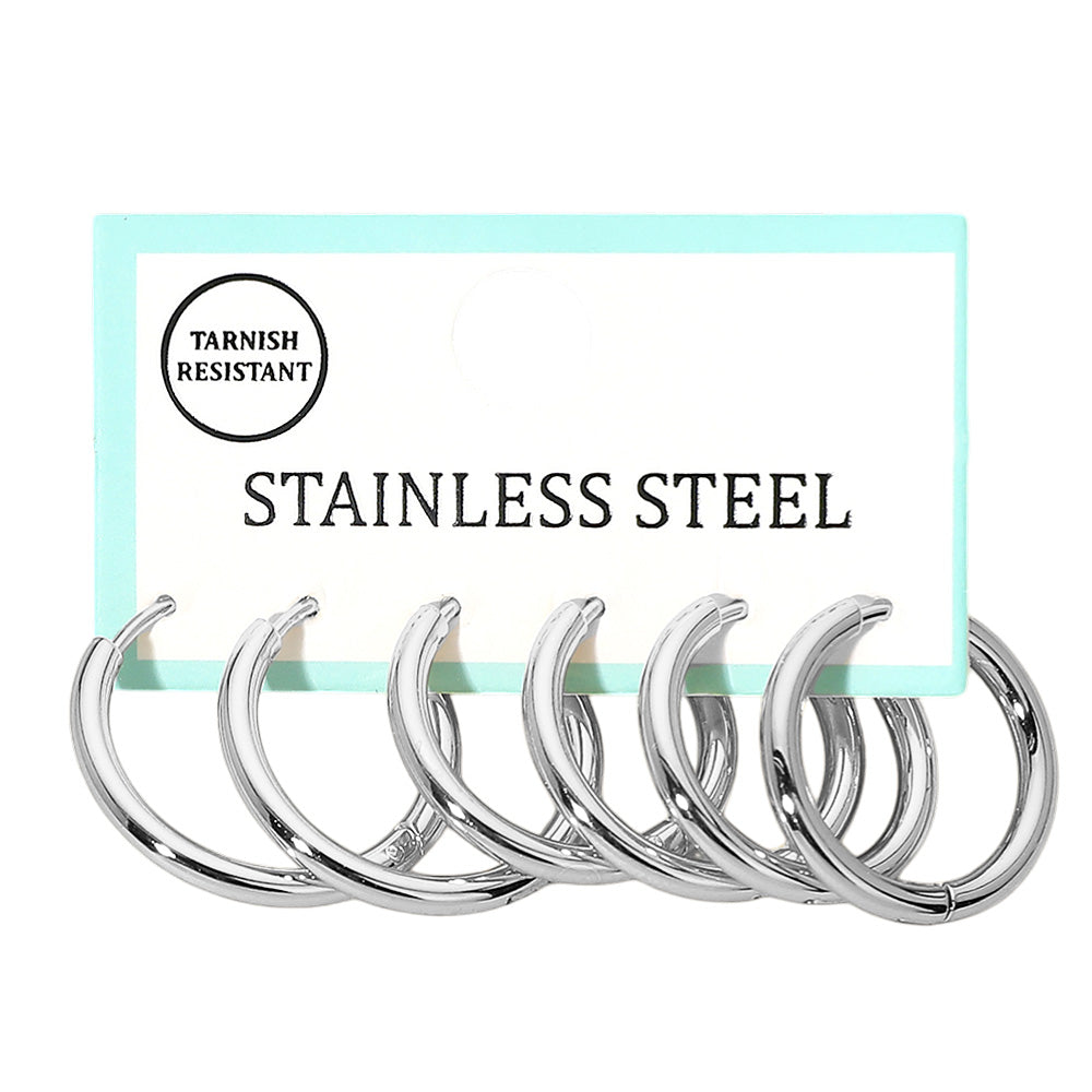 A set of 3 pairs of stainless steel huggie hoop earrings, designed for a sleek and versatile look. Lightweight and durable, they are perfect for everyday wear or layering with other styles. A timeless addition to any jewelry collection.