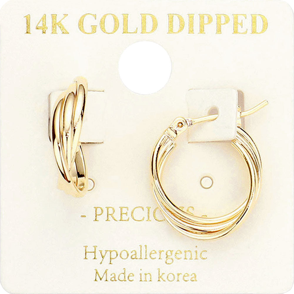 14K Gold Dipped hypoallergenic triple layered pin catch hoop earrings featuring three smooth, lightweight bands joined into one bold hoop. Their layered design gives a clean, modern look while staying comfortable for all-day wear. Also available in white gold dipped.