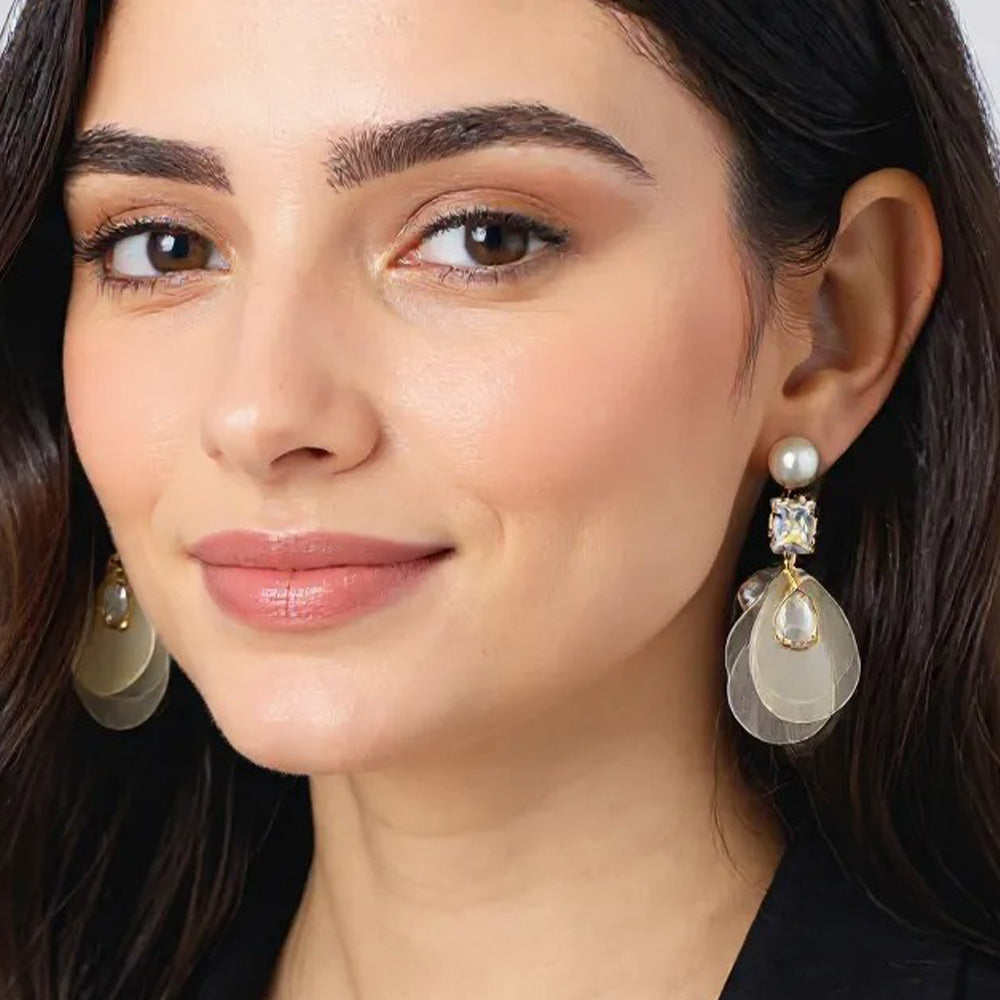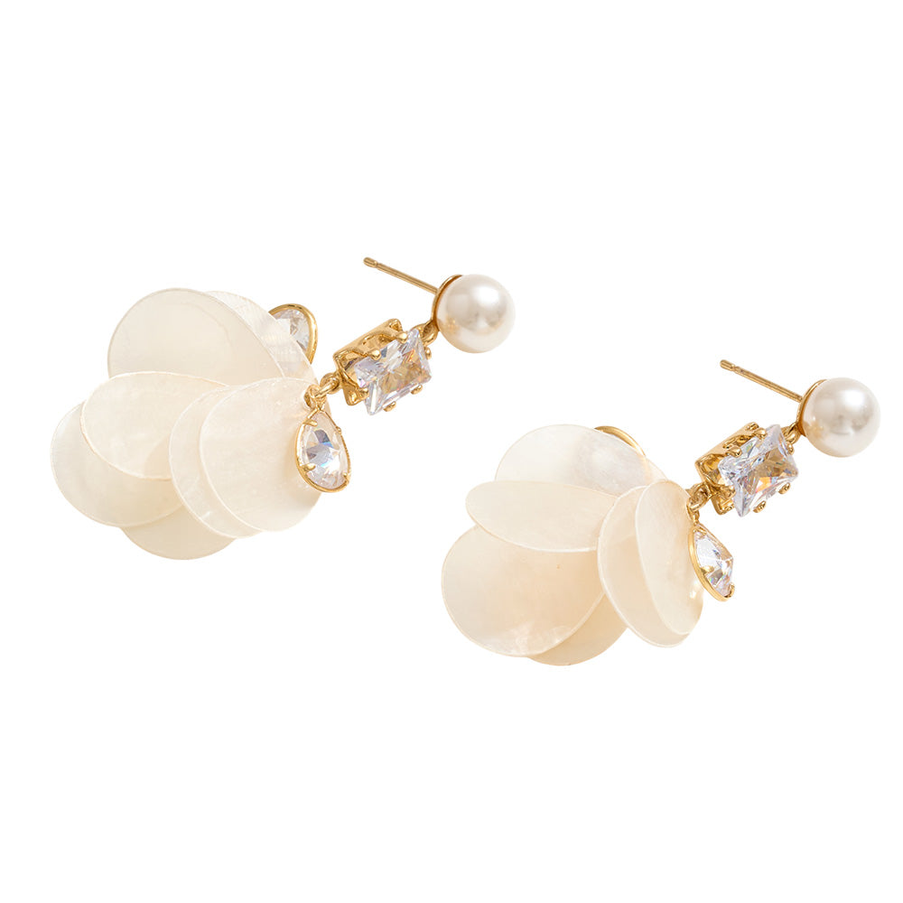 These elegant drop earrings feature cascading mother of pearl shell discs accented with sparkling stone clusters, all dipped in 14K gold. A sophisticated and eye-catching design perfect for dressing up any outfit.