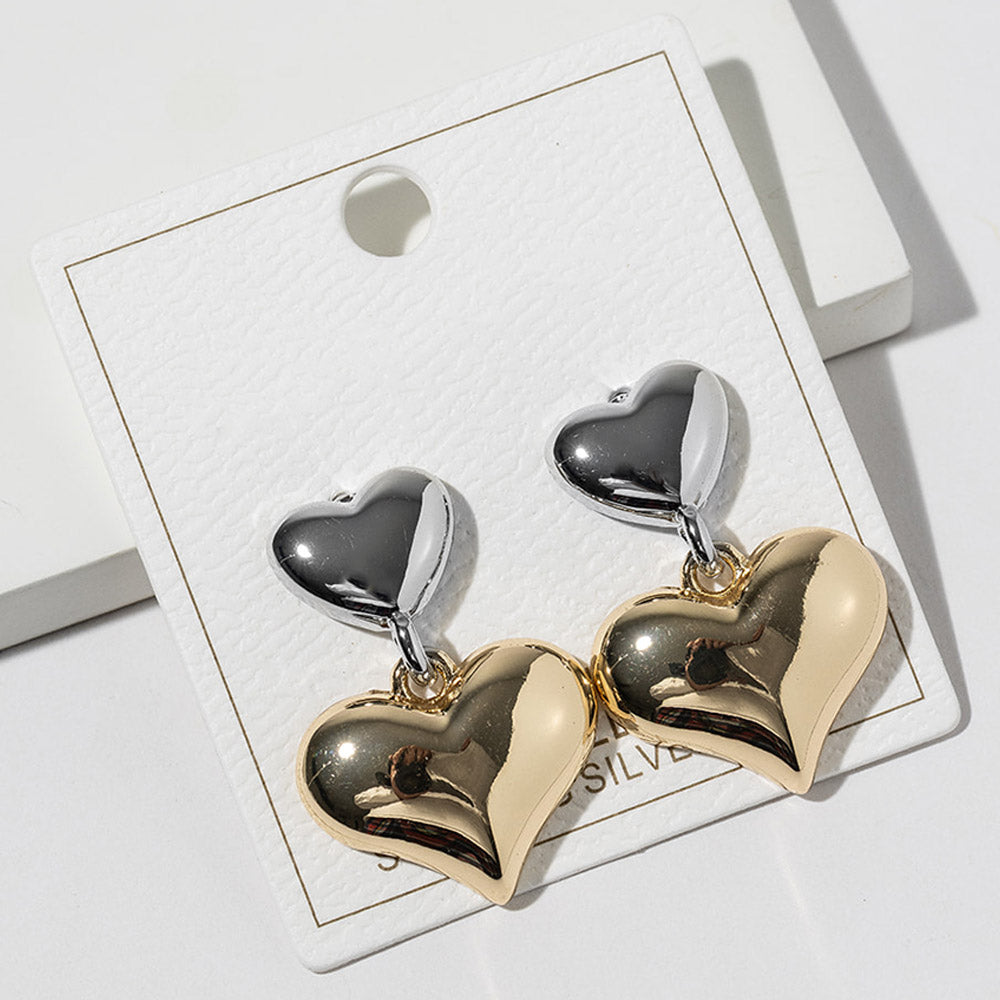 Gold dipped two tone double puffy heart link drop earrings featuring a playful mixed-metal design with soft dimension. Lightweight with gentle movement, they add a charming statement while remaining easy and comfortable to wear.
