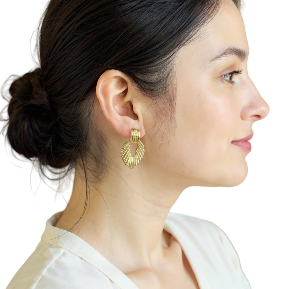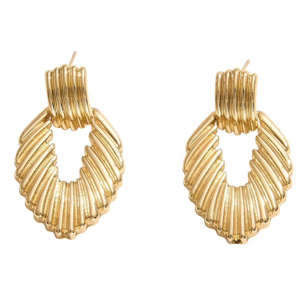 Elegant teardrop doorknocker earrings featuring a ribbed design and dipped in gold for a polished, stylish finish. Lightweight yet eye-catching, they’re perfect for adding a sophisticated touch to any outfit. Also available in white gold dipped.