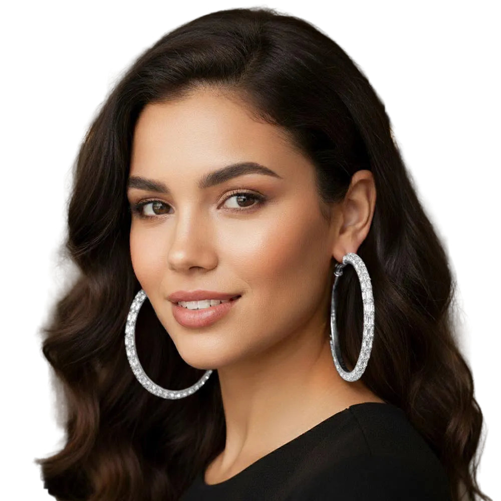 These oversized hoop earrings are accented with baguette-cut rhinestones for a bold, sparkling look. A statement pair that brings standout shine and modern style to any outfit.